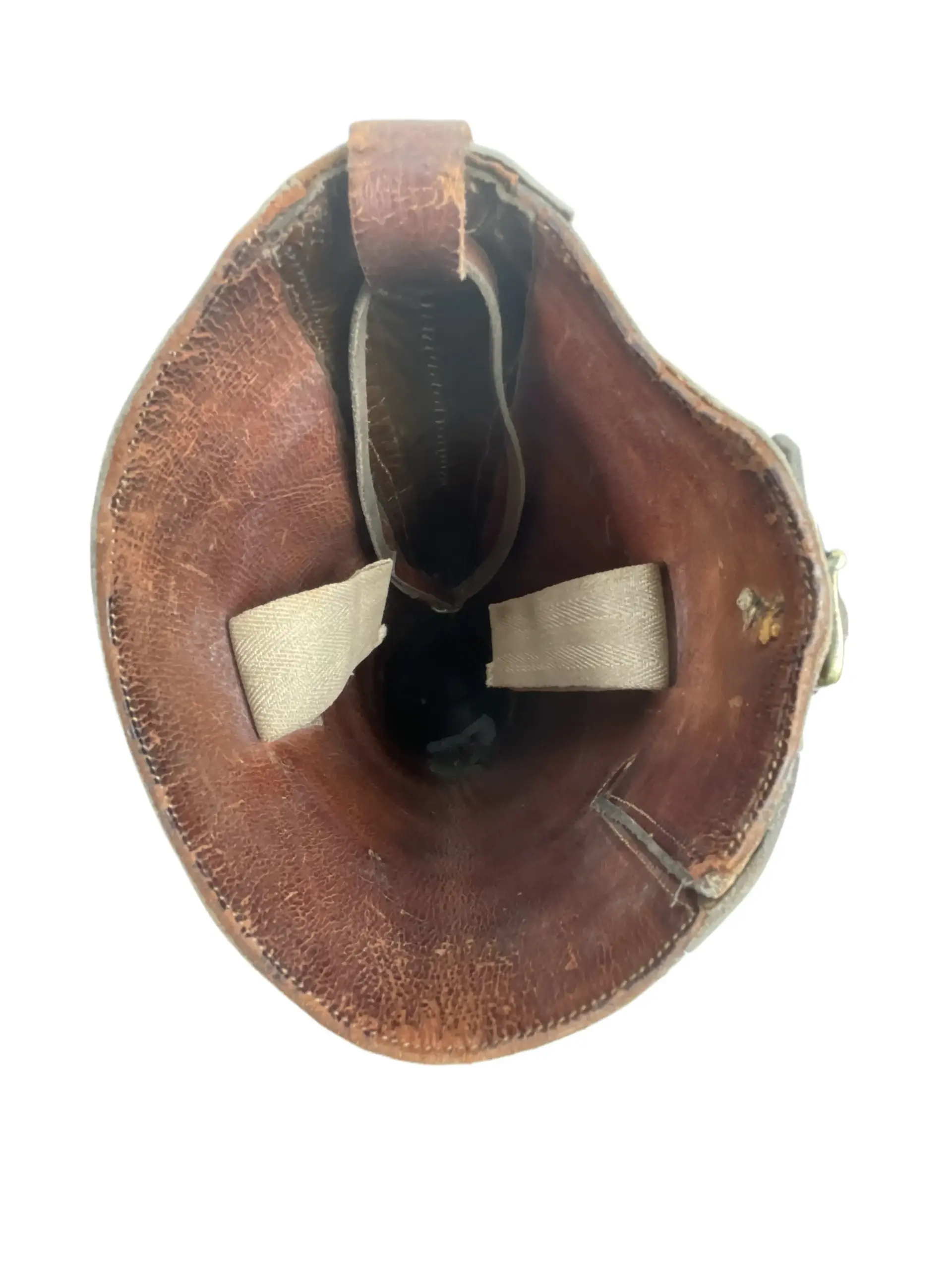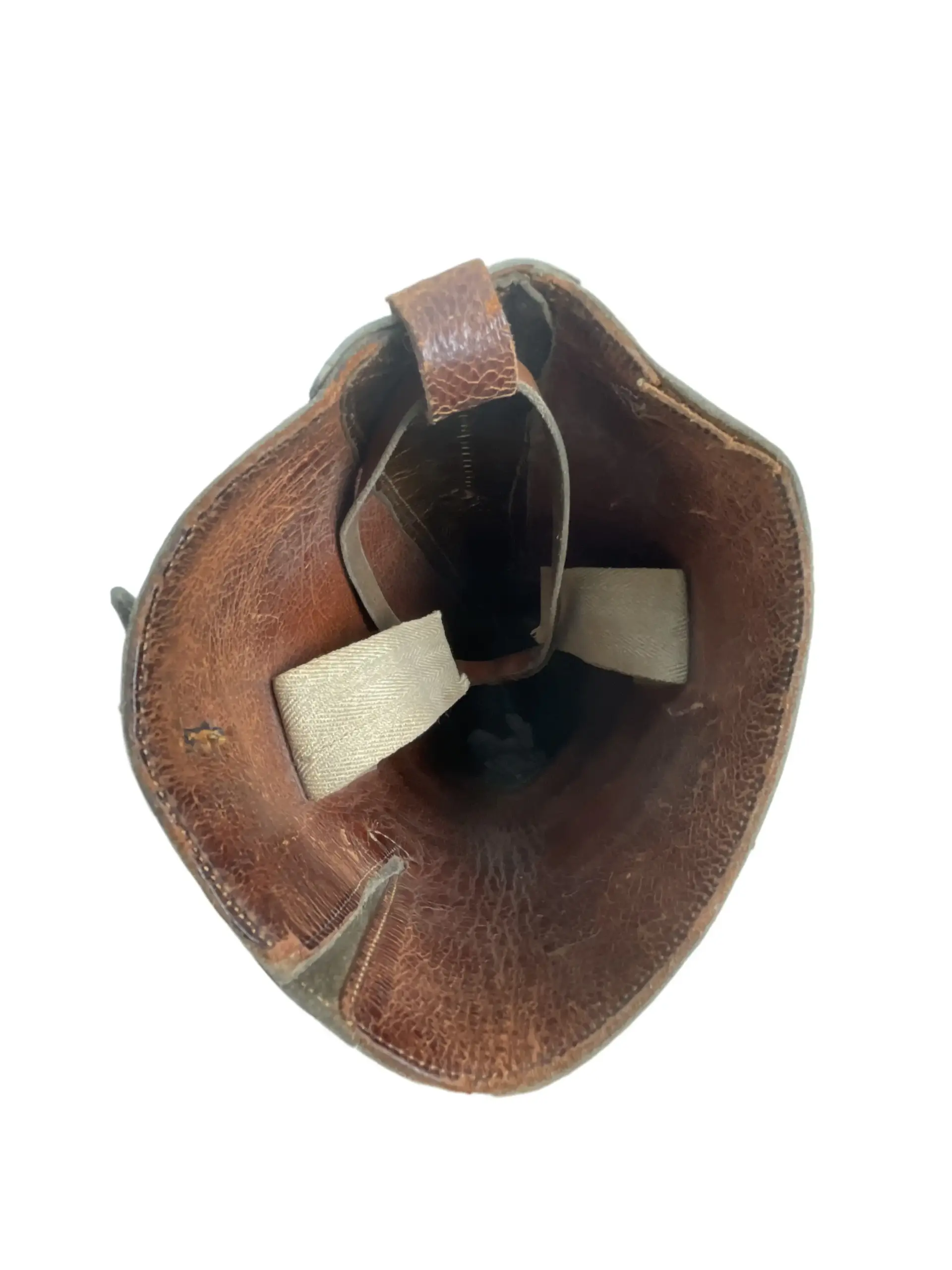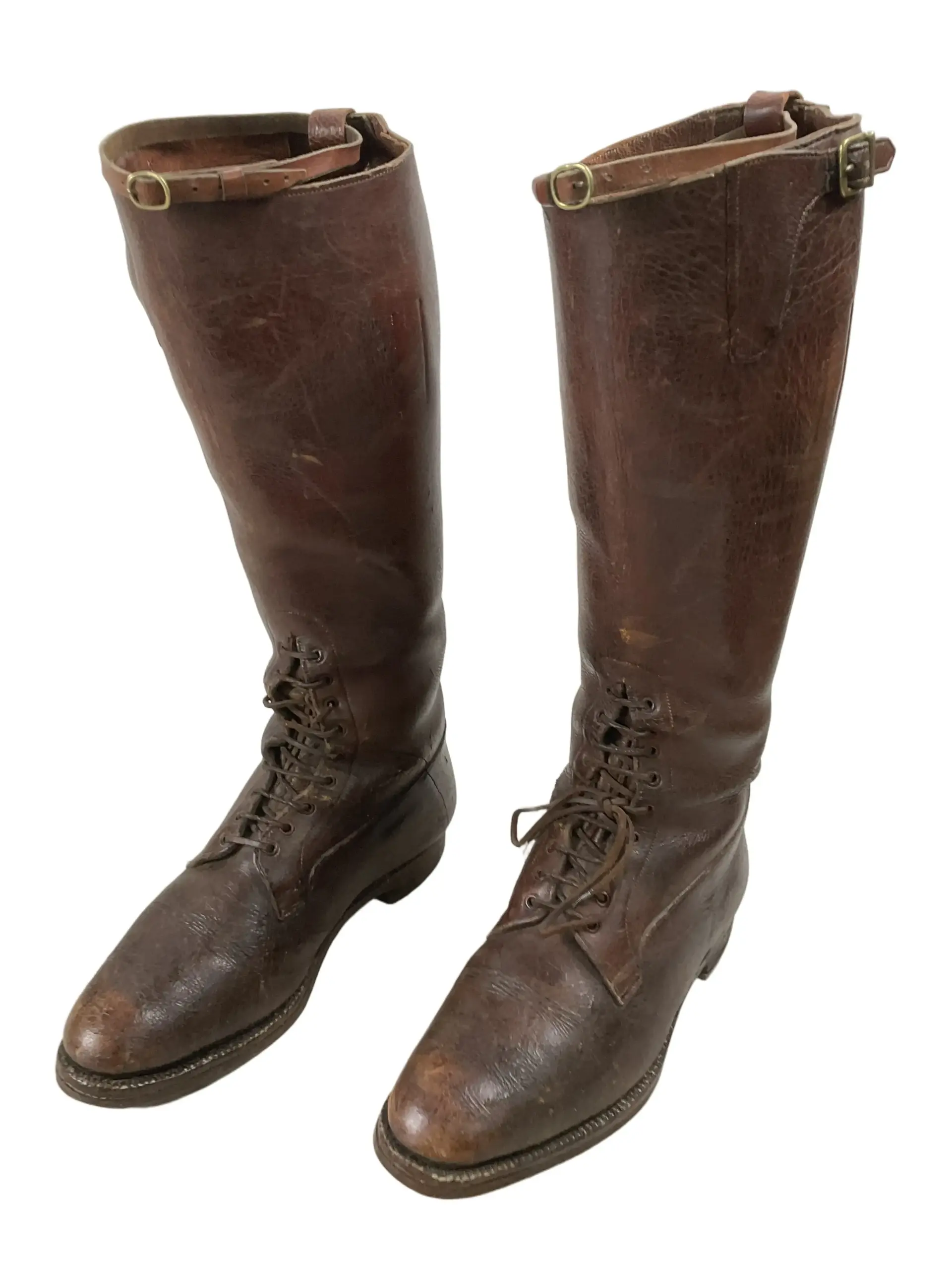 The WW1 Canadian CEF Officer’s Boots are an authentic example of early 20th-century military footwear issued to officers of the Canadian Expeditionary Force during the First World War. Constructed primarily from brown leather, these boots typically feature a high lace-up design intended for both formal appearance and field utility. Distinguishing attributes include reinforced toes and heels, as well as sturdy leather soles, designed to withstand extended periods of marching and varied terrain conditions encountered during military campaigns. The boots generally reach mid-calf and may include brass eyelets or speed hooks for efficient lacing. Officer’s boots often exhibit finer craftsmanship and detailing compared to enlisted personnel’s issue footwear, reflecting both status and the expectation of purchasing private equipment. These boots represent a key element of the CEF officer’s uniform, providing insight into the material culture and dress standards of Canadian forces serving overseas between 1914 and 1918.