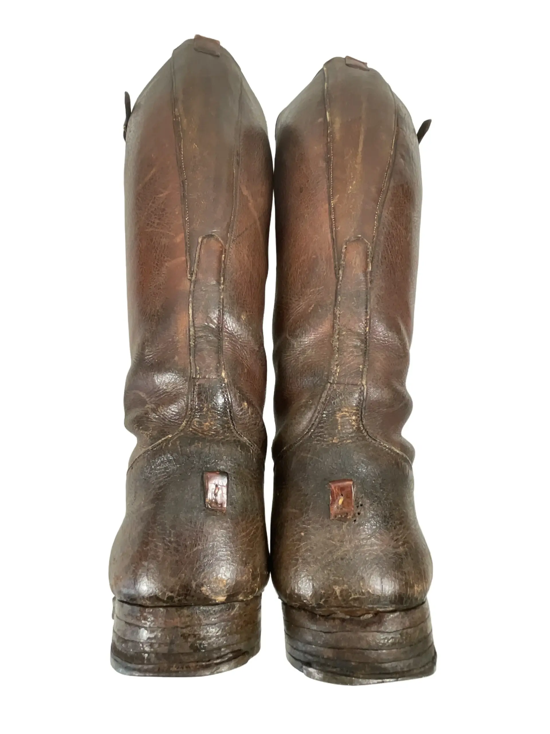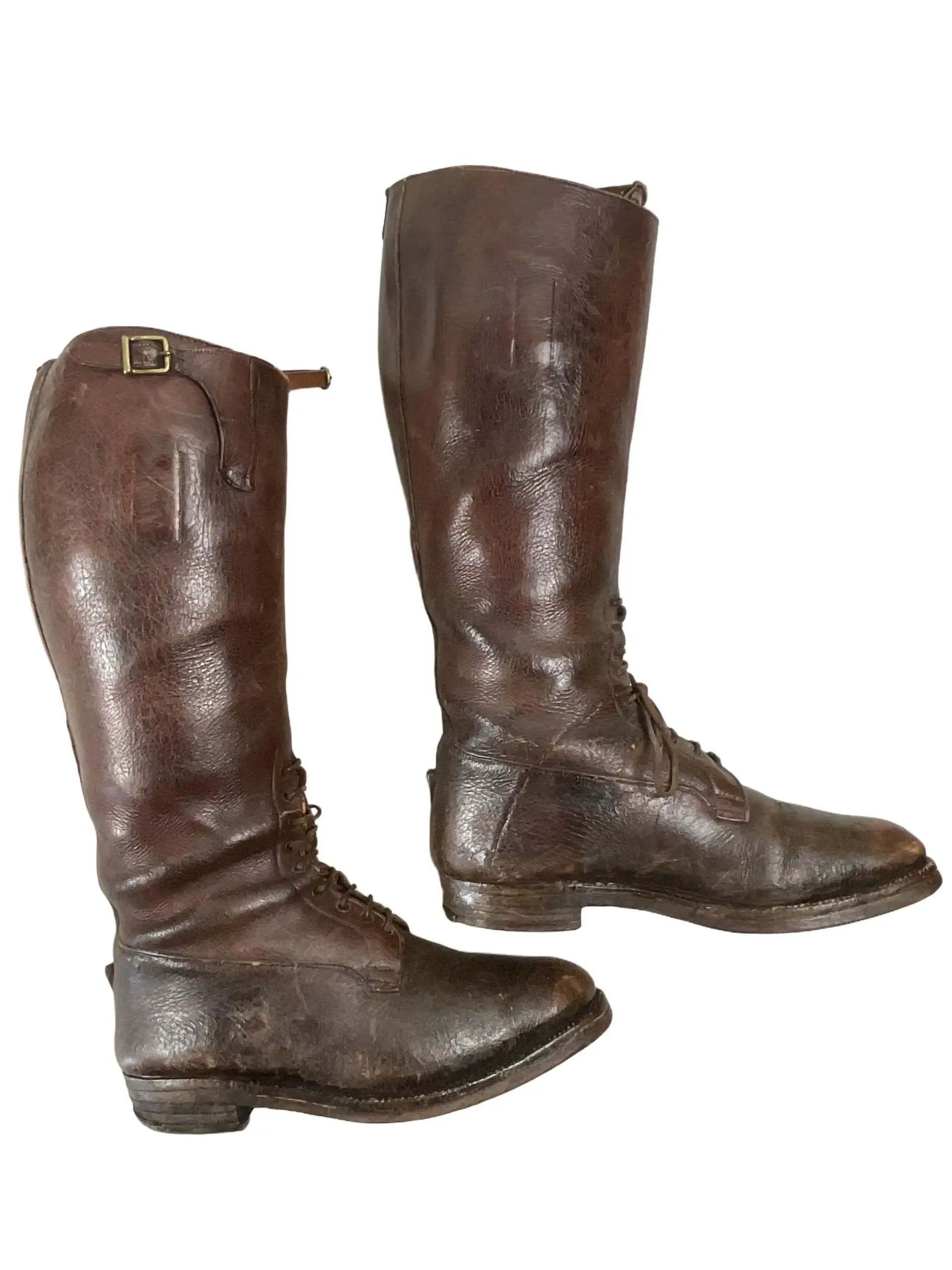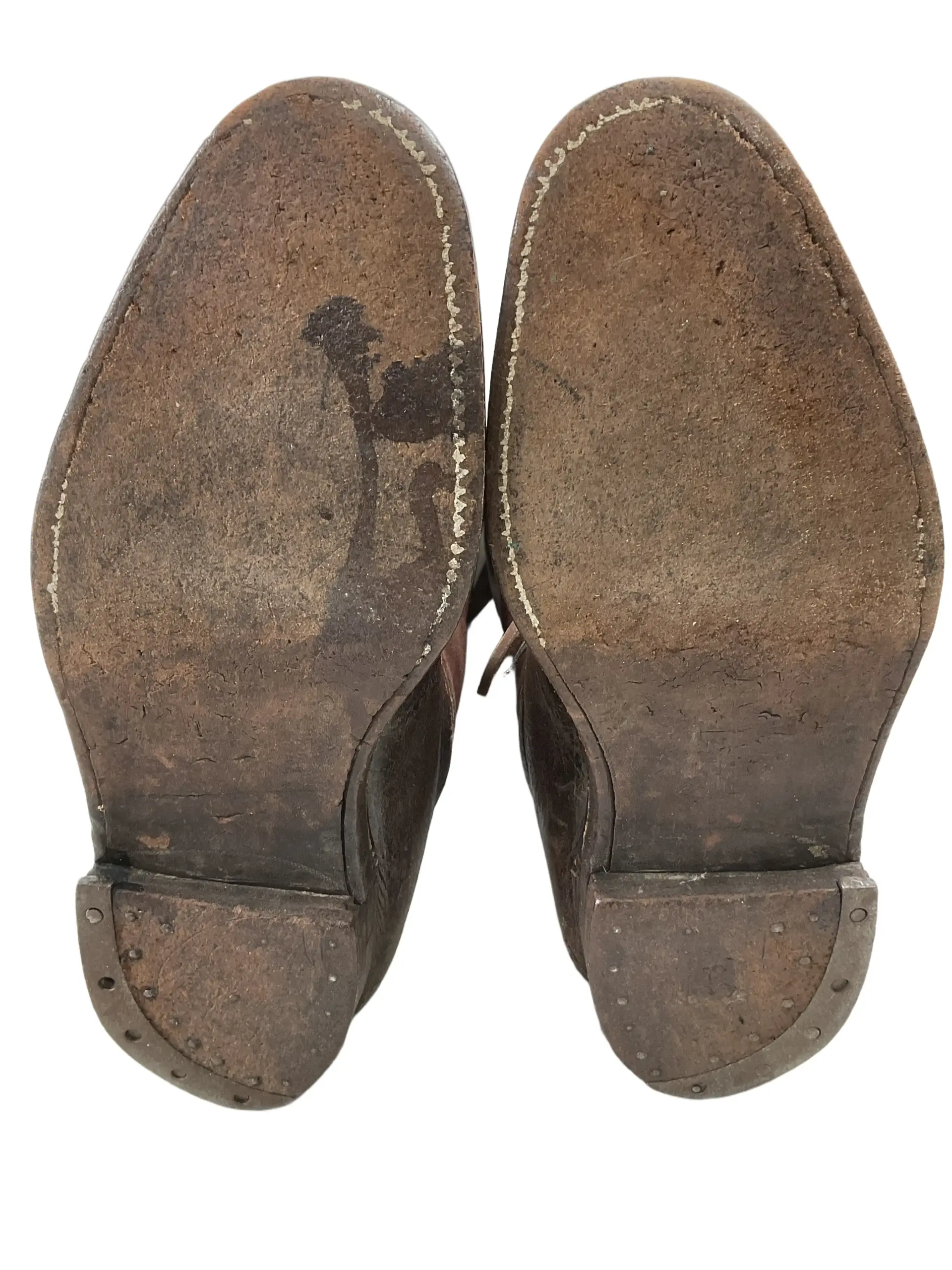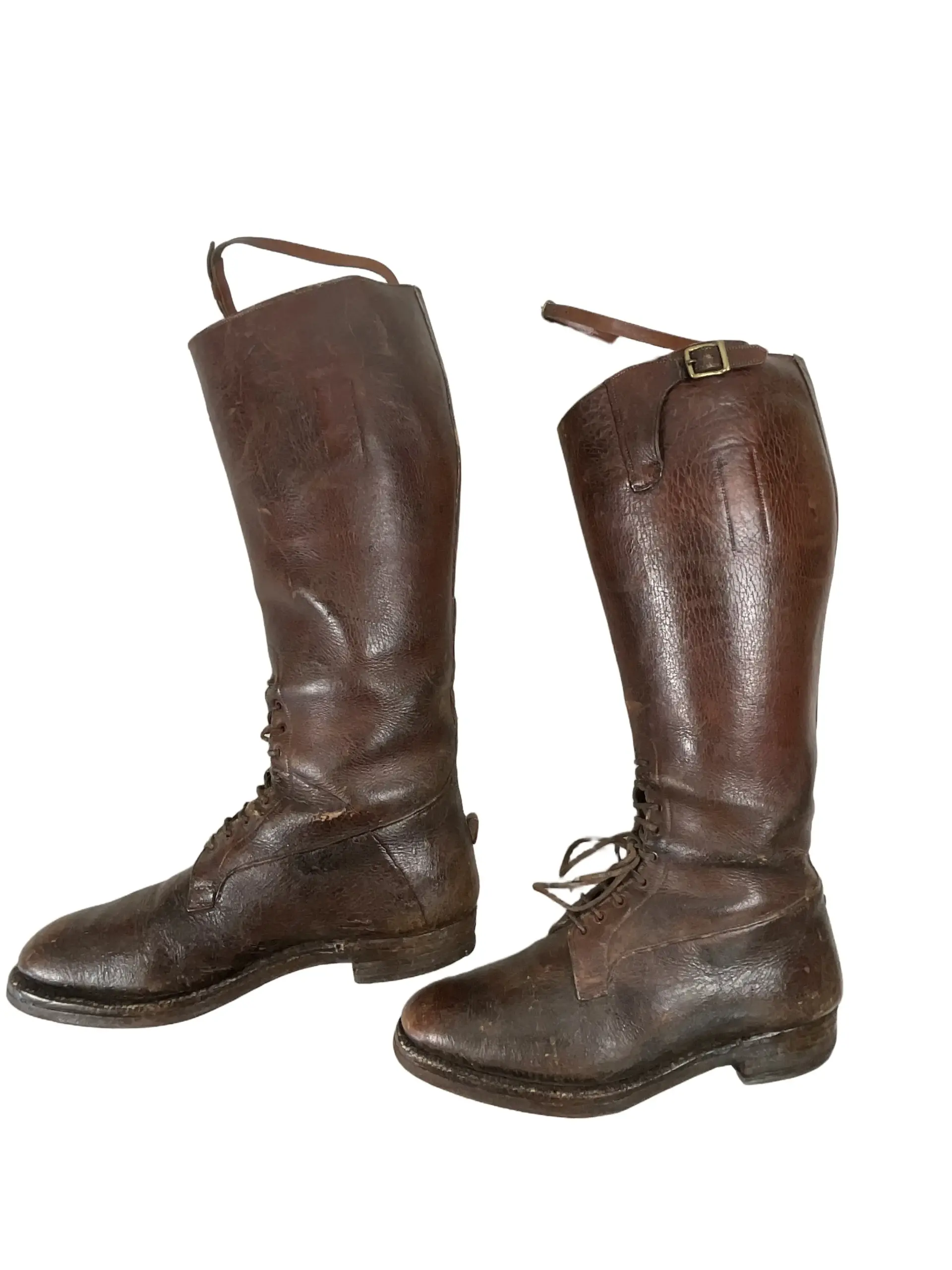 The WW1 Canadian CEF Officer’s Boots are an authentic example of early 20th-century military footwear issued to officers of the Canadian Expeditionary Force during the First World War. Constructed primarily from brown leather, these boots typically feature a high lace-up design intended for both formal appearance and field utility. Distinguishing attributes include reinforced toes and heels, as well as sturdy leather soles, designed to withstand extended periods of marching and varied terrain conditions encountered during military campaigns. The boots generally reach mid-calf and may include brass eyelets or speed hooks for efficient lacing. Officer’s boots often exhibit finer craftsmanship and detailing compared to enlisted personnel’s issue footwear, reflecting both status and the expectation of purchasing private equipment. These boots represent a key element of the CEF officer’s uniform, providing insight into the material culture and dress standards of Canadian forces serving overseas between 1914 and 1918.