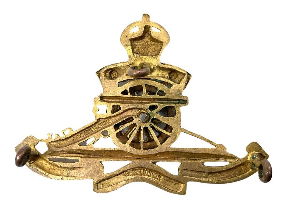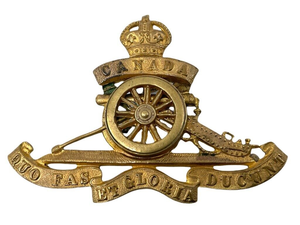 This WW1 Canadian CEF Officers CFA Artillery Cross Belt Pouch Badge is an exquisite and historically significant military artifact. It was used by officers in the Canadian Expeditionary Force’s artillery units during World War I. The badge features a robust design, symbolic of the valor and duties of artillery officers who played crucial roles on the battlefield. Crafted with meticulous attention to detail, the badge is mounted with three lugs for secure attachment to the cross belt pouch, a vital component of an officer’s gear. The intricate insignia reflects the artillery’s heritage and contribution to the war effort, making it a cherished piece for collectors and historians alike. A testament to the bravery and service of Canadian artillery officers, this badge offers a tangible connection to the sacrifices and triumphs of WW1.