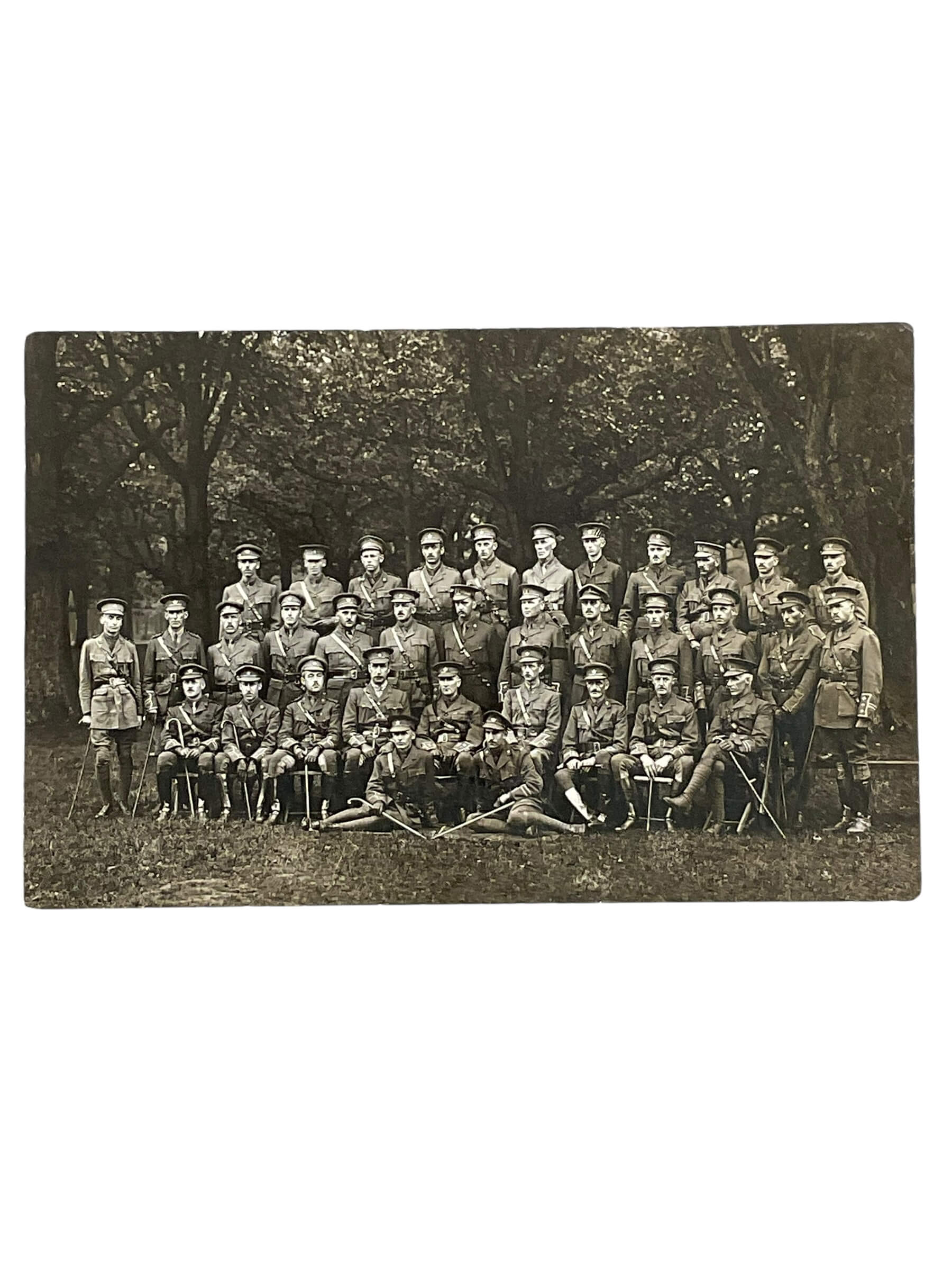 This item is a World War I-era photographic postcard measuring approximately 3 1/2 inches by 5 1/2 inches. The image features officers of the Canadian Expeditionary Force (CEF), the military formation sent by Canada to serve overseas during the First World War. The photograph captures a formal group portrait, typical of the period, with officers in uniform posed either outdoors or in a studio setting. Uniform details such as tunics, service caps, and visible regalia are consistent with Canadian military dress regulations of the 1914–1918 period. The reverse side of the postcard is blank, allowing for correspondence or collection purposes. This type of postcard served both as personal mementos for servicemen and their families, and as historical records of those who served in the conflict. The item reflects the photographic and postal practices of the early twentieth century, as well as the military history of Canada during World War I.