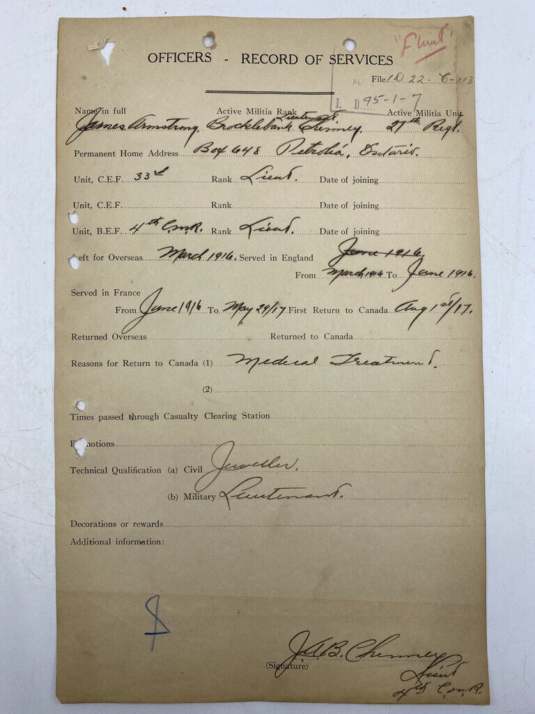 WW1 Canadian CEF Officers Record of Service Lt 4th CMR