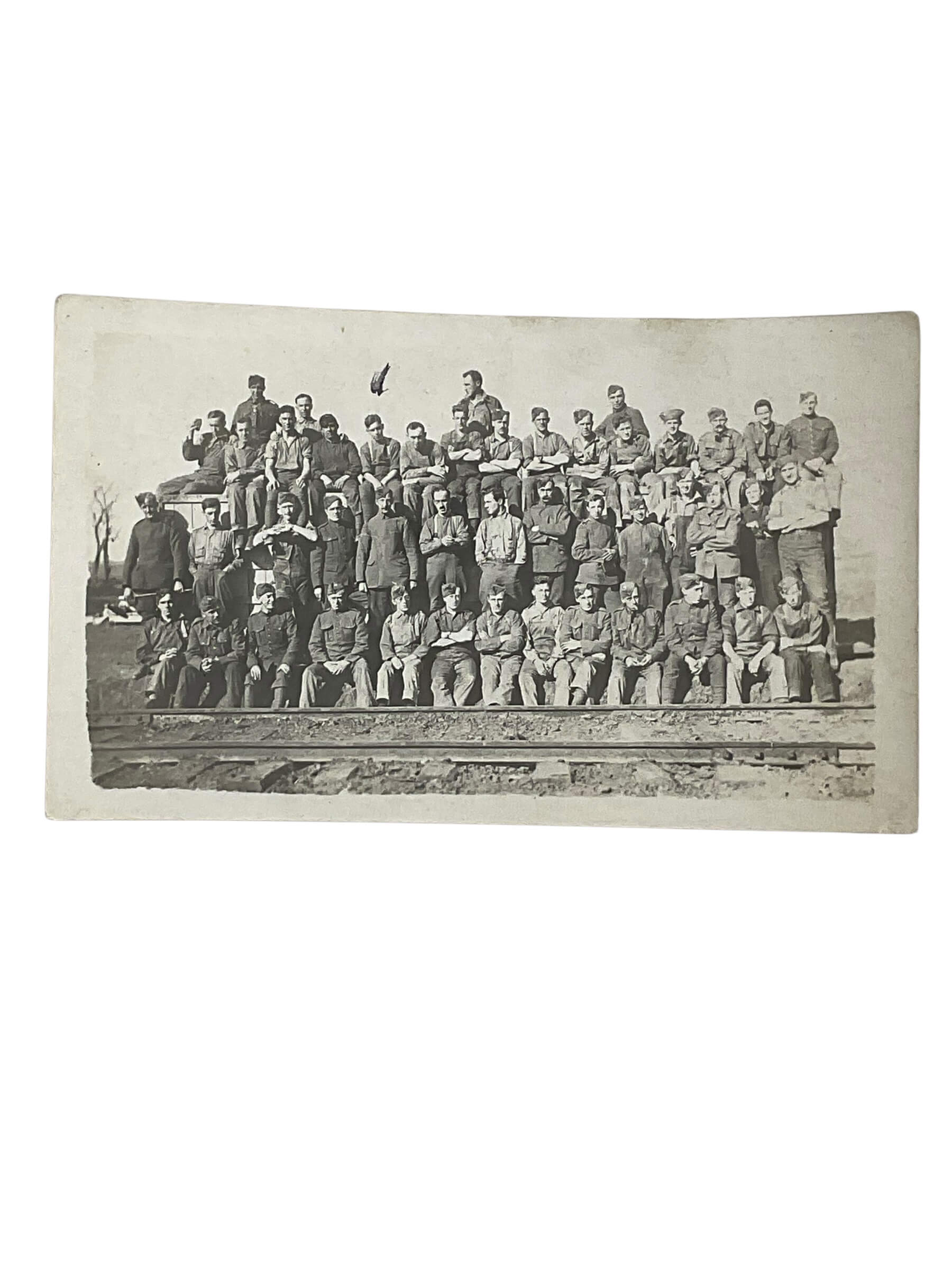 This original World War I-era photograph measures approximately 2 1/2 inches by 4 inches and features a group portrait of Canadian Expeditionary Force (CEF) personnel affiliated with the Royal Flying Corps (RFC). The image depicts uniformed servicemen posed together, representative of the collaboration between Canadian forces and British military aviation during the Great War. The photograph’s dimensions and monochrome format are consistent with period photographic processes and personal mementoes common among service members. Such group photographs provided records of squadron members and served both as keepsakes and as documentation of units. The Canadian CEF played a significant role within the broader RFC operations, contributing personnel to Britain’s air services before the formation of the Royal Air Force in 1918. This item offers visual documentation of the individuals and dress associated with Canada’s early military aviation efforts. The photograph is unframed and presents normal period wear, with no annotations or dates visible on the obverse or reverse.