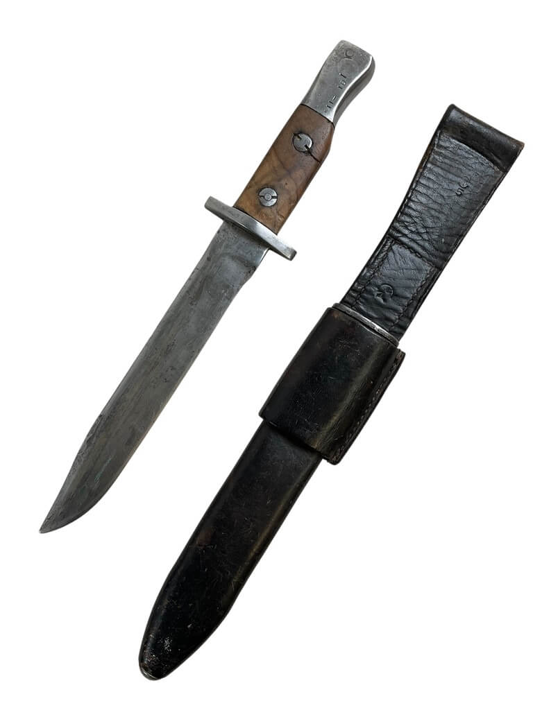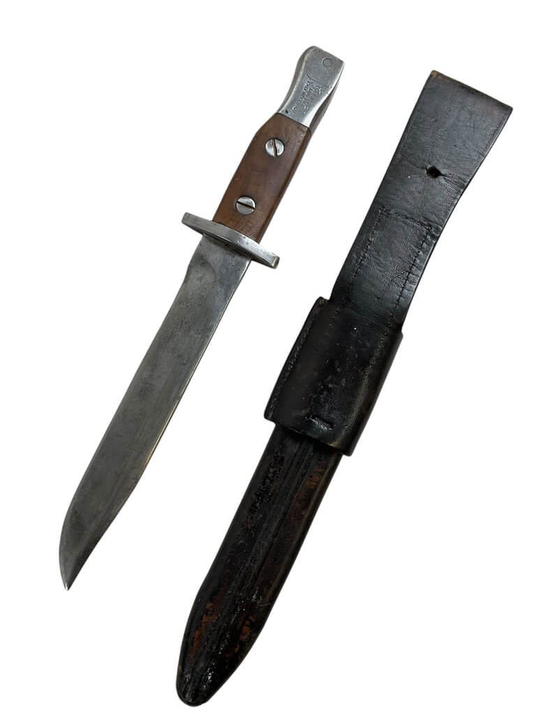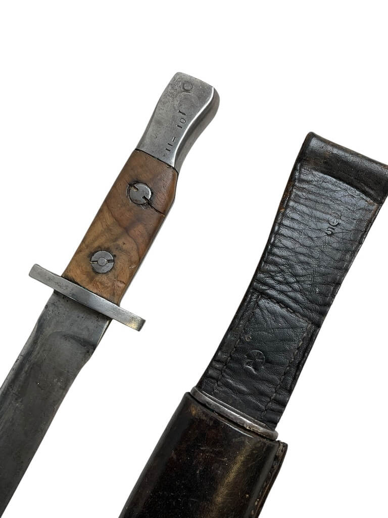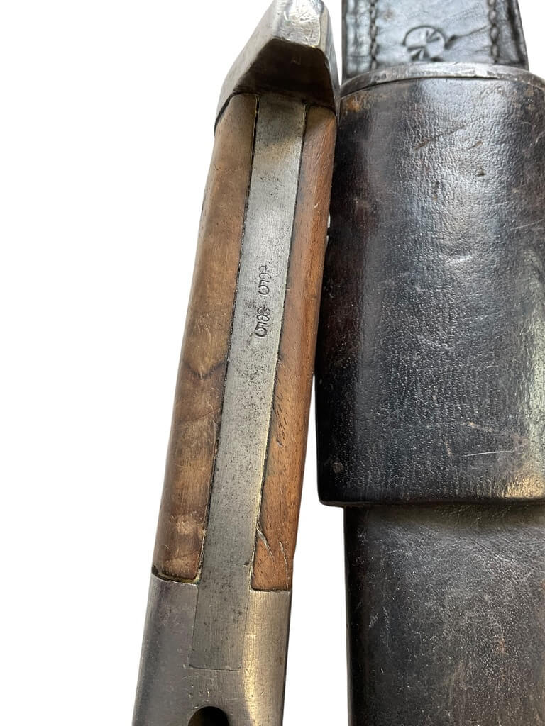This is an authentic WW1 Canadian CEF Ross Rifle Bayonet, a historical artifact that showcases the military history of Canada during the First World War. The Ross Rifle Bayonet was the primary weapon used by the Canadian Expeditionary Force, renowned for its sharpness and durability. This particular piece comes with its original scabbard and frog, adding to its historical significance. The scabbard, designed to protect the bayonet, showcases intricate detail and craftsmanship of the era. Accompanying it is the frog, a holder used to fasten the bayonet to a belt or satchel, equally well-preserved. The entire set is a testament to the courage and resilience of the Canadian forces during WW1. This artifact is an excellent addition to any military memorabilia collection or for those interested in Canadian history.