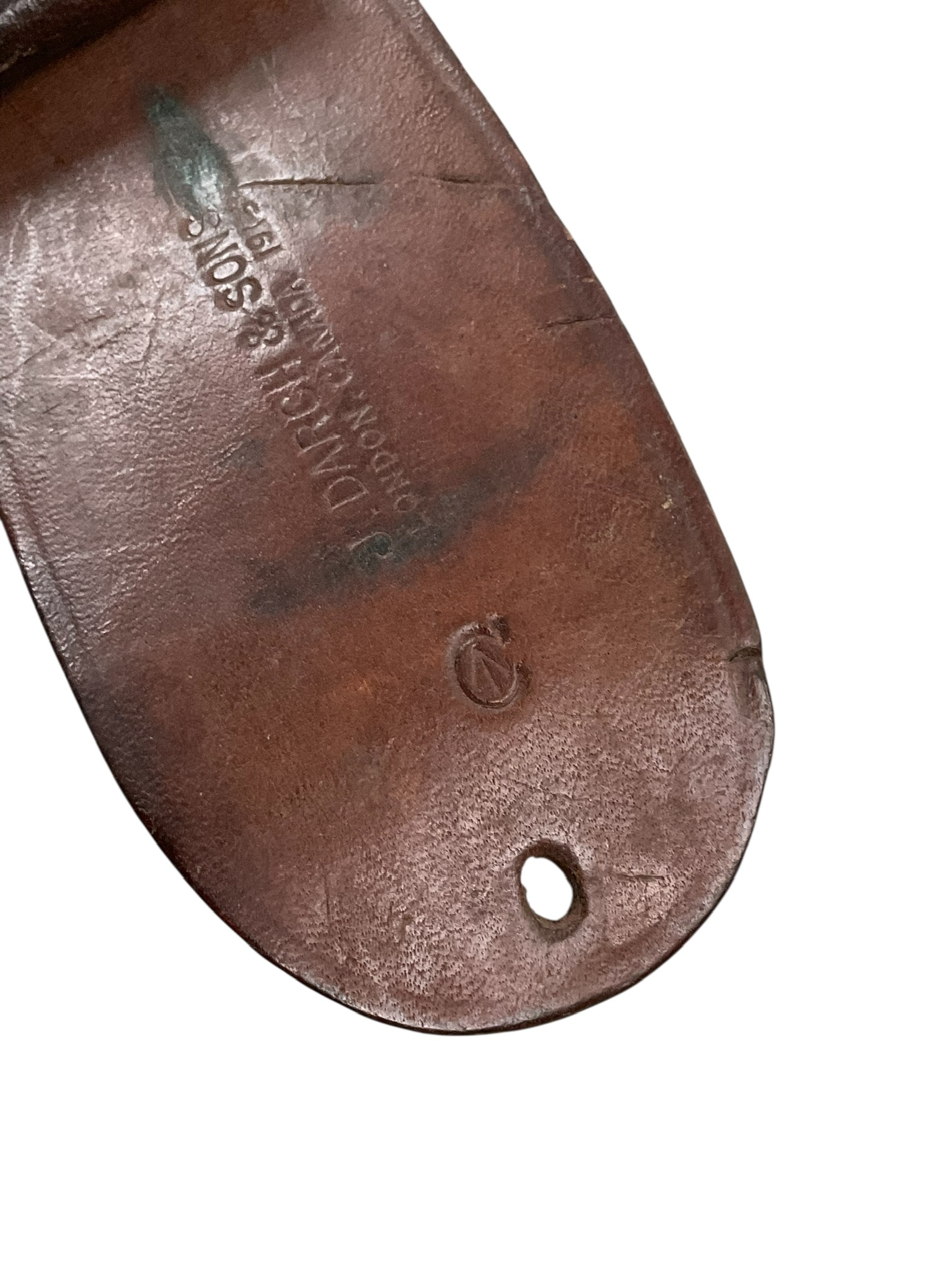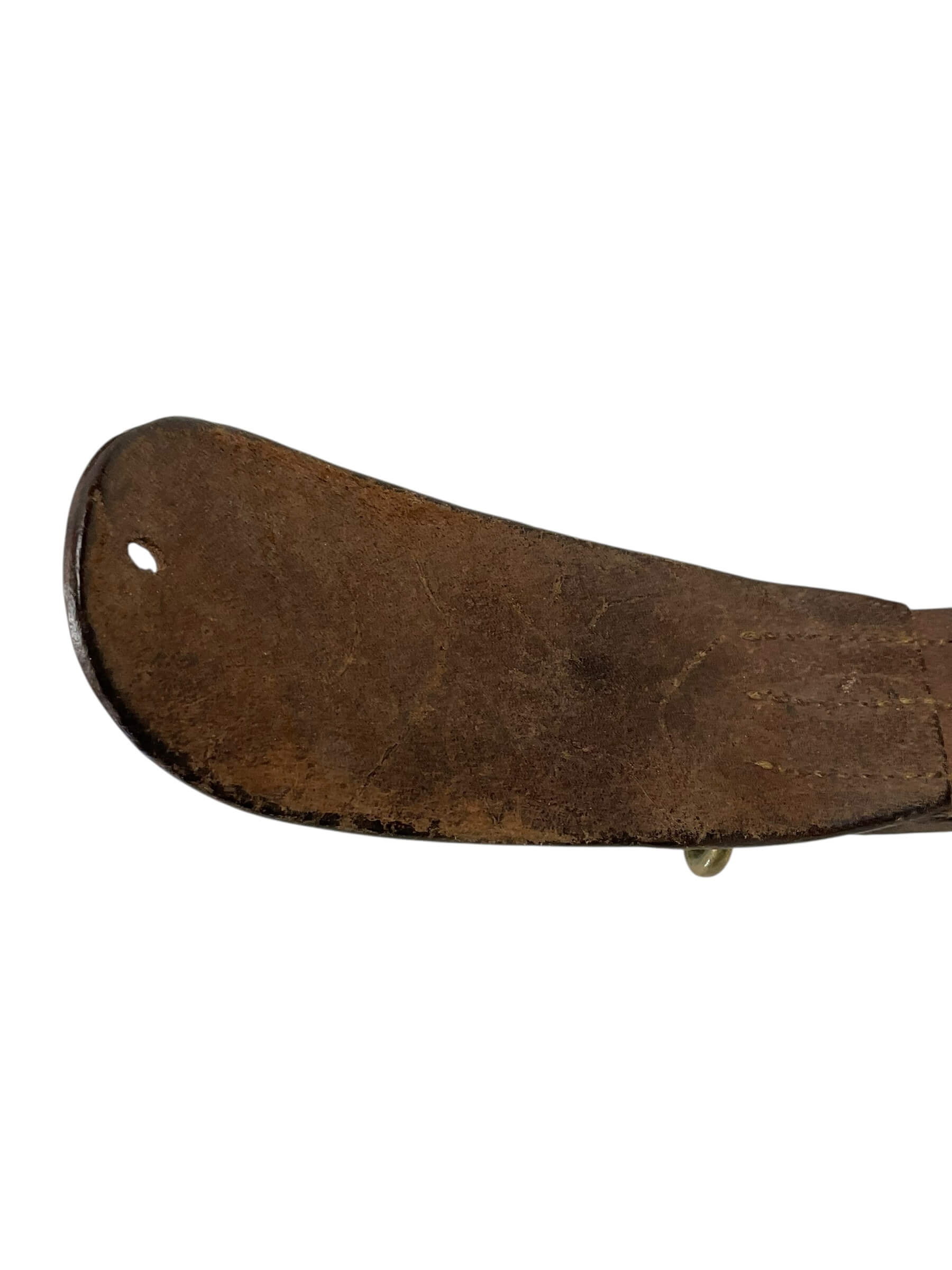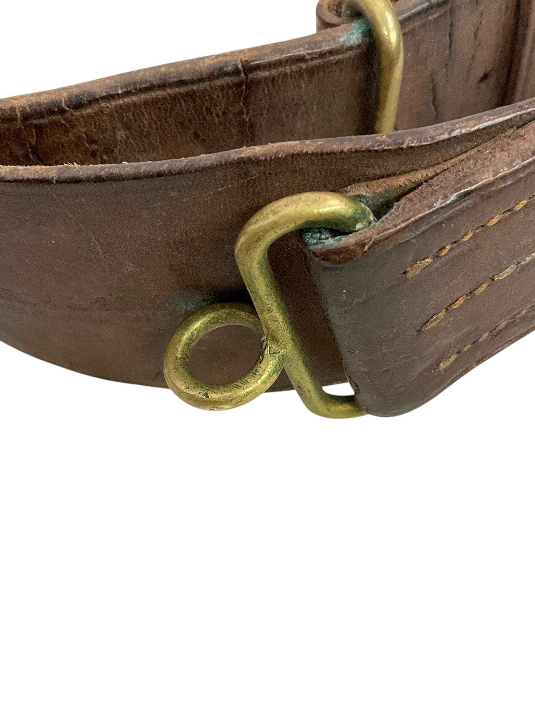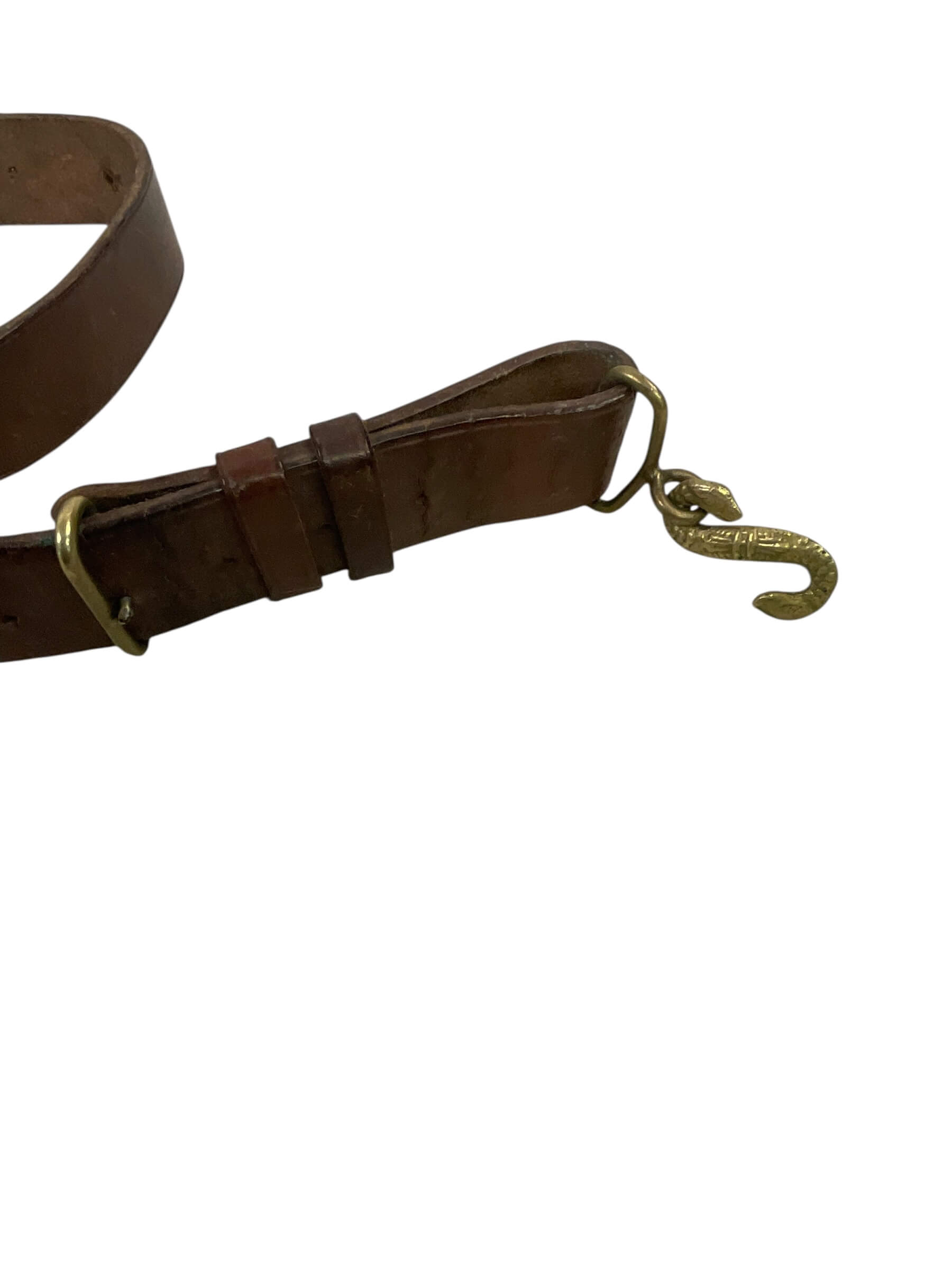 The WW1 Canadian CEF Snake Belt Dated 1915 C Broad Arrowed is a military waist belt issued to members of the Canadian Expeditionary Force during the First World War. Constructed from woven khaki webbing, the belt features a distinctive brass “snake” buckle, named for its serpentine shape that allows for quick fastening and adjustment. The belt is stamped with the date “1915,” indicating its year of production, and bears the Canadian broad arrow marking, a government property symbol used to denote official military equipment. Such belts were part of the standard issue for Canadian soldiers and served both functional and regulatory purposes, securing other pieces of equipment such as ammunition pouches or bayonet frogs. Surviving examples offer insight into Canadian military uniform standards of the period and are representative of early 20th-century webbing equipment used by Commonwealth forces during the war.
