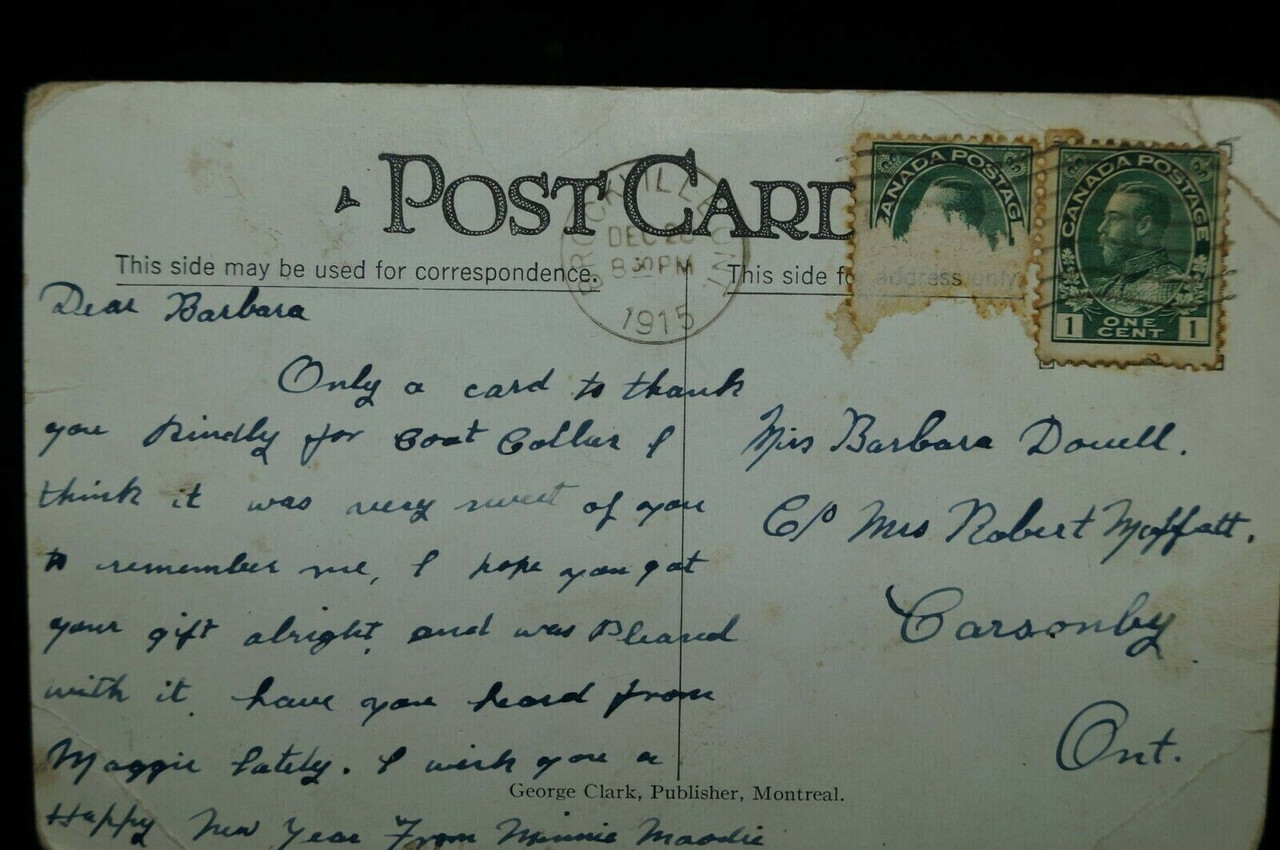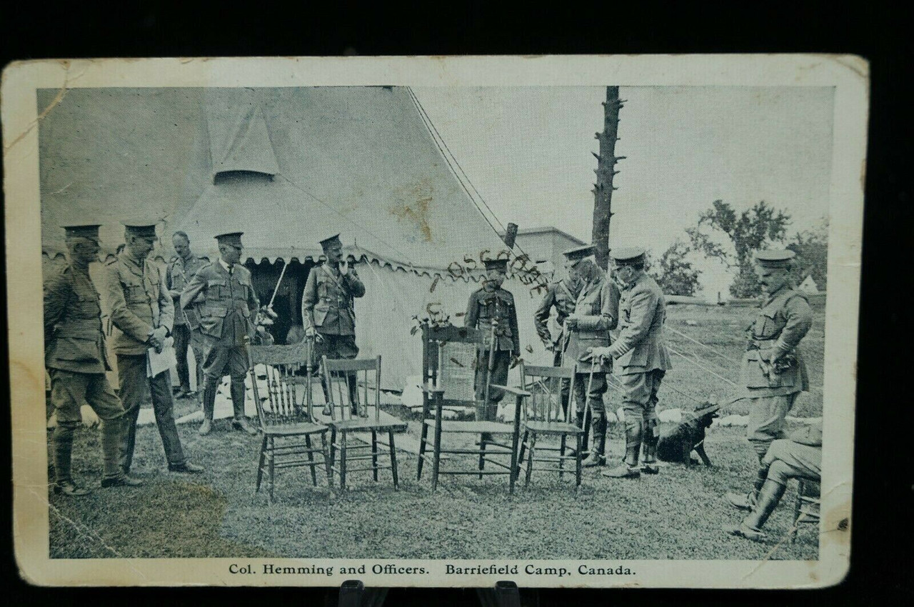 This unique WW1 Canadian CEF Souvenir Paper Postcard features Colonel Hemming and his officers at the Barriefield Camp in Canada. With an intriguing historical context, this postcard captures a moment from a significant training period during the First World War. The front of the postcard displays a photograph of Col. Hemming alongside his fellow officers, offering a glimpse into the camaraderie and leadership within the Canadian Expeditionary Force. The reverse side of the postcard is adorned with a lengthy inscription, providing a personal touch and narrative that enhances its historical value. Additionally, two cancelled stamps on the back add to its authenticity and charm. This collectible item is in good condition, making it a rare and valuable piece for collectors and history enthusiasts. It offers a tangible connection to the past, preserving the memories and stories of those who served during one of the most pivotal times in history.