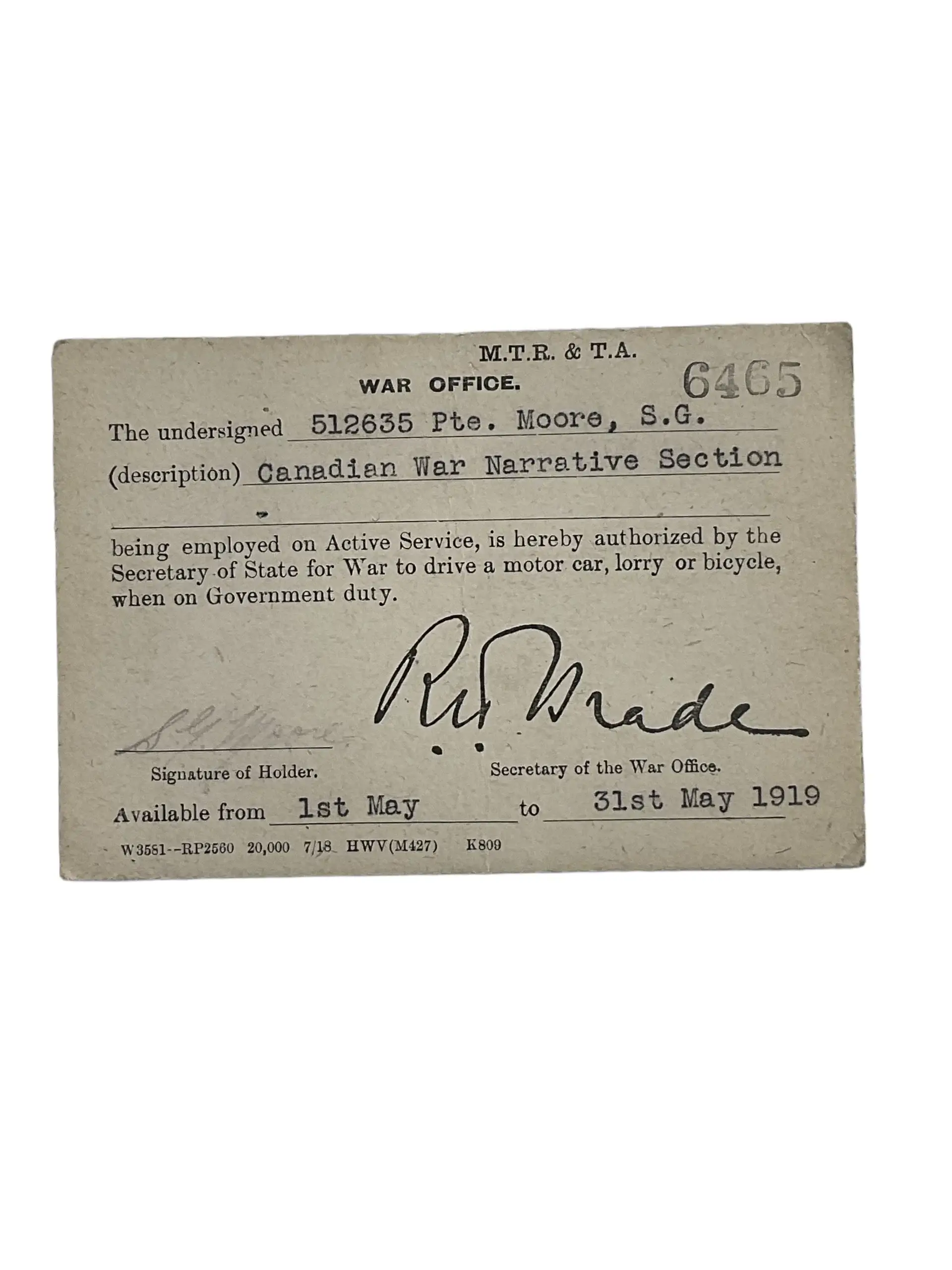 The WW1 Canadian CEF War Narrative Section Pass is an original artifact issued during the First World War by the Canadian Expeditionary Force. This pass, typically made from card or sturdy paper, granted authorized personnel access to specific military sections involved in compiling official war records and narratives. The War Narrative Section was responsible for documenting operations, collecting firsthand accounts, and producing reports that contributed to the official history of Canadian military involvement. Passes of this type were issued to ensure security and regulate the movement of both military staff and civilian correspondents within operational areas or administrative offices. Items may display handwritten or stamped details, issuance dates, and official signatures for authentication purposes. Surviving examples illustrate wartime administrative practices and offer insights into the logistical measures implemented to protect sensitive information and manage personnel during major conflicts. Such passes are valued for their connection to military documentation efforts in the First World War.
