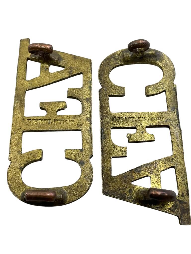 This product features a pair of WW1 Canadian Field Artillery (CFA) Shoulder Titles Insignia, a unique piece of military memorabilia. These authentic badges were worn by soldiers of the CFA during the First World War. Each insignia is made of brass and features the letters ‘CFA’ in an elegant design, signifying the wearer’s affiliation with the Canadian Field Artillery. They were used to identify the rank and unit of the soldiers. These shoulder titles serve as a historical artifact, offering a glimpse into the past and the brave individuals who served in the war. They are an excellent addition to any military memorabilia collection, or for anyone interested in world history or Canadian heritage. Please note, due to their age, they may show signs of wear, but this only adds to their authenticity and charm.