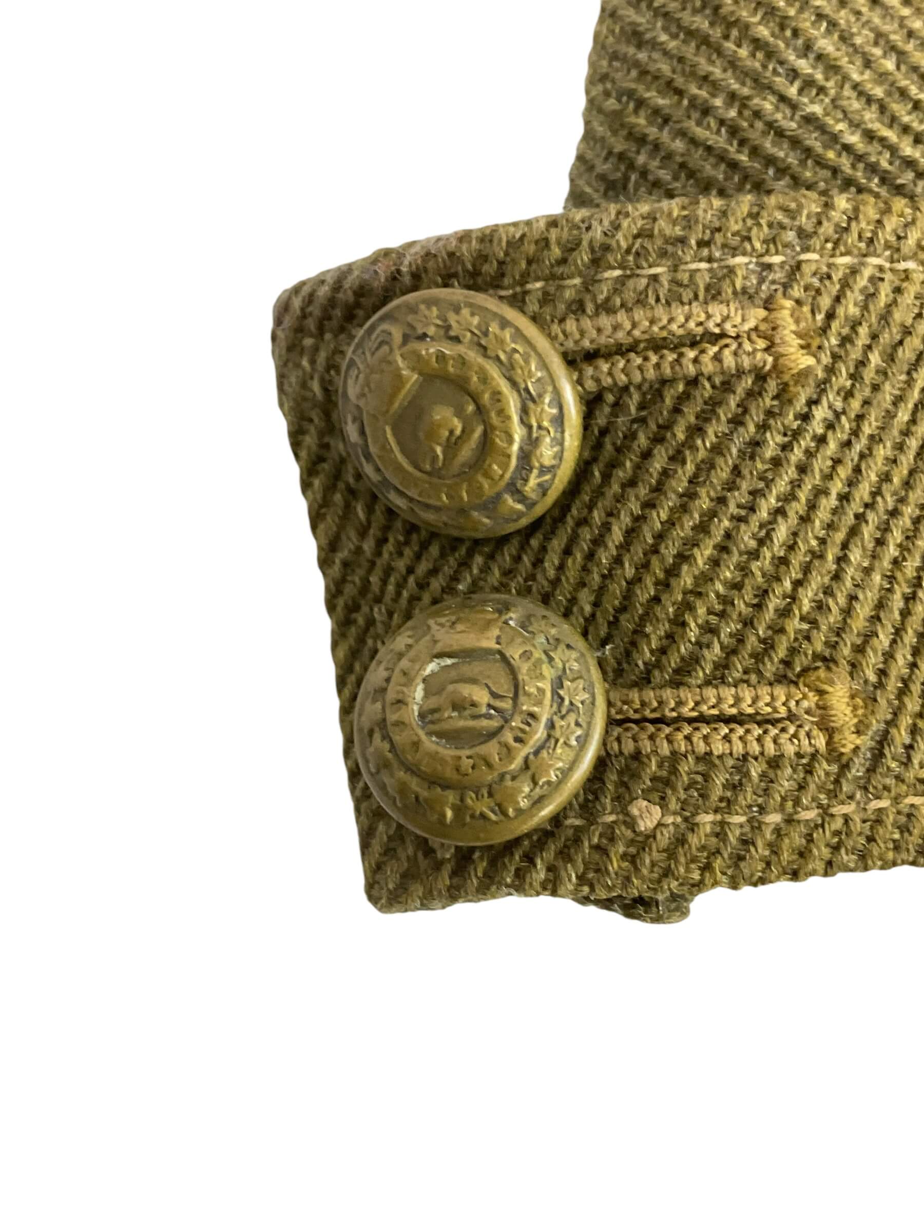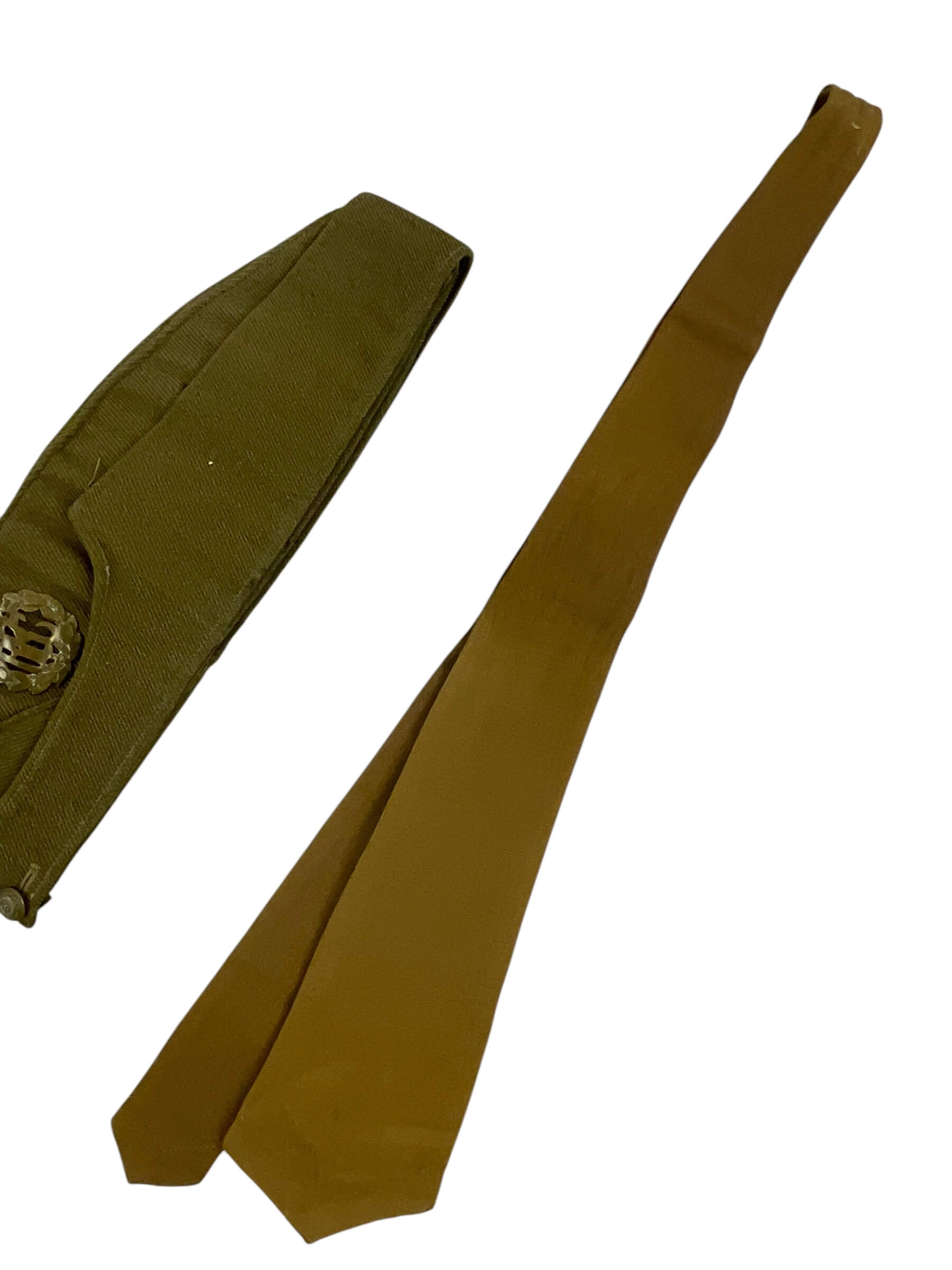 This item is a WW1 Canadian RFC Officers Wedge Cap with Tie, an authentic piece of military history that embodies the bravery and spirit of the Royal Flying Corps officers during World War I. The cap, often known as a ‘fore-and-aft’ cap, is designed in a unique wedge shape, reflecting the classic style of the early 20th century military headgear. It is made of sturdy khaki material, weathered by time yet still in good condition. The cap is accompanied by a matching tie, completing the officer’s uniform look. The cap and tie both feature the RFC insignia, a powerful symbol of the Canadian forces’ contribution to the war effort. This set offers a tangible connection to Canada’s past and is a must-have for any military history enthusiast or collector.
