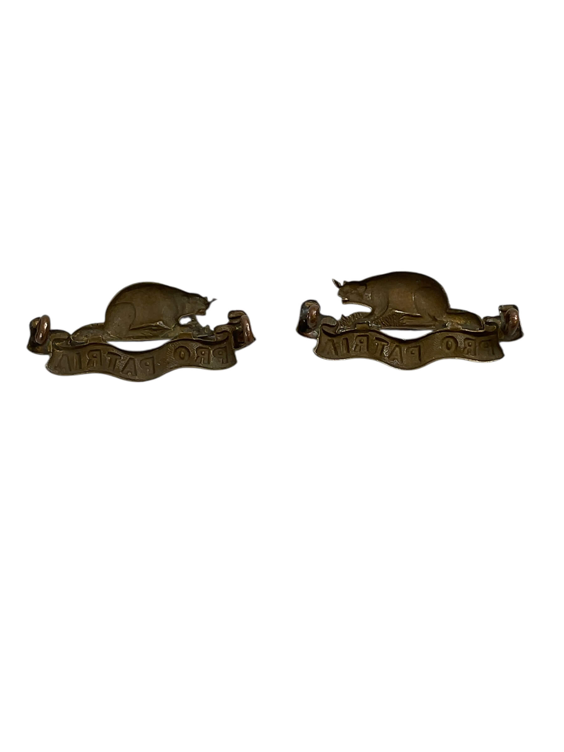 This product is a pair of WW1 CEF Royal Canadian Regiment Collar Insignia. These authentic badges served as identifiers on the uniforms of soldiers in the Royal Canadian Regiment during World War I. Made from high-quality brass, the insignias feature the detailed emblem of the regiment – the royal crown, lion, and maple leaf. These insignia represent an important part of Canadian military history, and they are perfect for collectors of WW1 memorabilia, military historians, or anyone with an interest in the Royal Canadian Regiment. The pair is in excellent condition, considering their age and historical significance. They would make a brilliant addition to any collection, or a thoughtful gift for a military enthusiast. Own a piece of Canadian military history with these WW1 CEF Royal Canadian Regiment collar insignias.