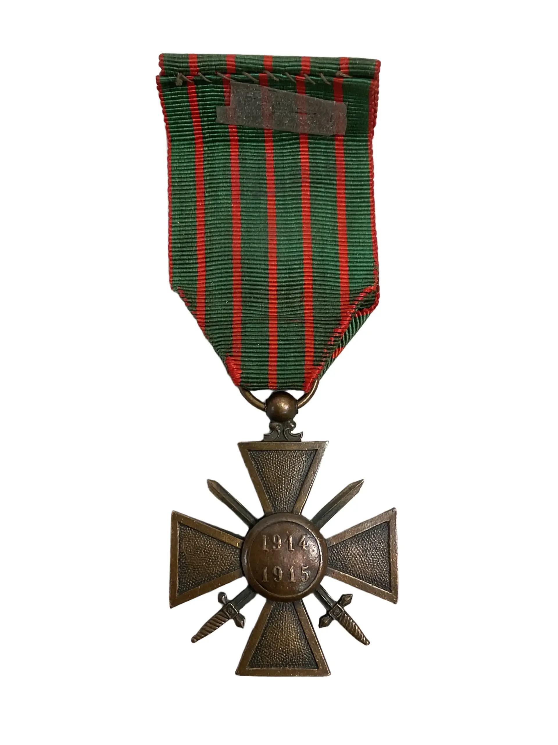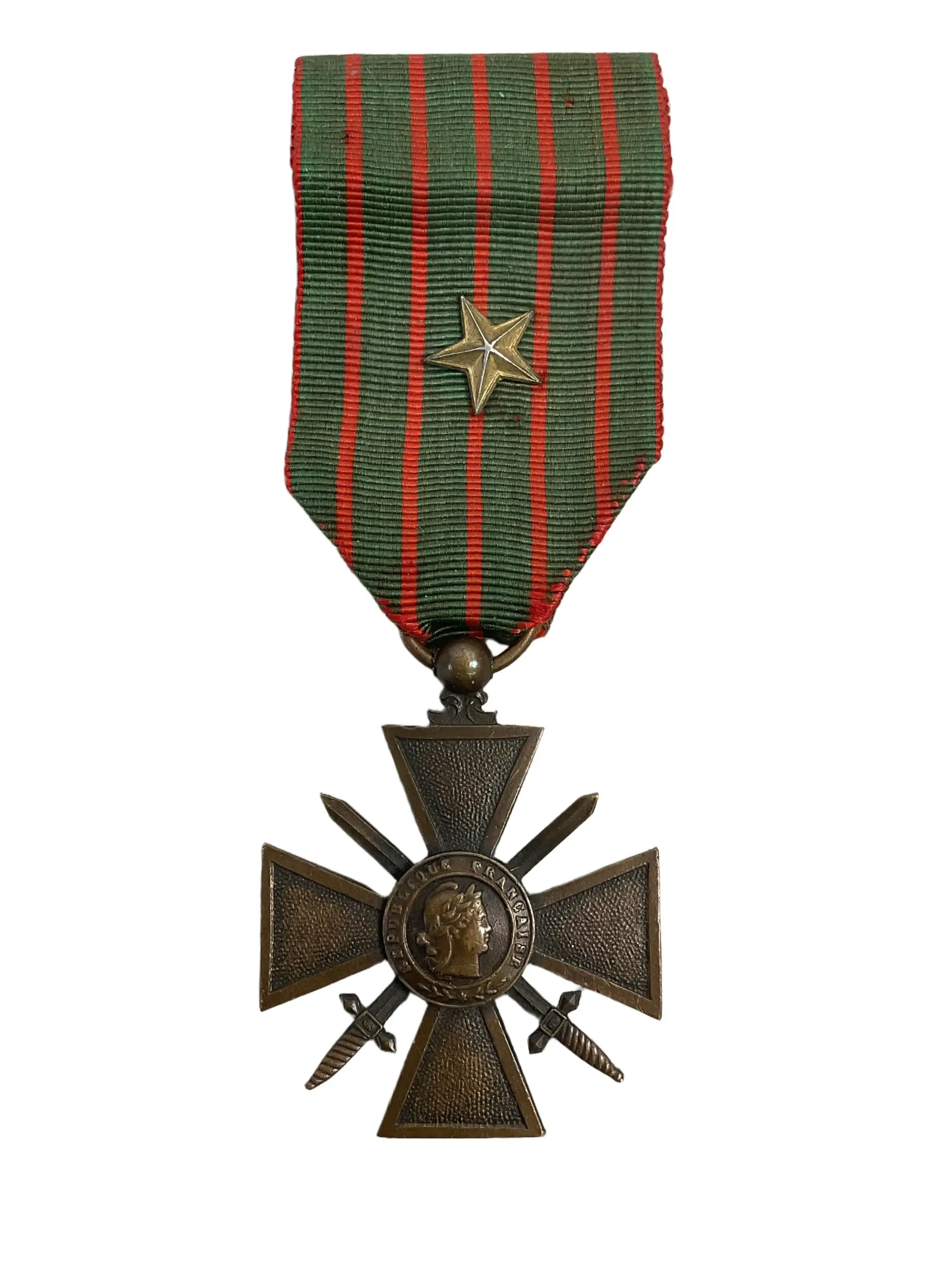 The WW1 French Croix de Guerre 1914-1918 with Star is a full-size military decoration awarded by France during the First World War. Instituted in 1915, the Croix de Guerre recognized acts of bravery or distinguished service in combat. The decoration consists of a bronze cross featuring crossed swords with the effigy of the French Republic and the inscription “1914-1918.” The accompanying ribbon is green with narrow red stripes. This version is fitted with a star device, which denotes a citation at the regimental or brigade level. The reverse side typically bears laurel branches, symbolizing honor and victory. The Croix de Guerre was conferred on both French and Allied soldiers who demonstrated gallantry or merit on the battlefield. This decoration is a significant artifact of military history, reflecting the recognition of valor during the First World War. Its design and materials are representative of French military honors from the early twentieth century.