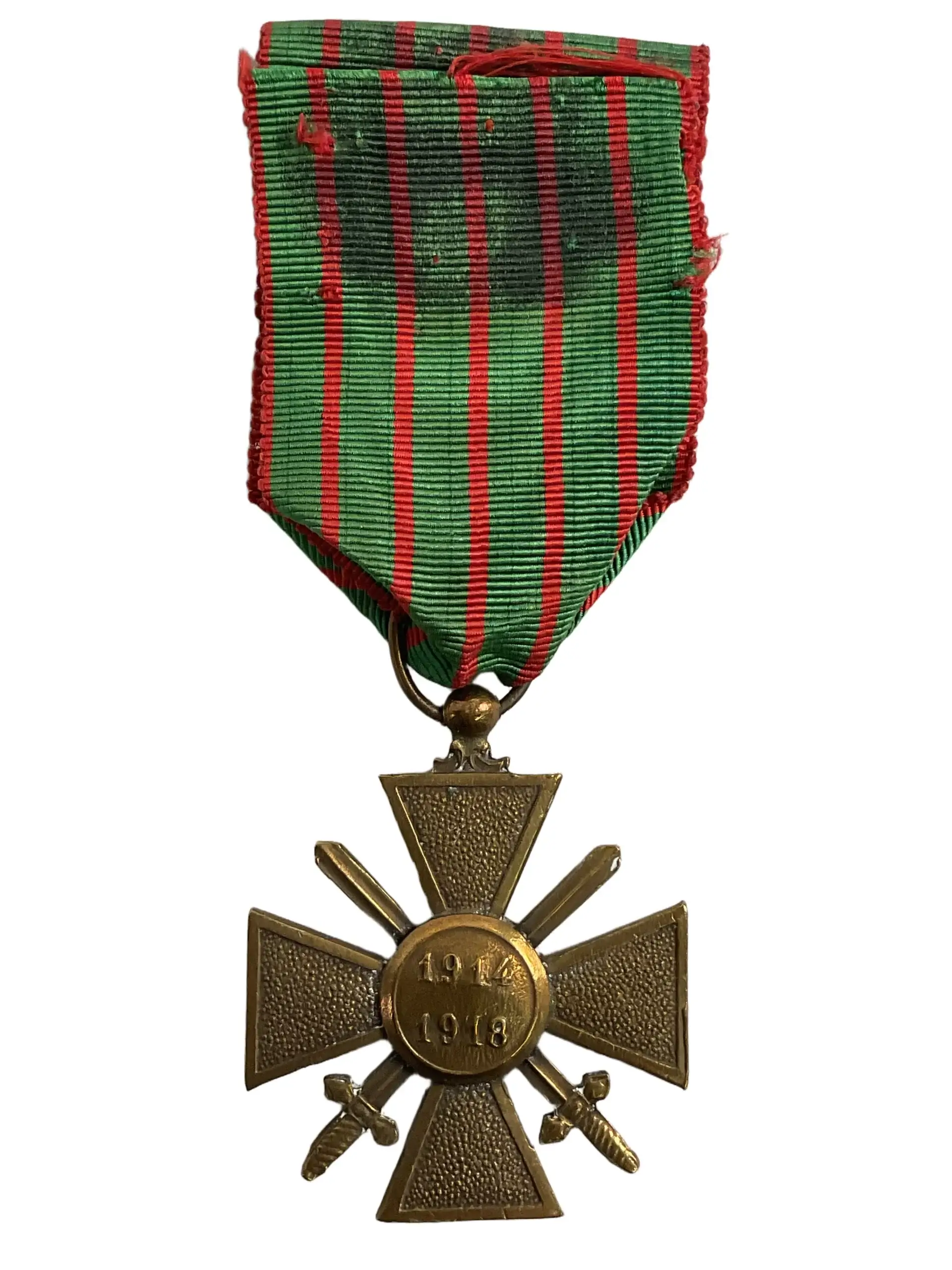 The WW1 French France Croix du Guerre 1914 to 1918 Full Size Medal is a military decoration awarded by France during the First World War. Instituted in 1915, the Croix du Guerre recognized acts of bravery in combat or honorable service during military operations against enemy forces. The medal features a bronze cross with crossed swords between the arms, with the obverse displaying the effigy of the French Republic and the reverse inscribed with the dates “1914-1918.” The full-size version is typically suspended from a ribbon with alternating red and green stripes, symbolizing military valor. Recipients included French military personnel as well as allied soldiers. Devices such as bronze palms or stars could be attached to the ribbon, indicating the level of the commendation. The Croix du Guerre remains one of France’s best-known wartime decorations and is a significant historical artifact from the First World War period.