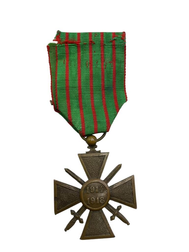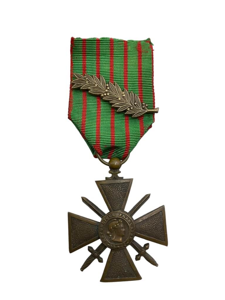 This item is a remarkable WW1 French War Cross Bronze with Palm, a prestigious French military decoration, awarded to honour those who fought and risked their lives during WW1 from 1914 to 1918. Made of high-quality bronze, it features a cross with two crossed swords, indicating military valour. The medal displays a heraldic palm, representing mention in dispatches, signifying extraordinary bravery on the battlefield. The ribbon attached is green with red stripes, echoing the colours of the French flag. This full-size medal is not only a symbol of courage and sacrifice, but also a tangible piece of history, embodying the stories of the brave soldiers who were honoured with it. It’s an excellent collector’s item, perfect for history enthusiasts and military collectors alike.