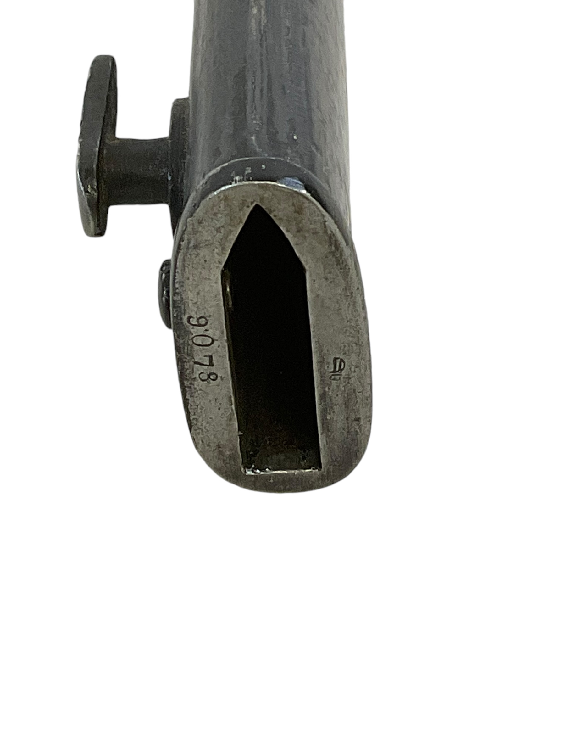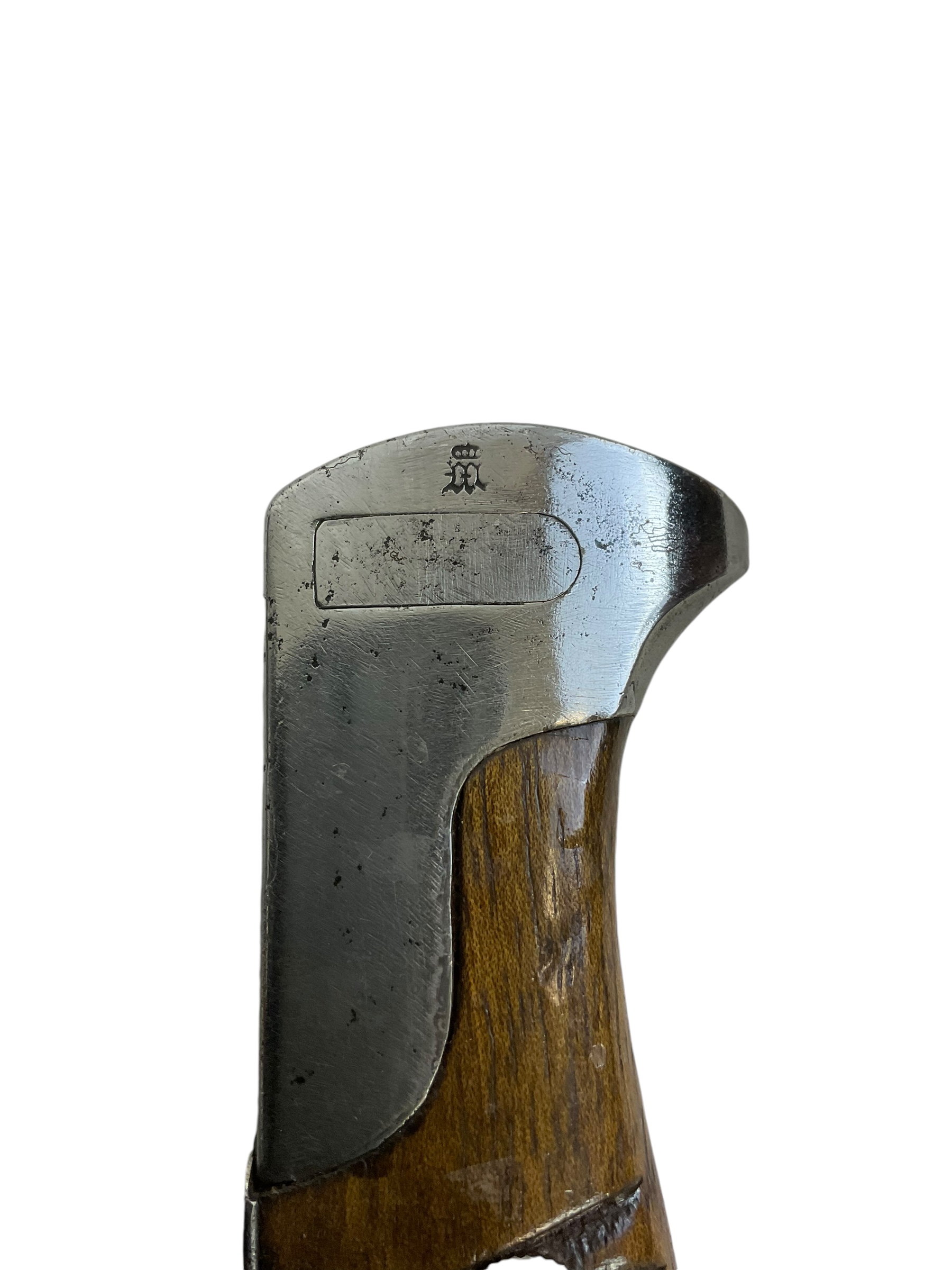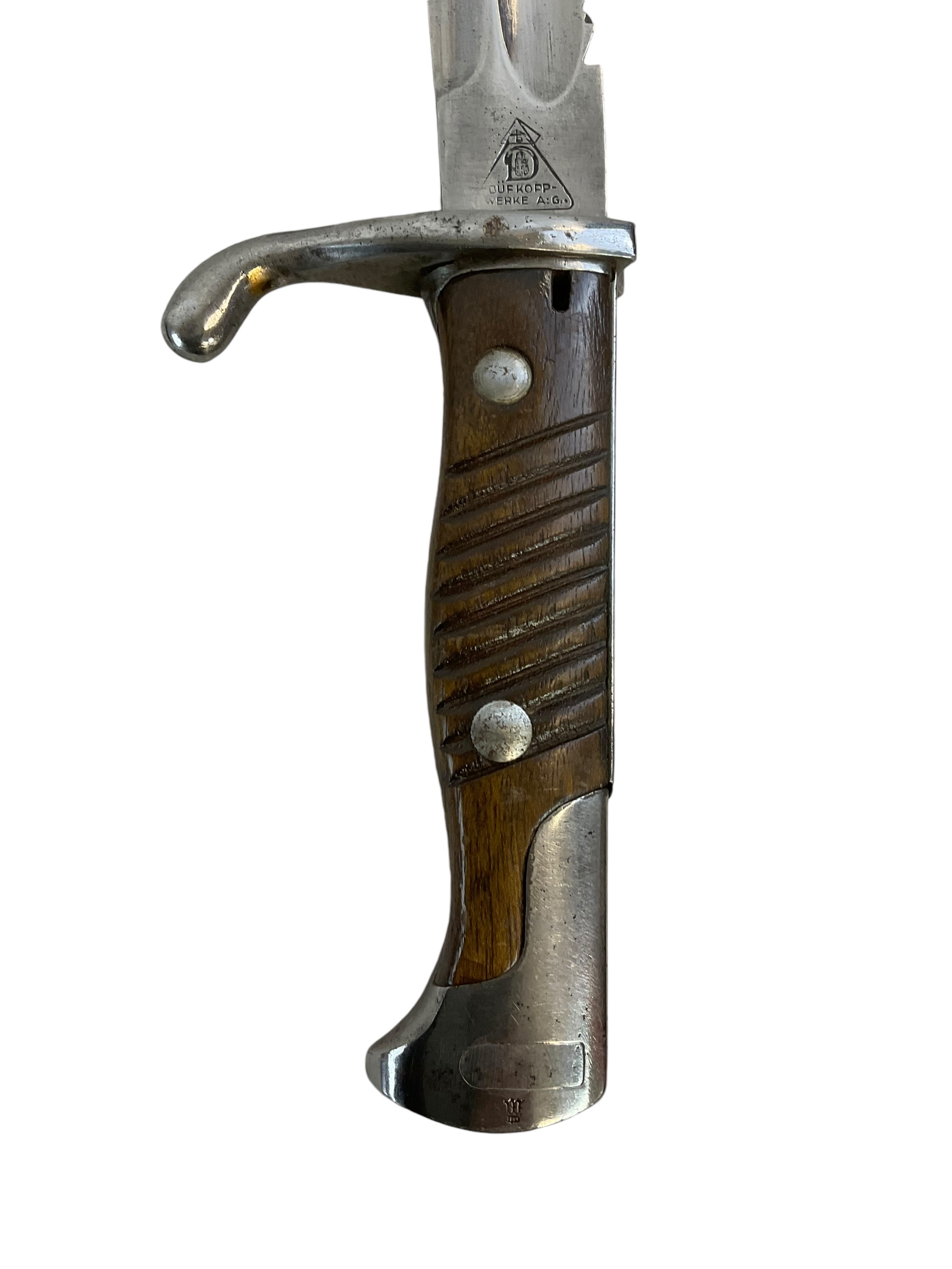 This piece is a remarkable example of WW1 military history – an Imperial German Gew98 Bayeonet Sawback Butcher 98/05, complete with its original scabbard. The bayonet, infamous for its ‘butcher’ blade, was standard issue for the German Army during the Great War. The Sawback version, with its serrated back edge, was designed for utility purposes but also served to strike fear into the enemy. This particular piece is marked ‘Durkopp’, a prominent German manufacturer of the time, indicating it’s an authentic piece of WW1 history. The bayonet and scabbard show signs of age but retain their original integrity, making this a must-have for any serious military history enthusiast or collector.