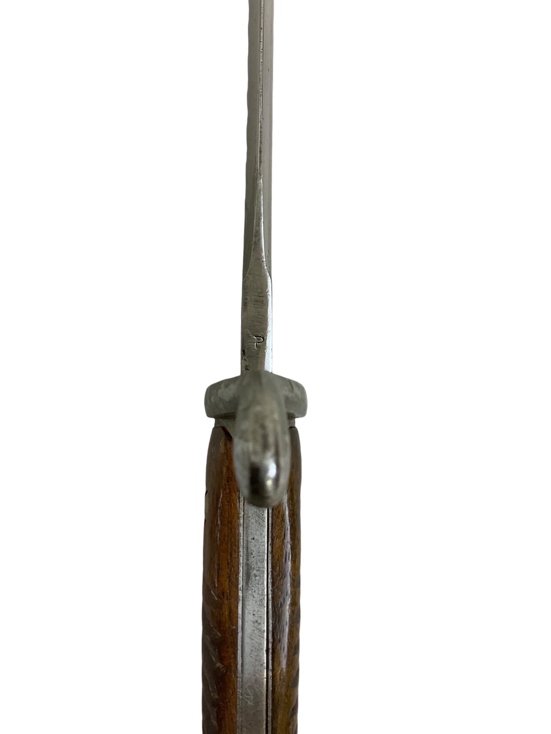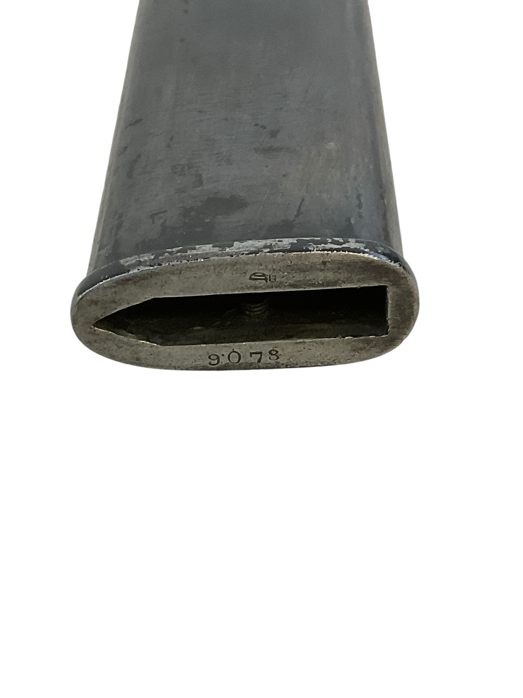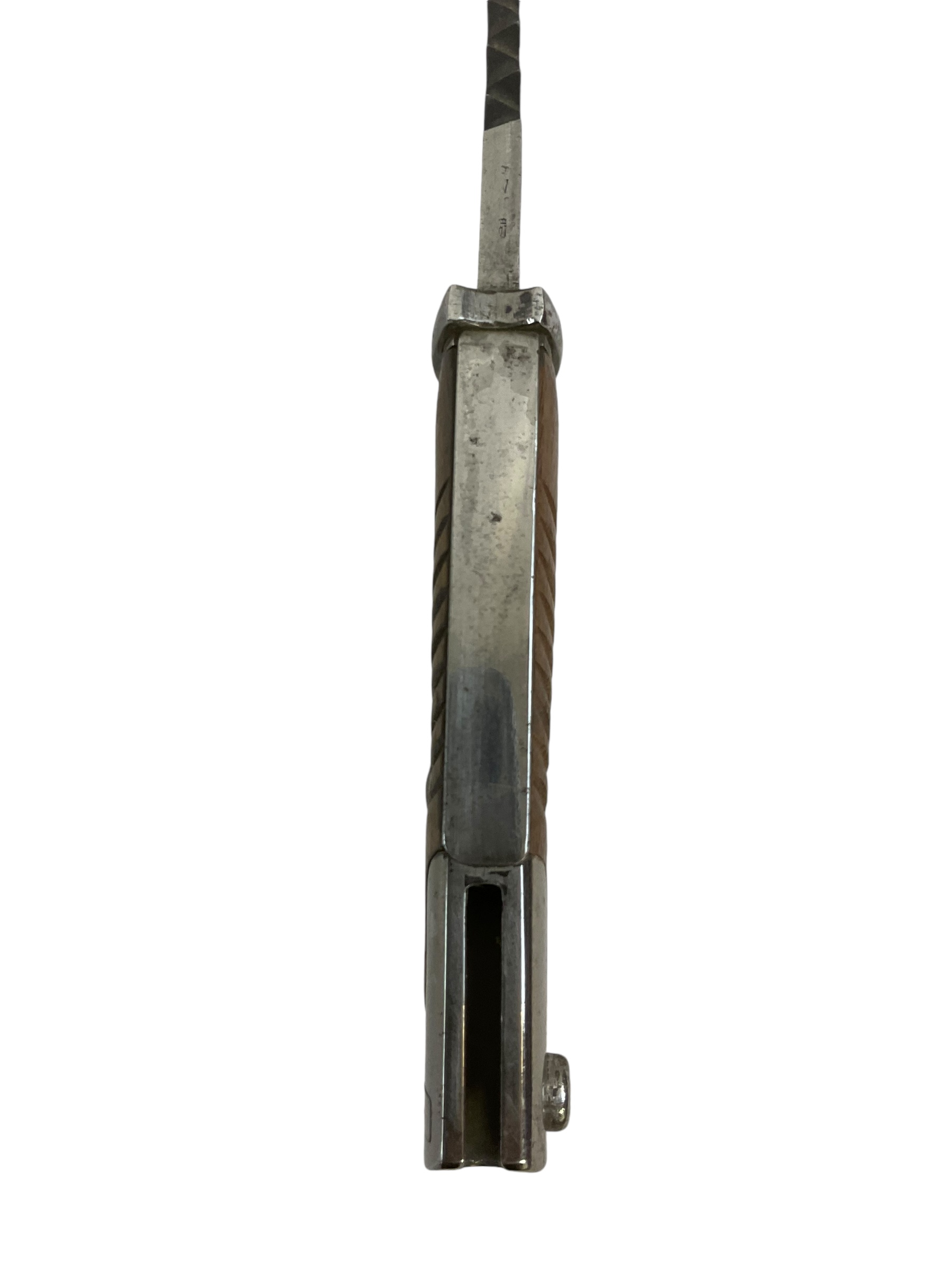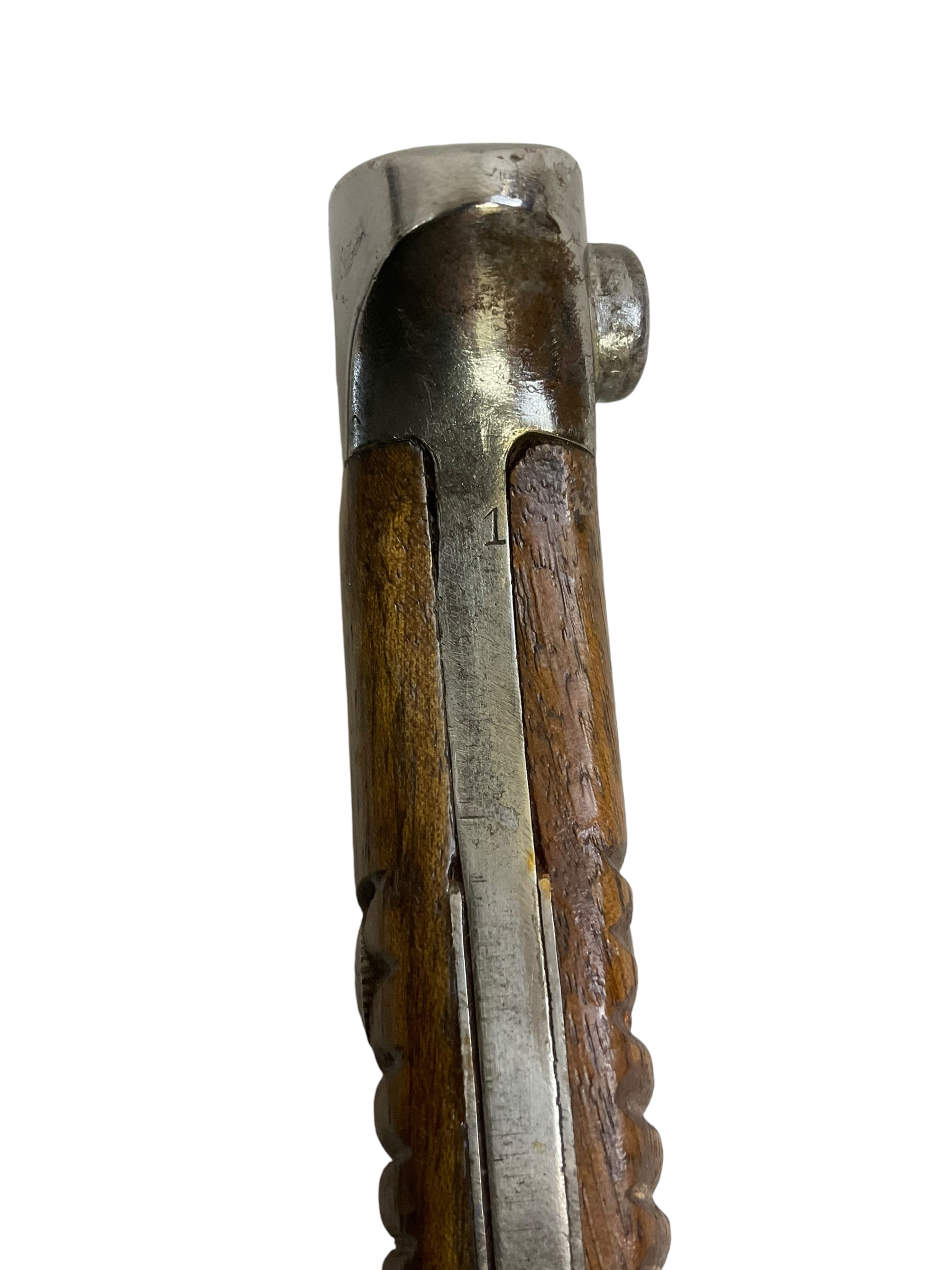 This piece is a remarkable example of WW1 military history – an Imperial German Gew98 Bayeonet Sawback Butcher 98/05, complete with its original scabbard. The bayonet, infamous for its ‘butcher’ blade, was standard issue for the German Army during the Great War. The Sawback version, with its serrated back edge, was designed for utility purposes but also served to strike fear into the enemy. This particular piece is marked ‘Durkopp’, a prominent German manufacturer of the time, indicating it’s an authentic piece of WW1 history. The bayonet and scabbard show signs of age but retain their original integrity, making this a must-have for any serious military history enthusiast or collector.