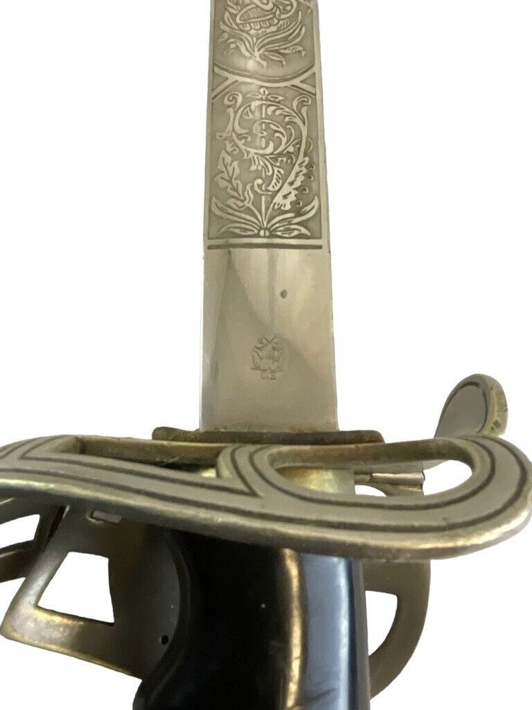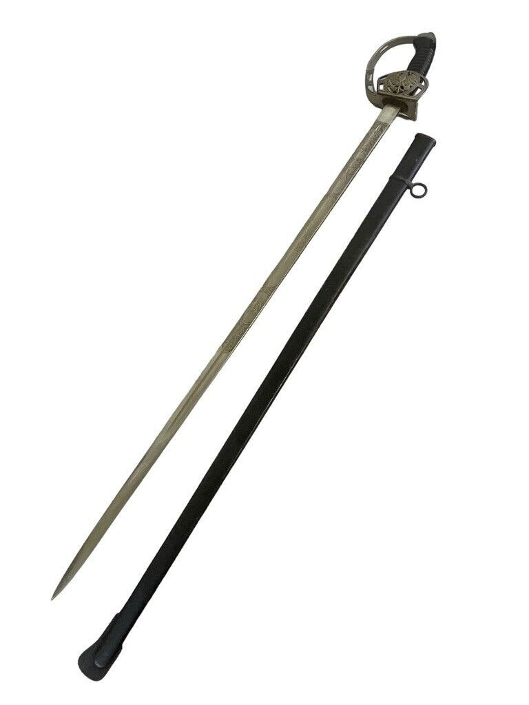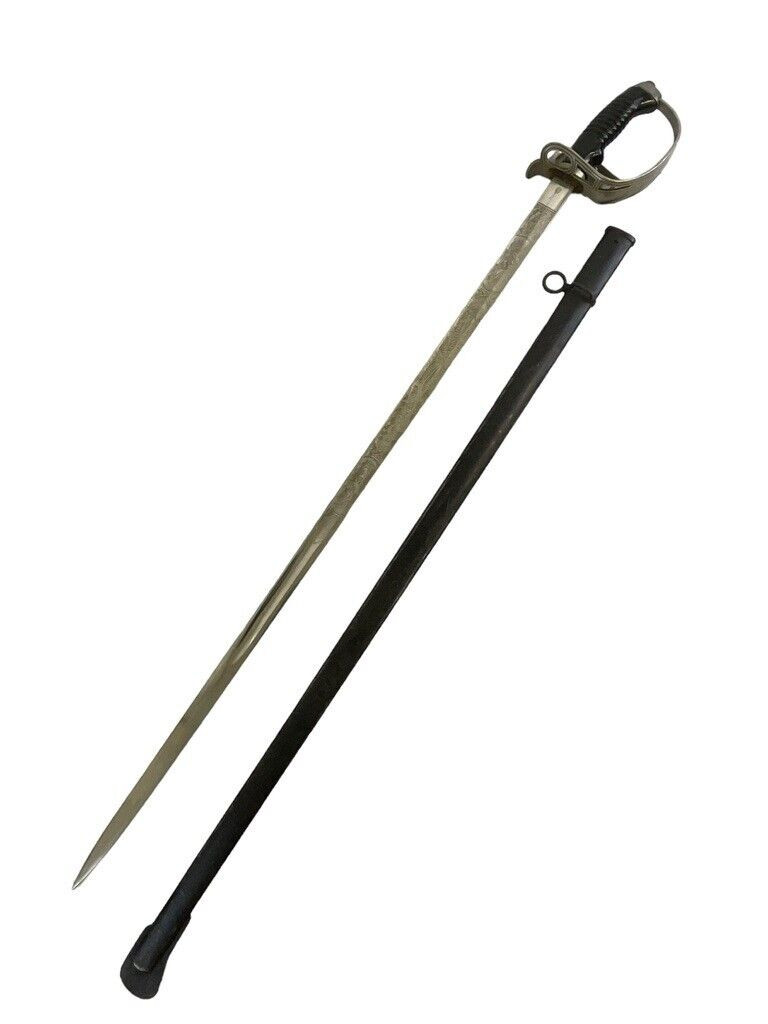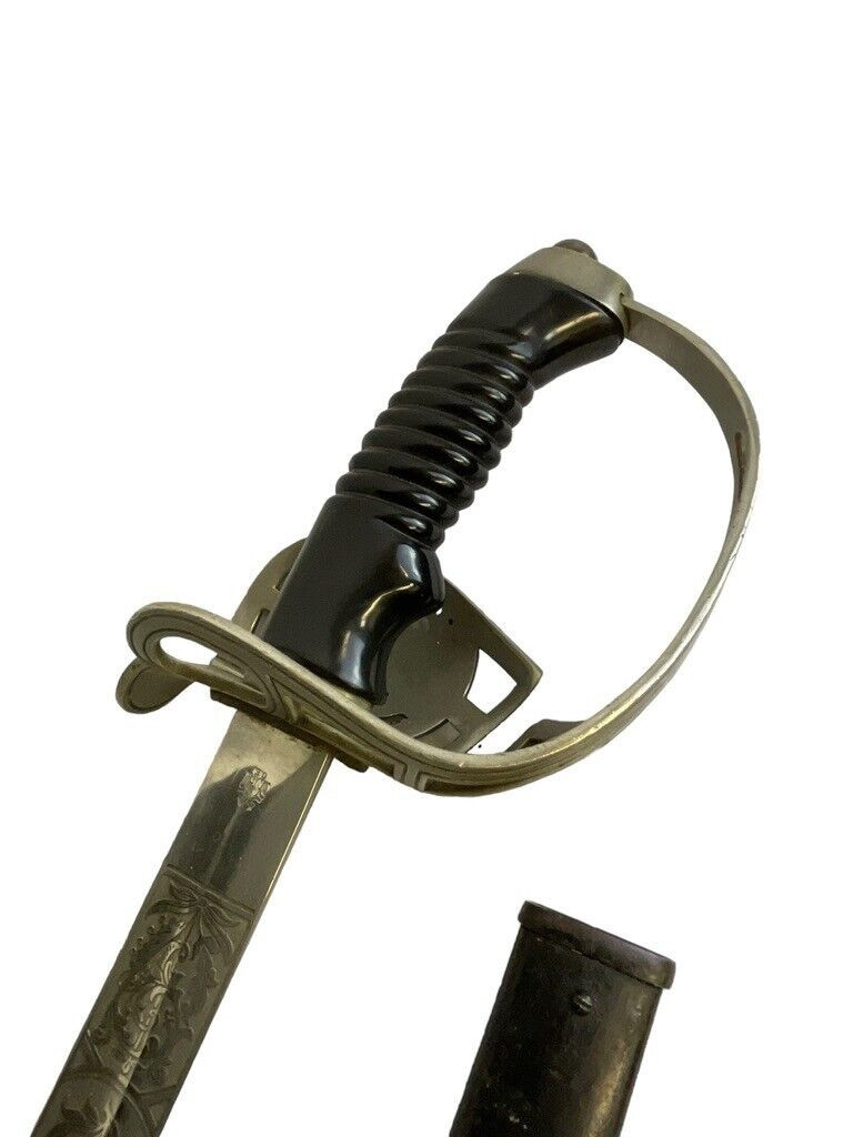 The “WW1 Imperial German Hussar Regiment 7 Cavalry Sword with Scabbard” is a remarkable artifact from the First World War, epitomizing both historical significance and craftsmanship. This elegant sabre, issued to the elite Hussar Regiment 7, features a finely forged blade that seamlessly blends function with form. The hilt is adorned with intricate designs and the regimental emblem, demonstrating the pride and prestige of the Hussars. Accompanied by its original scabbard, which is designed to protect and complement the sword, this piece not only served as a weapon of war but also as a symbol of honor and duty. Collectors and historians will appreciate the well-preserved details that offer a tangible connection to the valor and traditions of the Imperial German cavalry. The sword stands as a testament to the discipline and bravery of the soldiers who once wielded it, making it a coveted item for any military memorabilia collection.