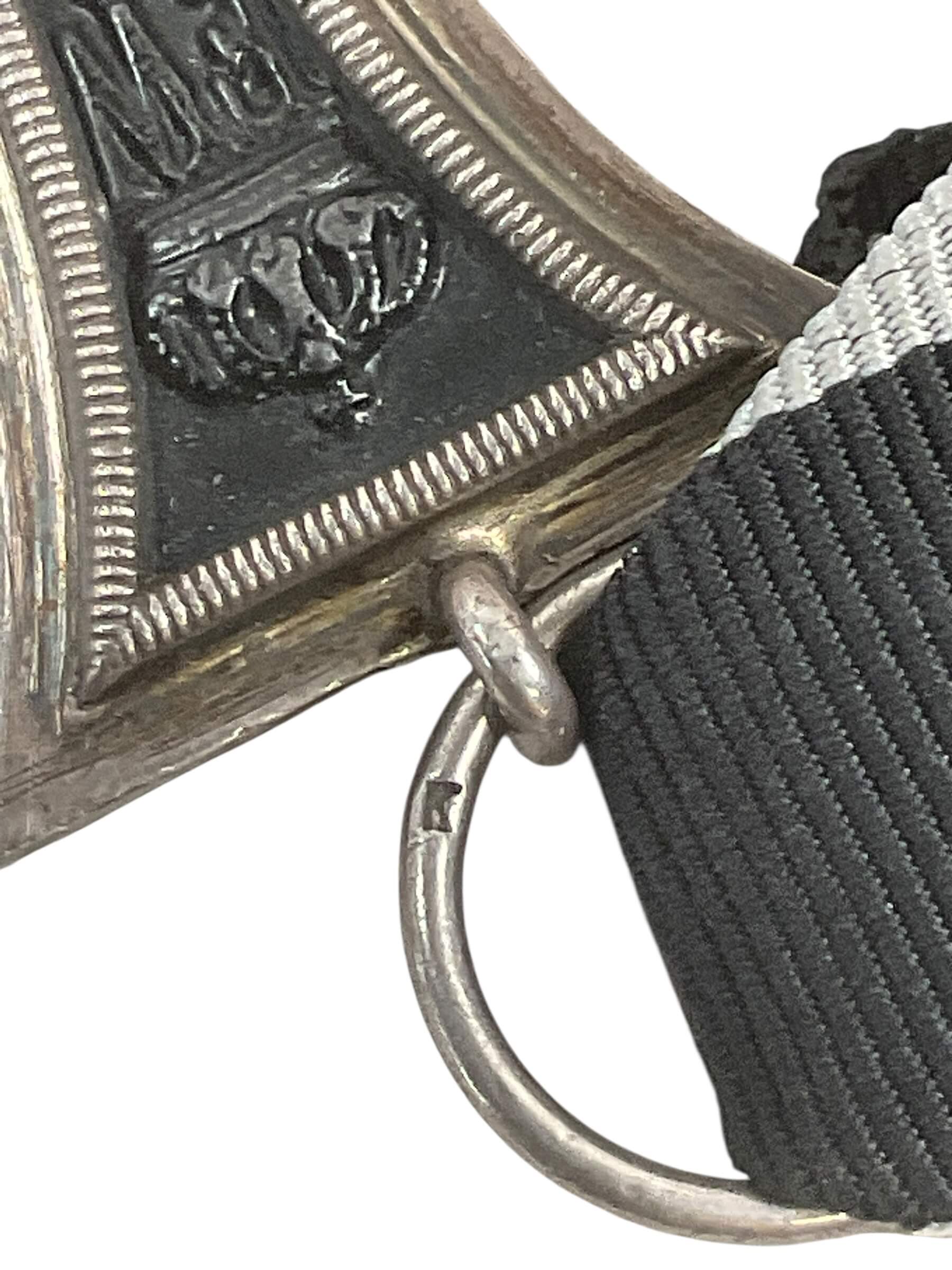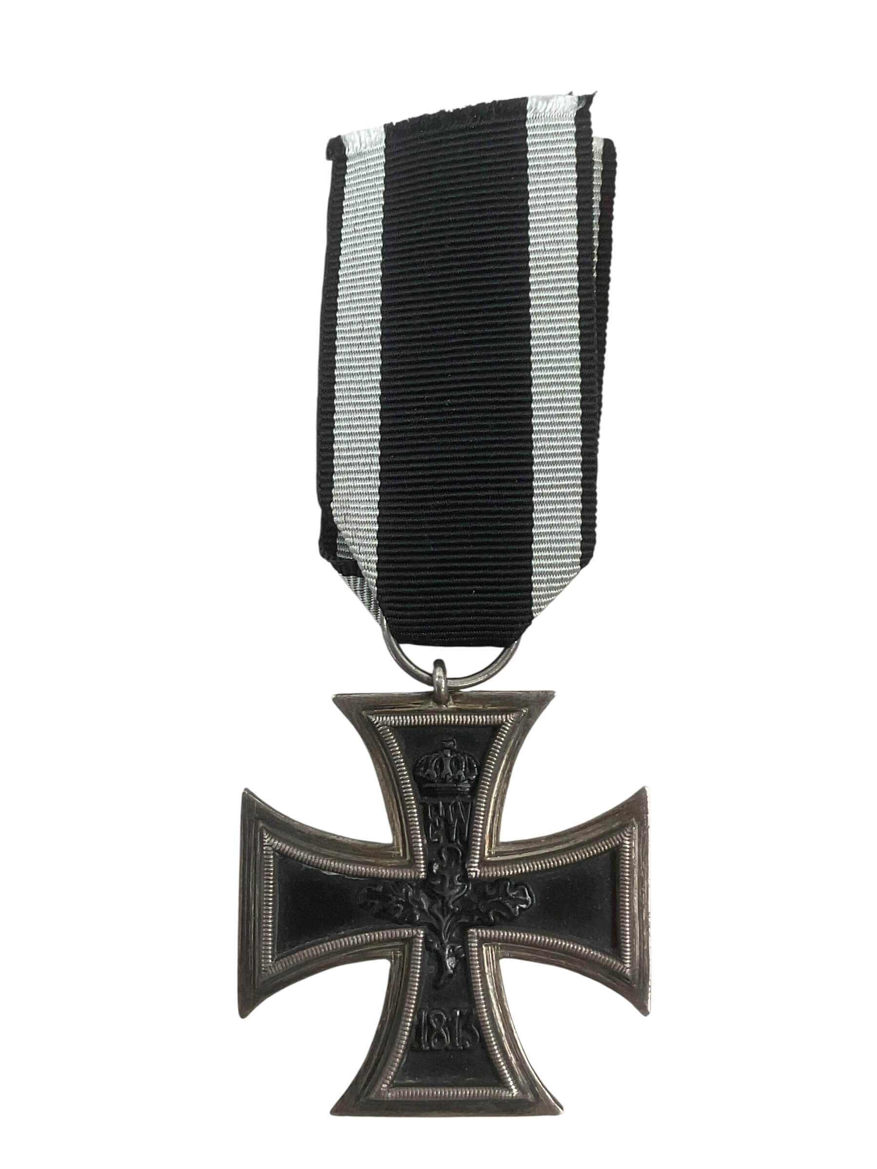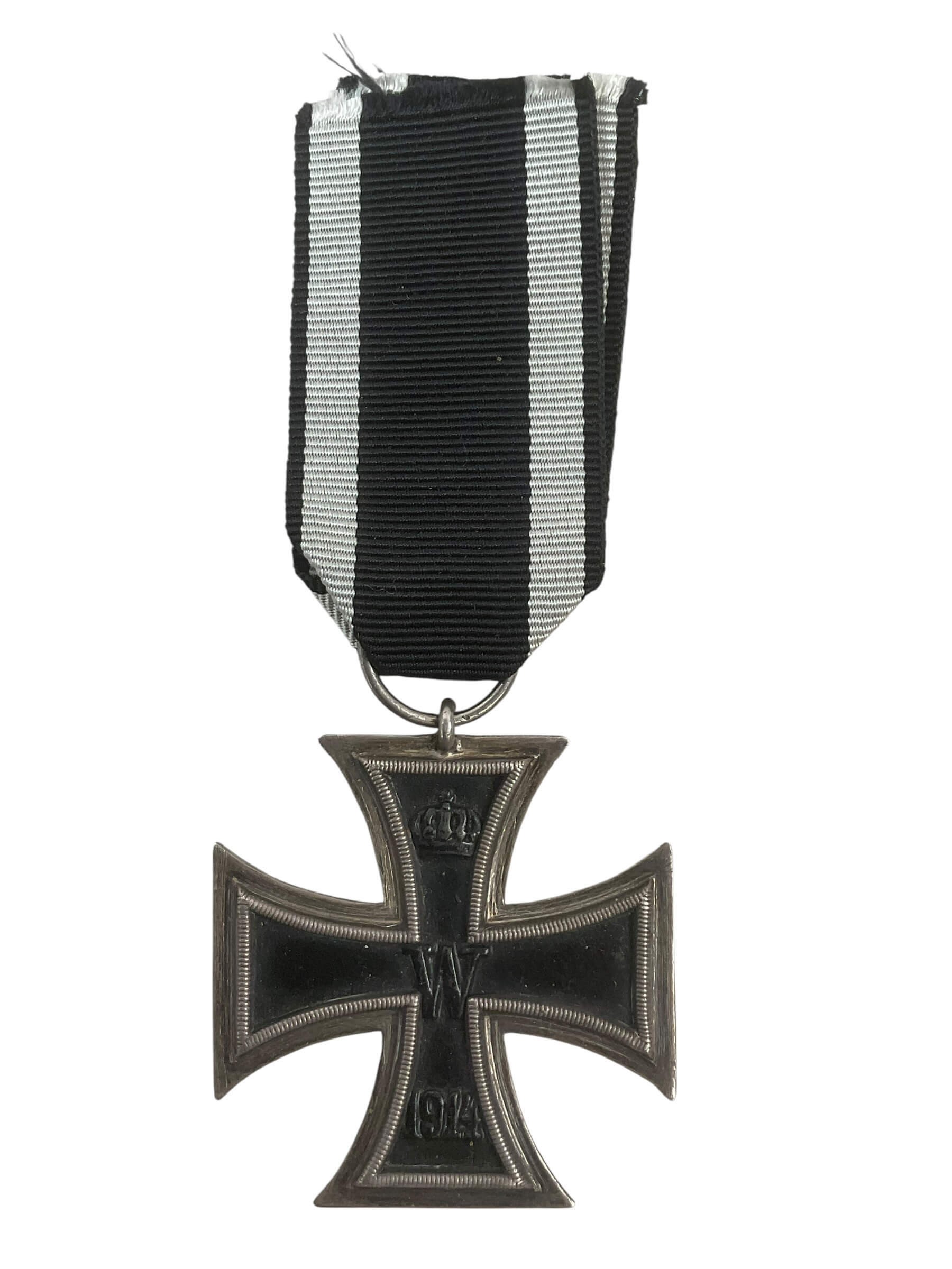 The WW1 Imperial German Iron Cross 2nd Class, Maker KO (Königliches Münzamt Orden), is a military decoration awarded during the First World War by the German Empire. Instituted in 1914, the Iron Cross was conferred in recognition of acts of bravery, leadership, or service in combat. This example is marked by “KO,” indicating production by the Königliches Münzamt Orden (Royal Mint Order), one of several official manufacturers. The decoration comprises a blackened iron core with a silver or silvered frame, measuring approximately 42mm in width. The obverse features a raised central “W” beneath a crown, with the date “1914” at the base. The reverse displays the royal cypher of King Friedrich Wilhelm III and the date “1813,” signifying the creation of the award. This Iron Cross 2nd Class would have originally been issued with a black and white ribbon and presented in a paper packet or box.