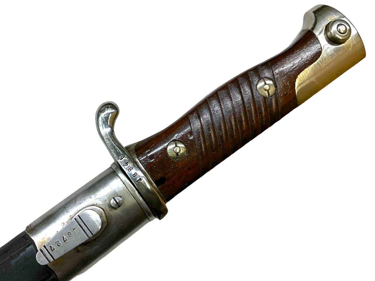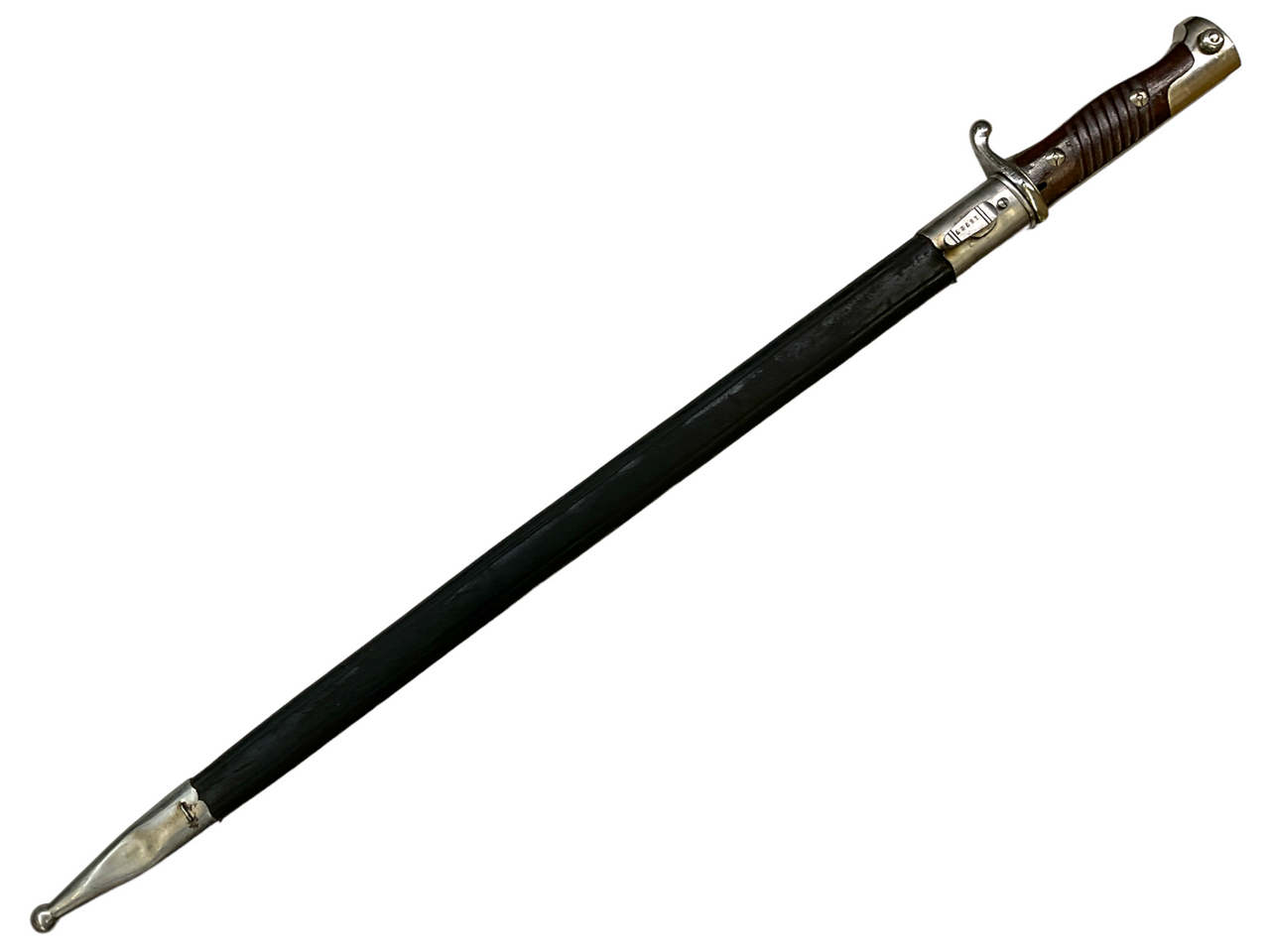 The WW1 Imperial German Model 1898 Peruvian Pipe Back Bayonet and Leather Scabbard is a meticulously crafted piece of German military history. Designed for use during the First World War, this model was produced under the rule of the German Empire. The bayonet possesses a unique ‘pipe back’ design feature, which comprises a rounded, hollowed-out area on the back of the blade. The WW1 Imperial German Model 1898 further stands out for its association with the Peruvian forces, an attribute reflected in specific design elements. Accompanied by its original leather scabbard, the bayonet demonstrates preserved integrity with signs of use and age. The combination of a critical war period, German craftsmanship, and Peruvian involvement underpins its historical significance. It’s a remarkable artifact for collectors appreciative of distinctive military antiques. Please be aware this product represents an original piece, and does not fall under the category of fakes or reproductions.