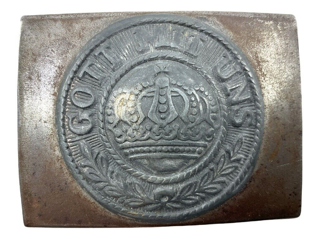 WW1 Imperial German Prussian Belt Buckle Steel 2 The ‘WW1 Imperial German Prussian Belt Buckle Steel 2’ is a remarkable piece of military history, epitomizing the craftsmanship and design prevalent during the First World War. This belt buckle, forged from durable steel, served as a vital component of the Imperial German Army’s uniform. It bears the iconic insignia of the Prussian state, symbolizing the power and prestige of the German Empire during the early 20th century. The intricate detailing on the buckle reflects the era’s meticulous attention to military regalia and the pride soldiers took in their appearance. This authentic artifact not only offers a tangible connection to the soldiers who fought in World War I but also stands as a testament to the historical and cultural significance of military emblems. Collectors and historians alike will find this piece invaluable for its authenticity, durability, and the rich history it represents.