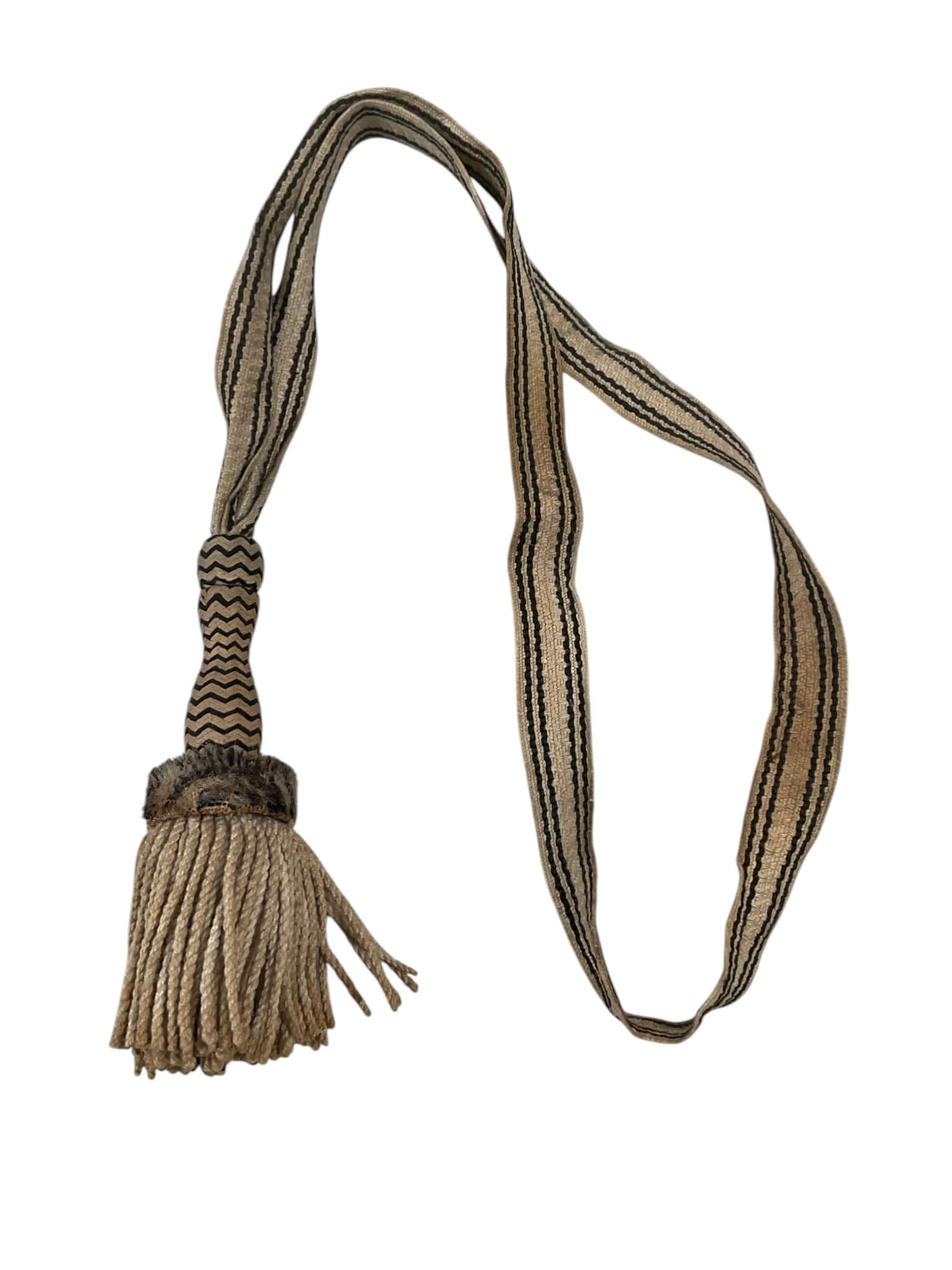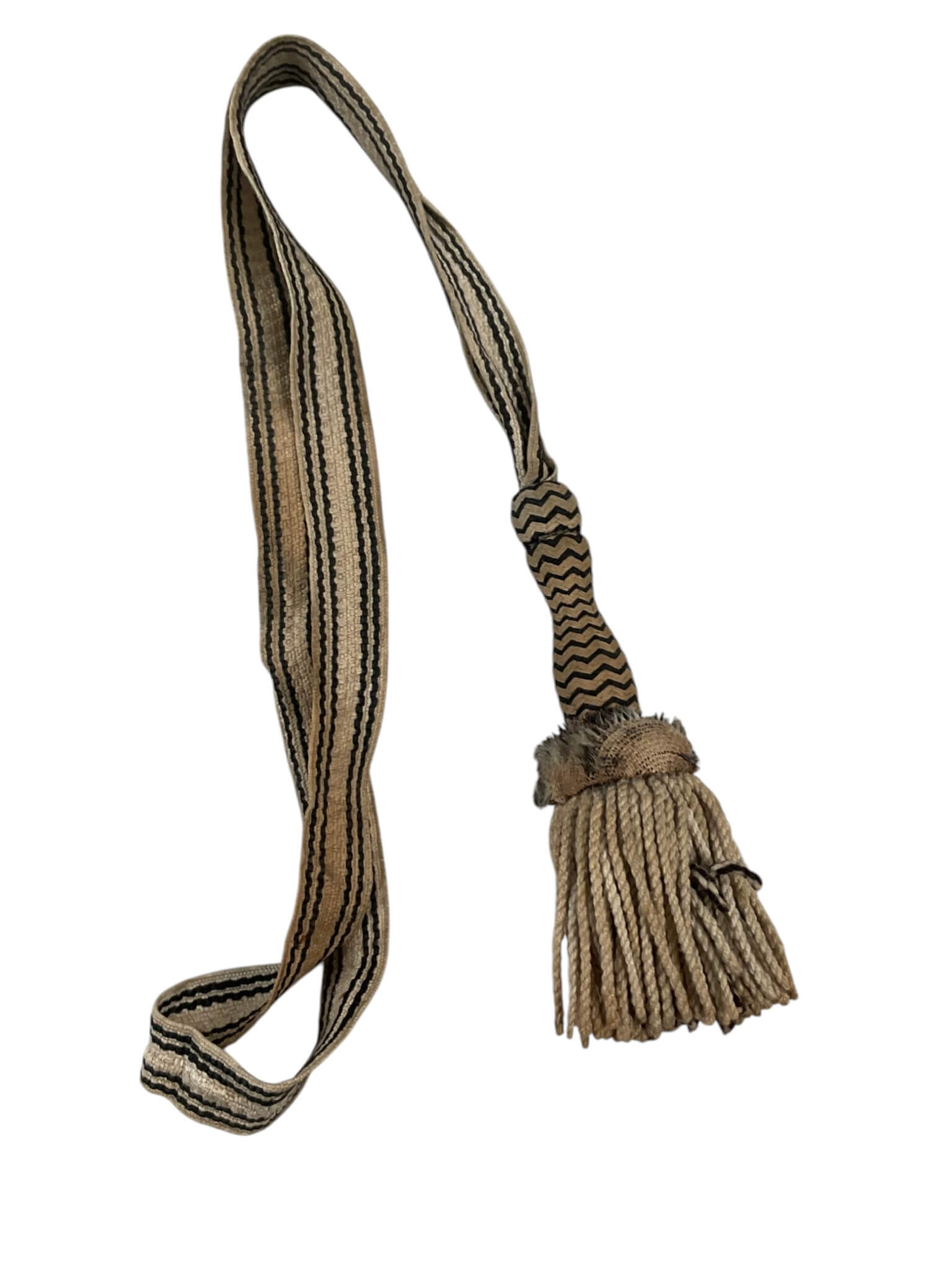 The WW1 Imperial German Prussian NCO Troddle is an original military accoutrement from the First World War, used by Non-Commissioned Officers (NCOs) of the Imperial German Army. The troddle, also known as a Portepee or Sword Knot, served both a functional and decorative purpose, securing the sword or bayonet to the belt while denoting rank and unit affiliation. This example is specific to the Prussian regiments, featuring the distinctive black and white cord colors associated with Prussia during the period. Typically made from woven textile materials, the troddle comprises a looped strap, a stem, and a decorative knot or acorn at the end. These troddles were regulated by military specifications and varied slightly in design among different states and ranks. Authentic WW1-era Prussian NCO troddles are collectible items of military history, representing the design and traditions of the Imperial German armed forces during the early twentieth century.
