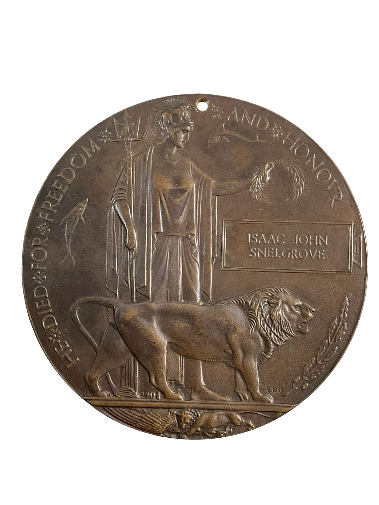 The WW1 Royal Newfoundland Regiment Death Penny is a commemorative medallion presented to the next of kin of servicemen who lost their lives during the First World War. Officially known as the Memorial Plaque, it is cast in bronze and measures approximately 120mm in diameter. This example is specifically named to a member of the Royal Newfoundland Regiment, a unit that served with distinction throughout the conflict. The plaque features an image of Britannia holding a laurel wreath and standing beside a lion, with the inscription “He died for freedom and honour” around the edge. The full name of the fallen soldier is impressed along the lower portion of the medallion. Issued between 1919 and 1920, death pennies such as this are historically significant artifacts that reflect the sacrifices made by individuals and their families. This item provides valuable context to the legacy of the Royal Newfoundland Regiment during World War I.