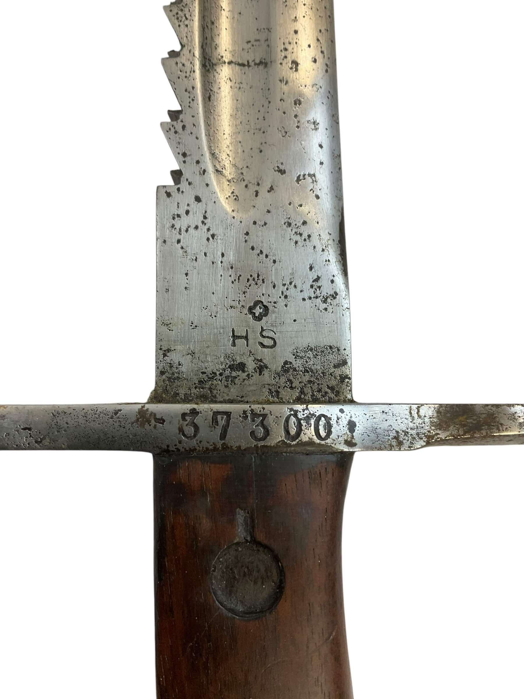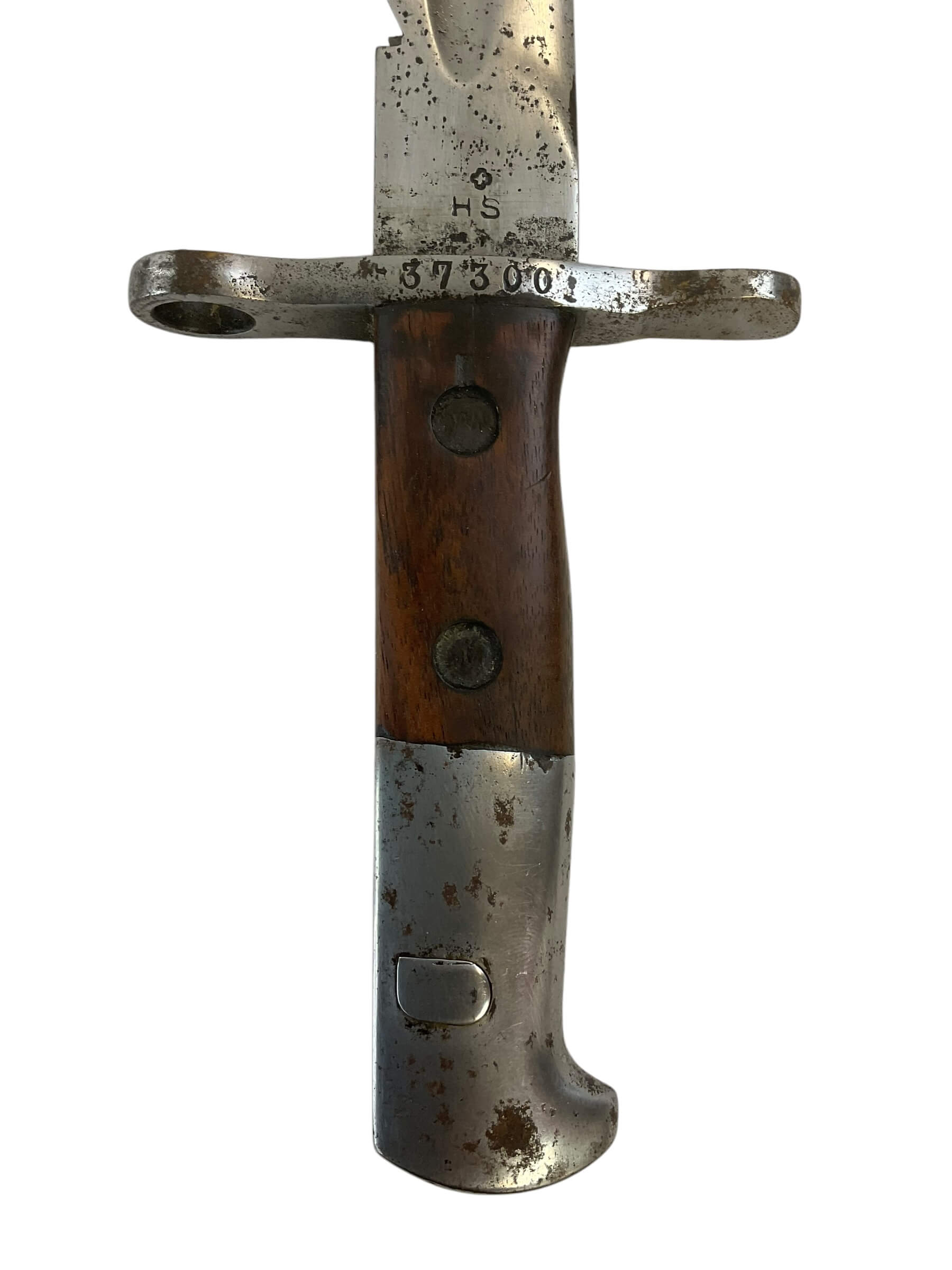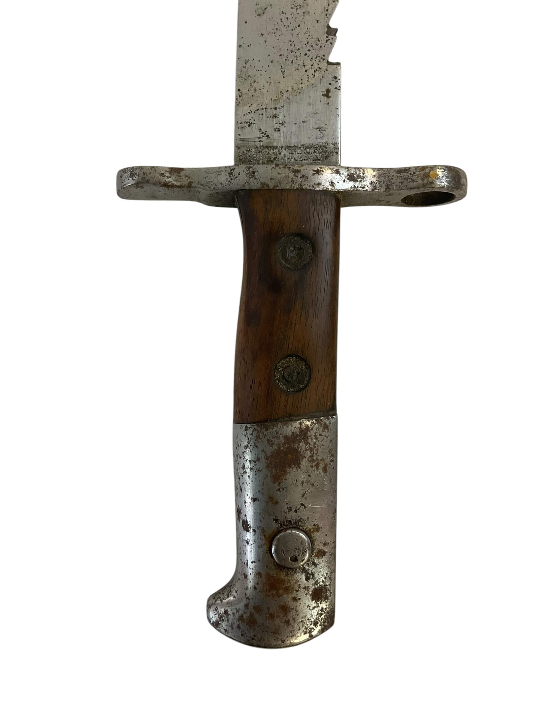The WW1 Swiss M1914 K31 Pioneer Sawback Bayonet is a historic military artifact, known for its sturdy construction and distinctive design. This bayonet was commonly used by the Swiss army during World War I, and it is a reflection of the Swiss dedication to precision and quality in their warfare equipment. The M1914 K31 is a pioneer bayonet, indicating its use in engineering and construction tasks on the battlefield. The sawback design features a sharp, serrated edge on the spine of the blade, making it useful for cutting through wood or bone. The blade is made of high-grade steel, with a full tang extending into the handle for added strength and durability. The handle itself is often made of hardwood, completing the robust design. This bayonet is not merely a weapon, but a versatile tool, making it an exceptional piece of military history.