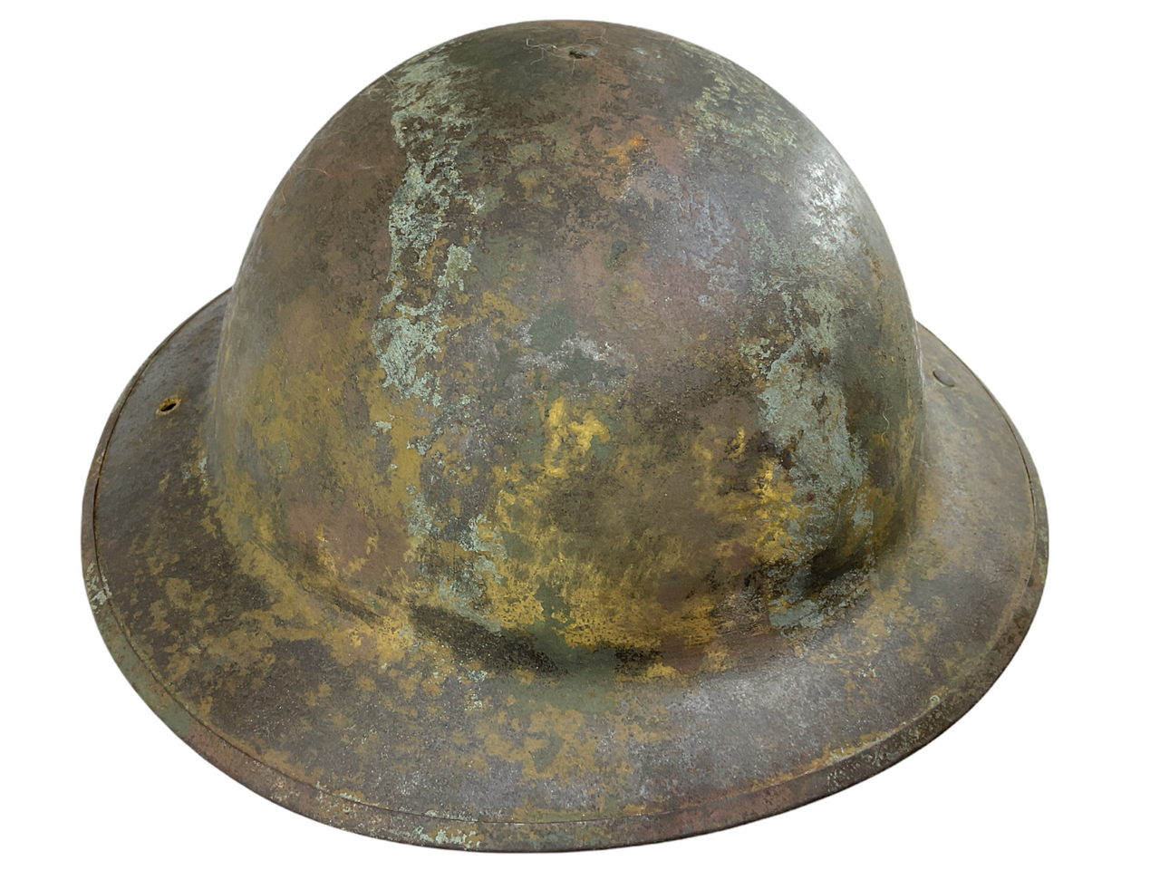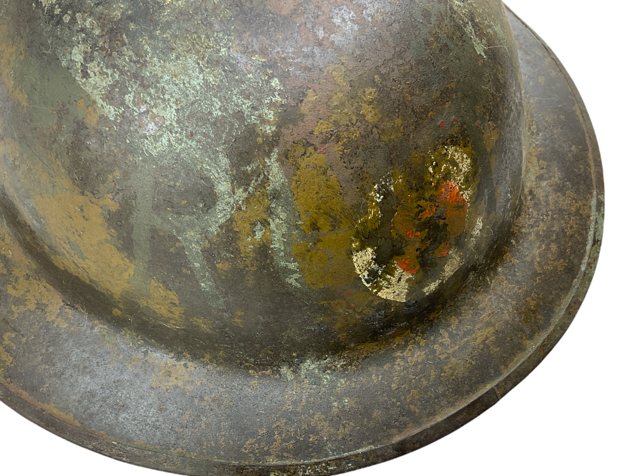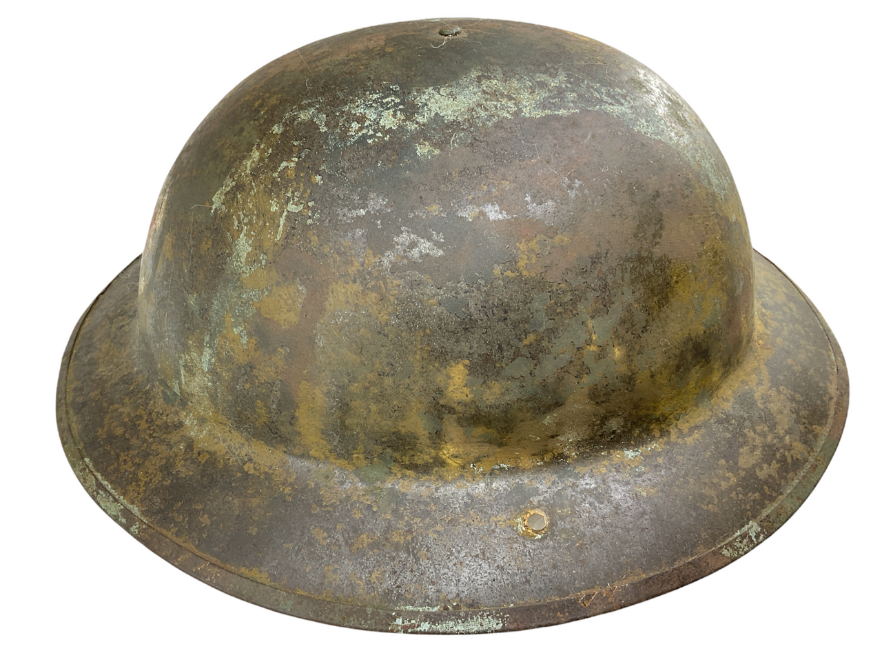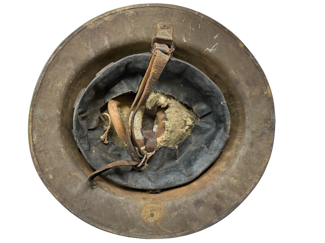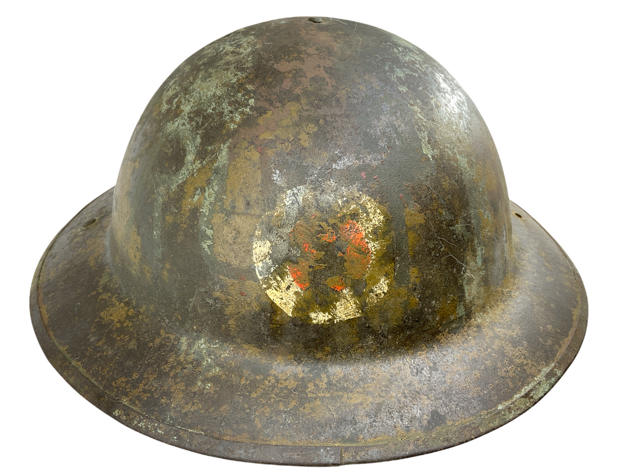 This rare artifact is an original World War I U.S. Army Brodie helmet, proudly displaying the hand-painted insignia of the 37th Division, a distinguished unit of the American Expeditionary Forces (AEF). The helmet, known for its iconic dome shape and protective brim, has been meticulously preserved, showcasing the wear and patina that reflect its historical significance. The bold 37th Division patch, symbolizing strength and unity, is clearly visible, painted with care and precision, making it a striking representation of the soldiers who wore it in the trenches of Europe. This helmet not only serves as a piece of military history but also as a tribute to the bravery and sacrifice of the men who served in the Great War. Whether you’re a collector, historian, or military enthusiast, this helmet is a tangible connection to the past, offering a poignant glimpse into the life of a WWI soldier.