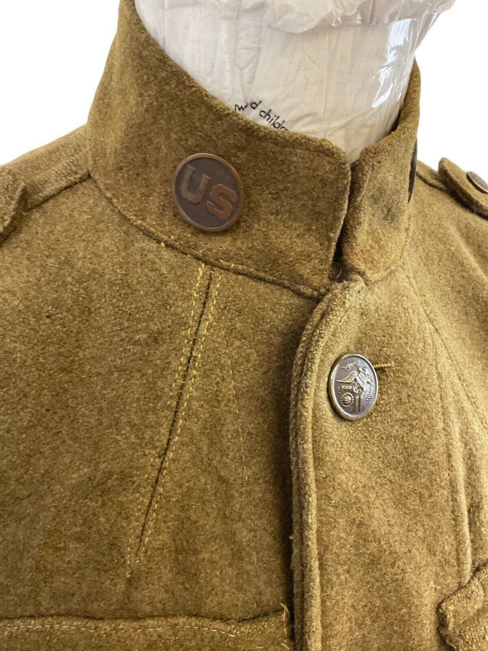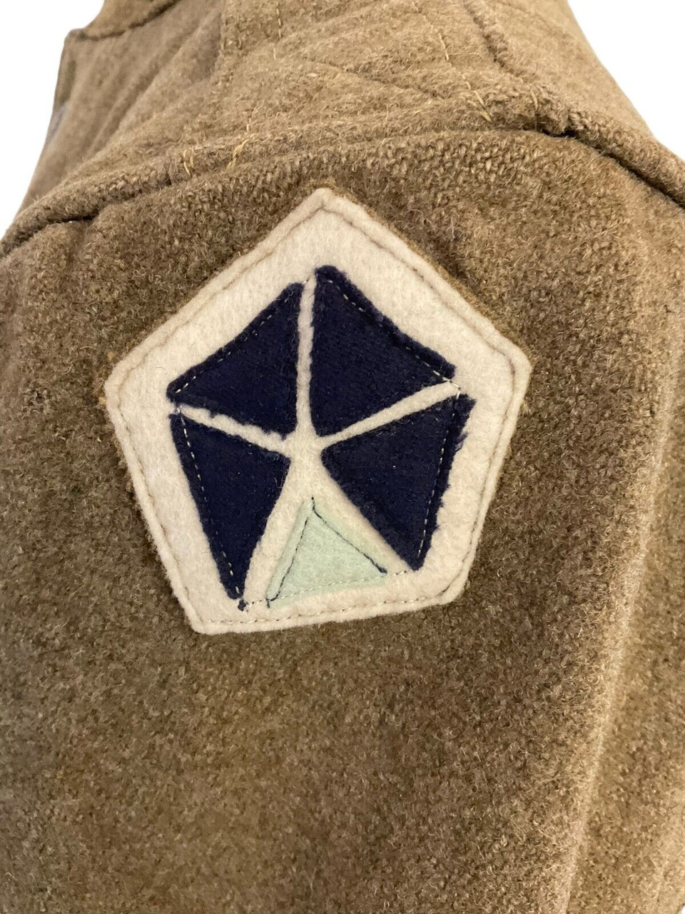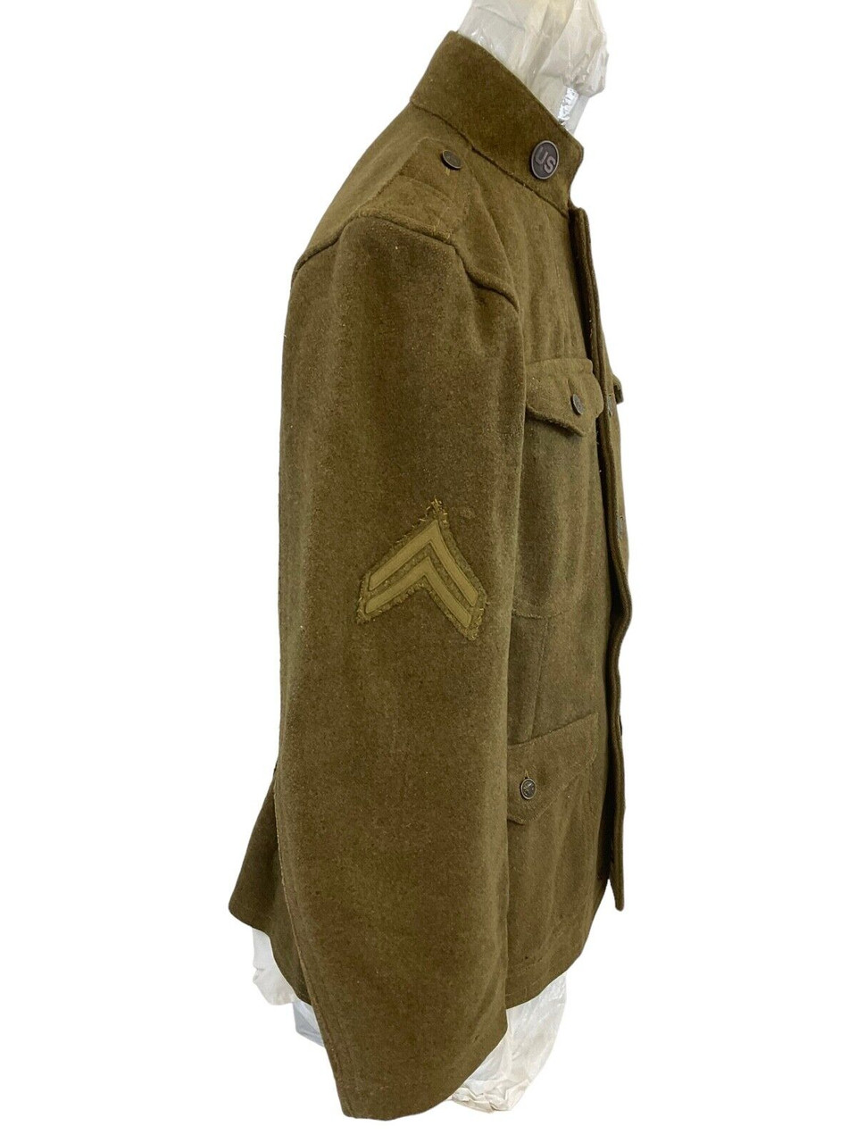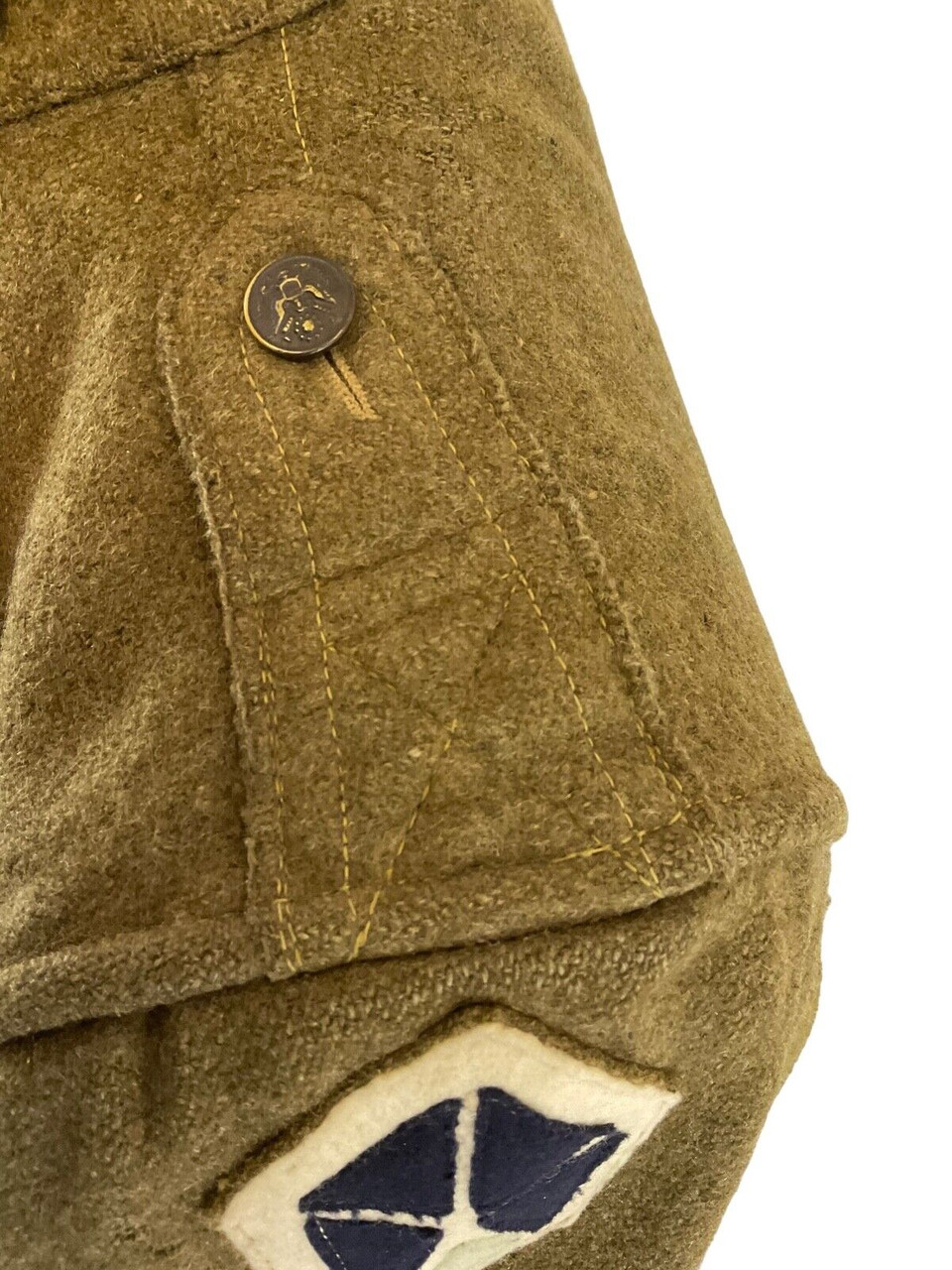 WW1 US AEF 5th Corps Pioneer Corporal Infantry Collar Disc Other Ranks Tunic This authentic World War I artifact is a tunic belonging to a Corporal of the Pioneers within the US Army Expeditionary Forces (AEF), specifically from the 5th Corps Infantry. The garment features an Infantry collar disc, signifying the rank and specialty of the wearer. Made from durable wool, the tunic displays the standard design used by other ranks, reflecting the historical military fashion of the era. The unique unit insignia and markings give insight into the divisional alignment and duties of the Pioneer Corporal, who would have been responsible for engineering tasks such as fortifications and trench constructions. This tunic not only represents the practical military attire of the Great War but also serves as a tribute to the bravery and industrious spirit of the men who served in one of the most significant conflicts in history. An excellent piece for collectors and historians alike, it provides a tangible connection to the lives of WWI soldiers.