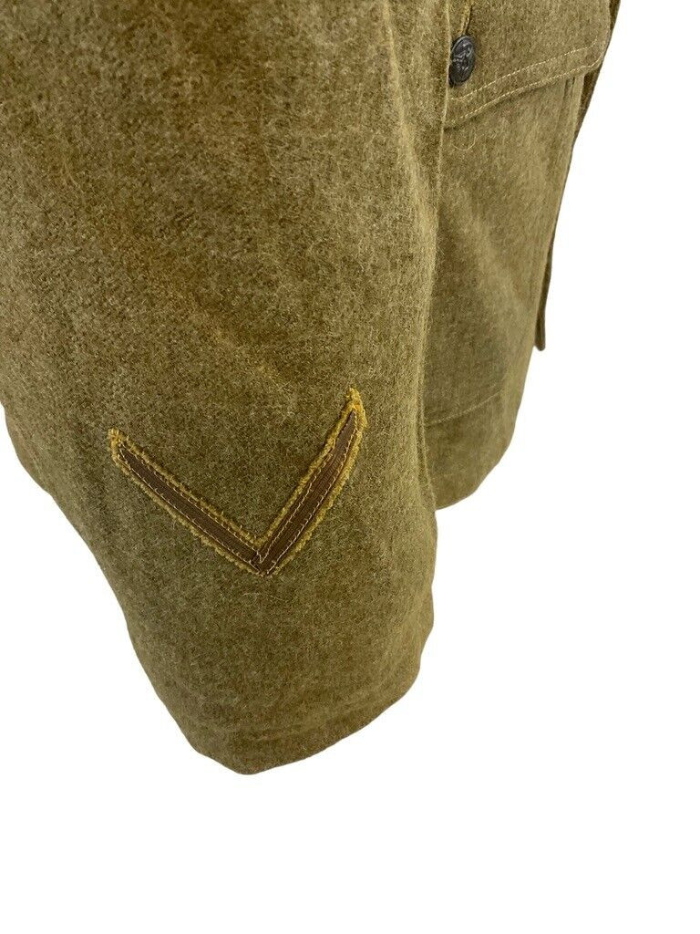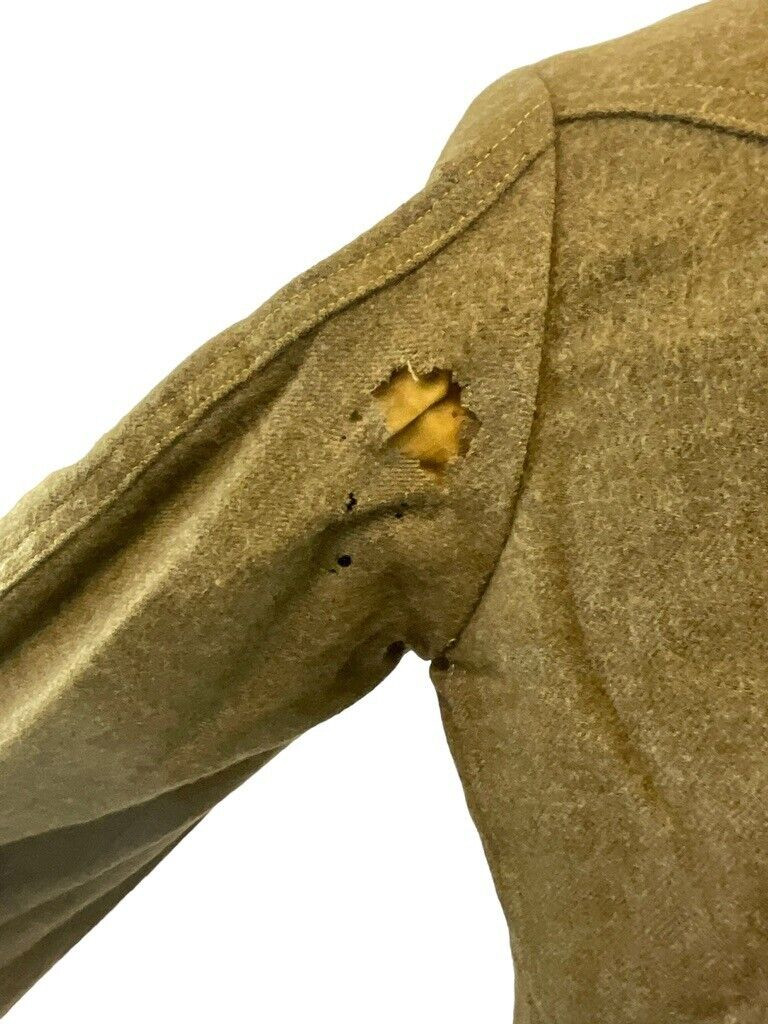 The WW1 US AEF 5th Division G Company Infantry Collar Disk Tunic is a historic military garment from the American Expeditionary Forces during World War I. This tunic is notably adorned with the insignia of the US 5th Division, specifically G Company, highlighting its significance and identifying its original owner as an infantryman in this distinguished unit. The collar disk, affixed to the tunic, proudly displays the infantry’s emblem and the division’s insignia, offering a tangible connection to the soldier’s service and the broader efforts of the AEF during the Great War. The tunic is crafted from durable materials, reflecting the practicality and ruggedness needed for the harsh conditions faced on the battlefield. Collectors and historians value this tunic for its authenticity and as a silent testimony to the bravery and sacrifice of those who served in one of the US military’s pivotal divisions during World War I.