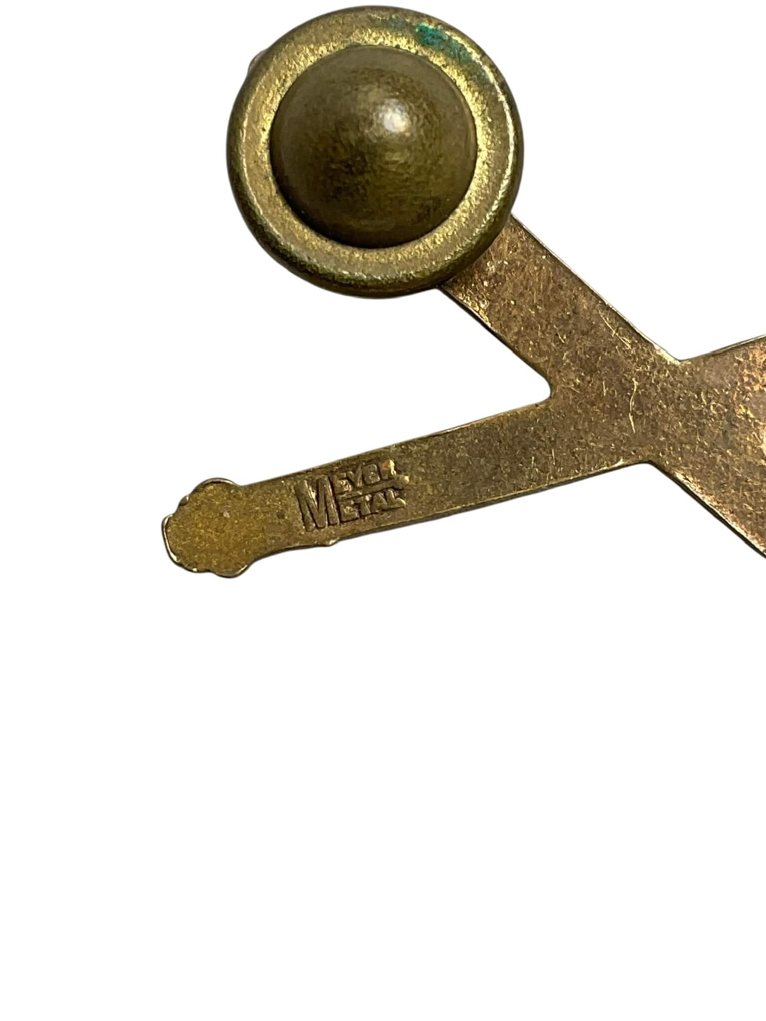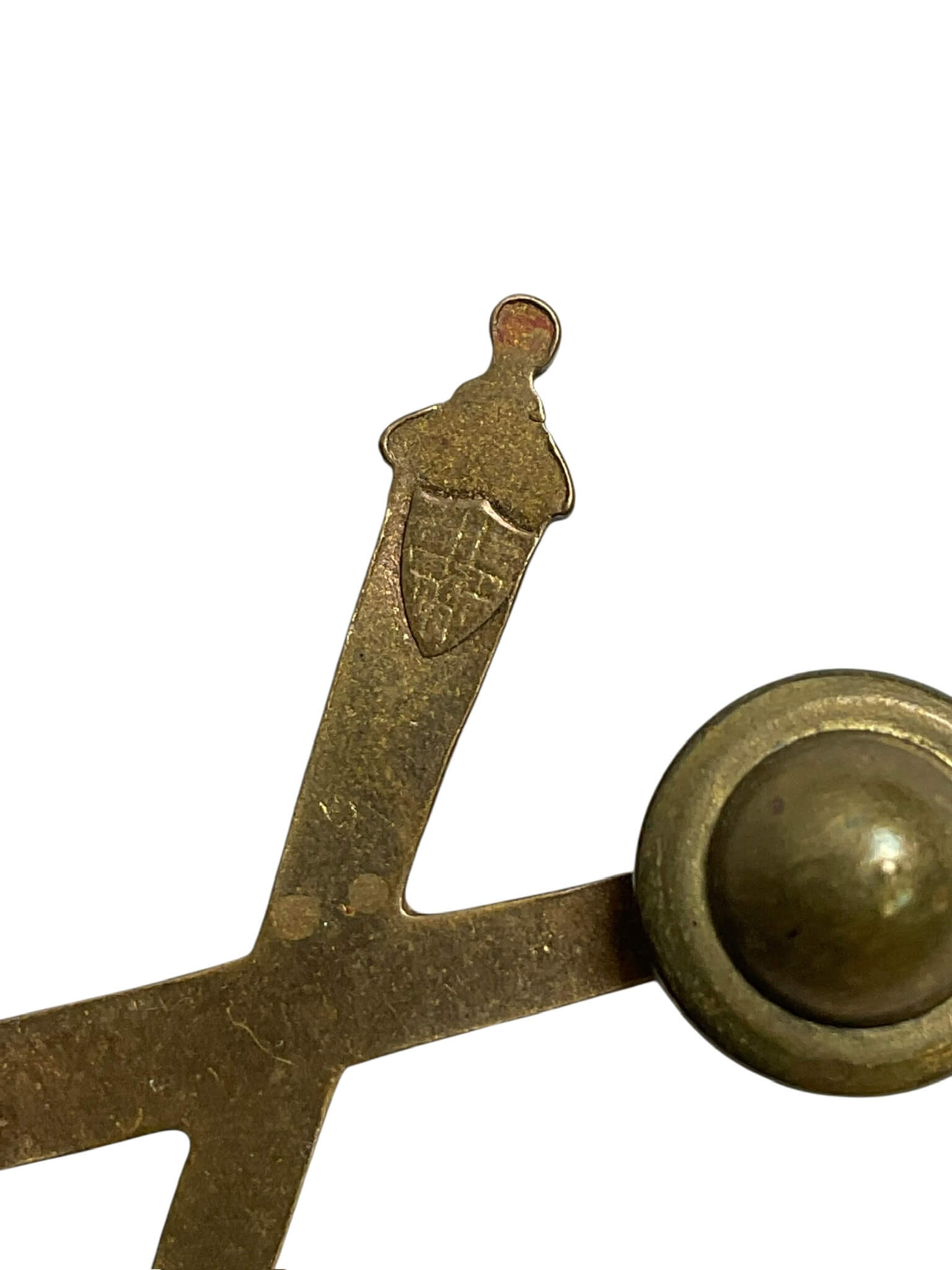This item is a rare, authentic WW1 US AEF Artillery Officers DUI Distinctive Uniform Insignia Collar Single. This historical artifact is a perfect representation of the Artillery Officers’ distinctive insignia in the American Expeditionary Forces during WW1. The insignia features the finely crafted design of crossed cannons, an emblem of the artillery, demonstrating the high standards of the US military during that era. The insignia is fastened to the collar, defining the officer’s rank and trade. Made of high-quality metal, it still maintains its original luster despite its age. This piece of history is an excellent collectible item for military enthusiasts, historians, or anyone interested in World War I memorabilia. The insignia tells a story of bravery, honor, and dedication of the artillery officers who served during the Great War.