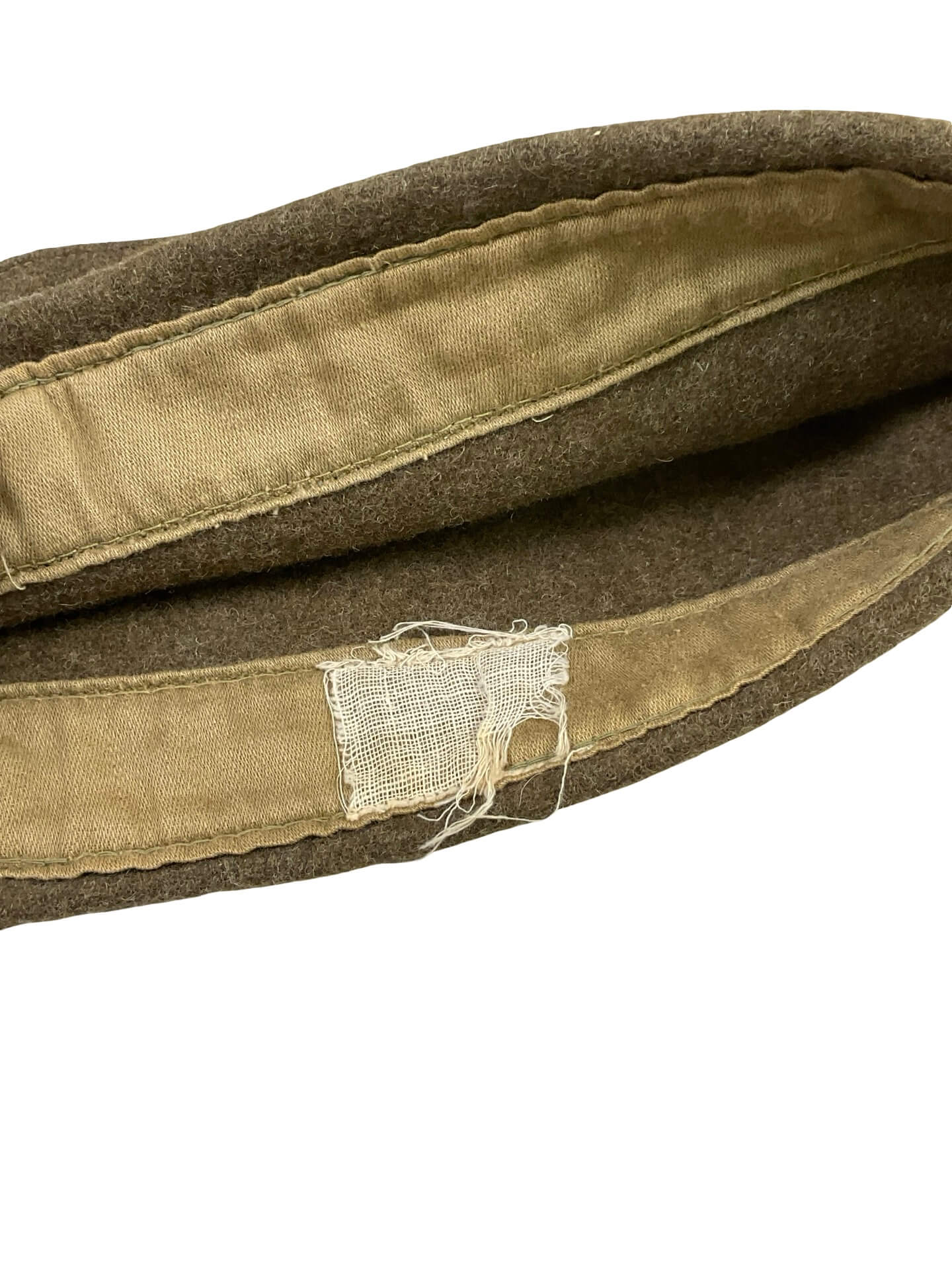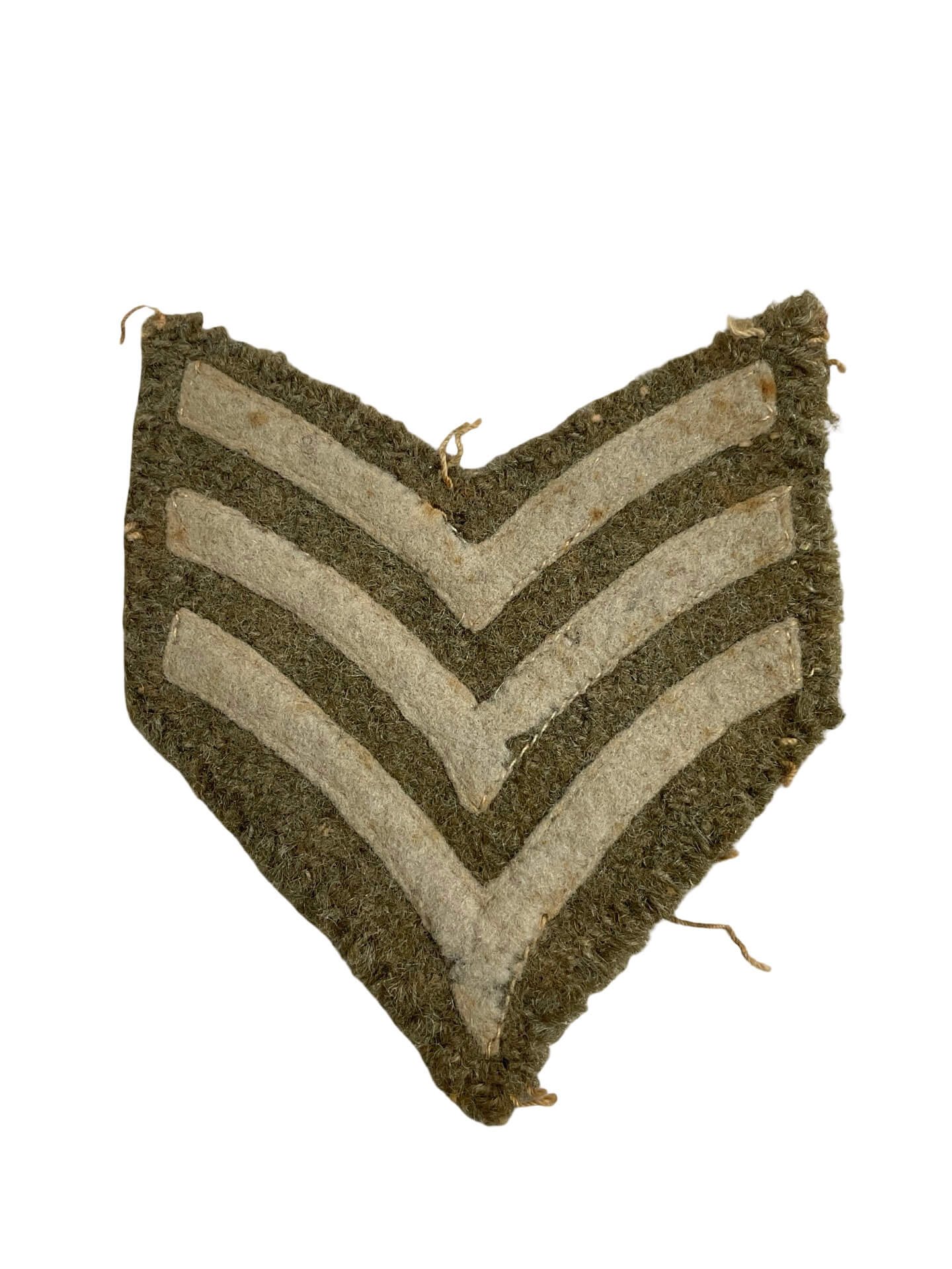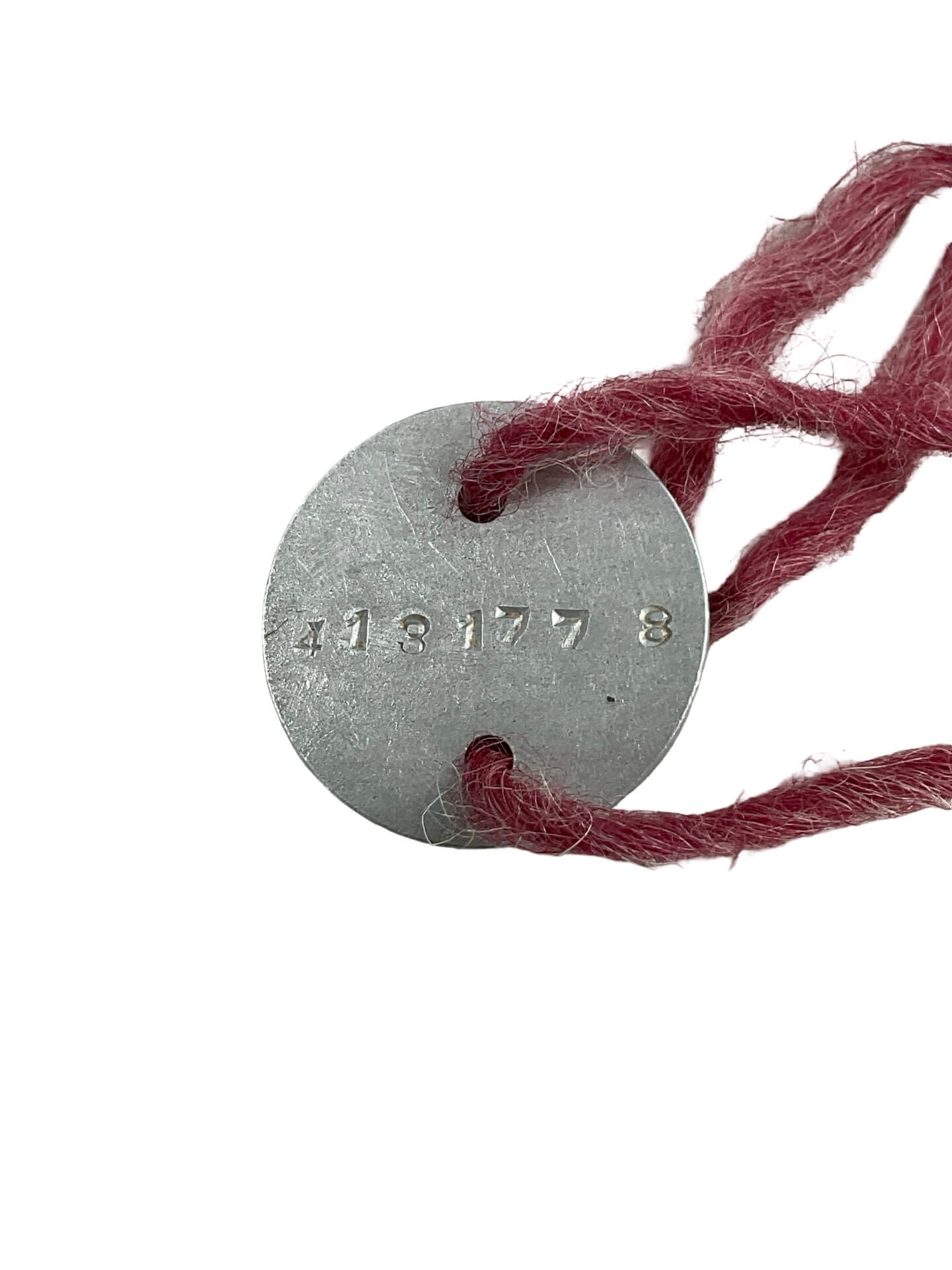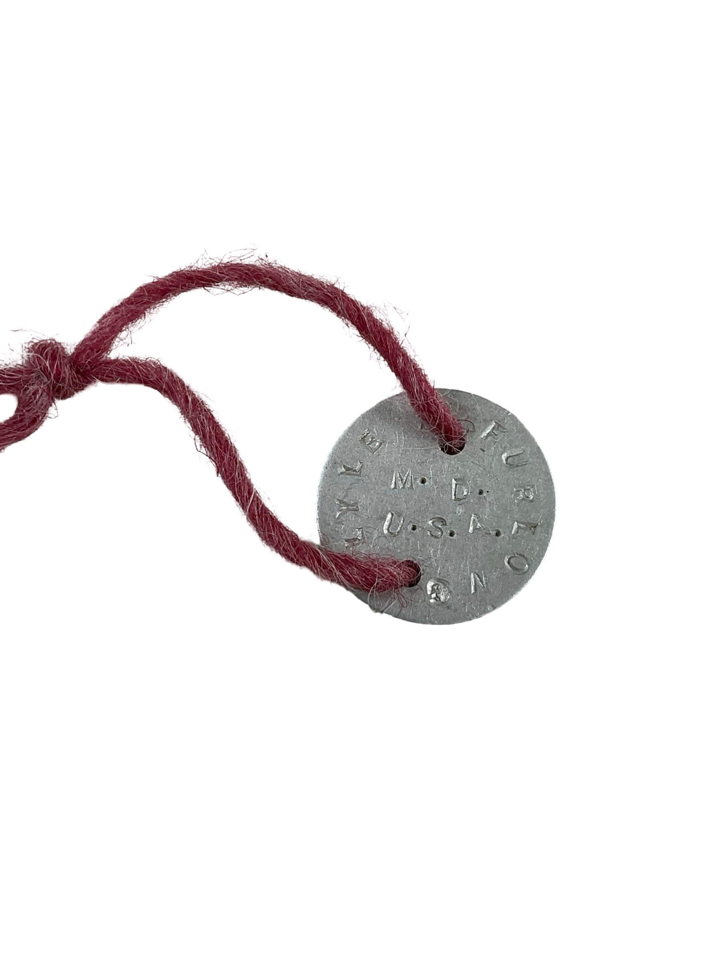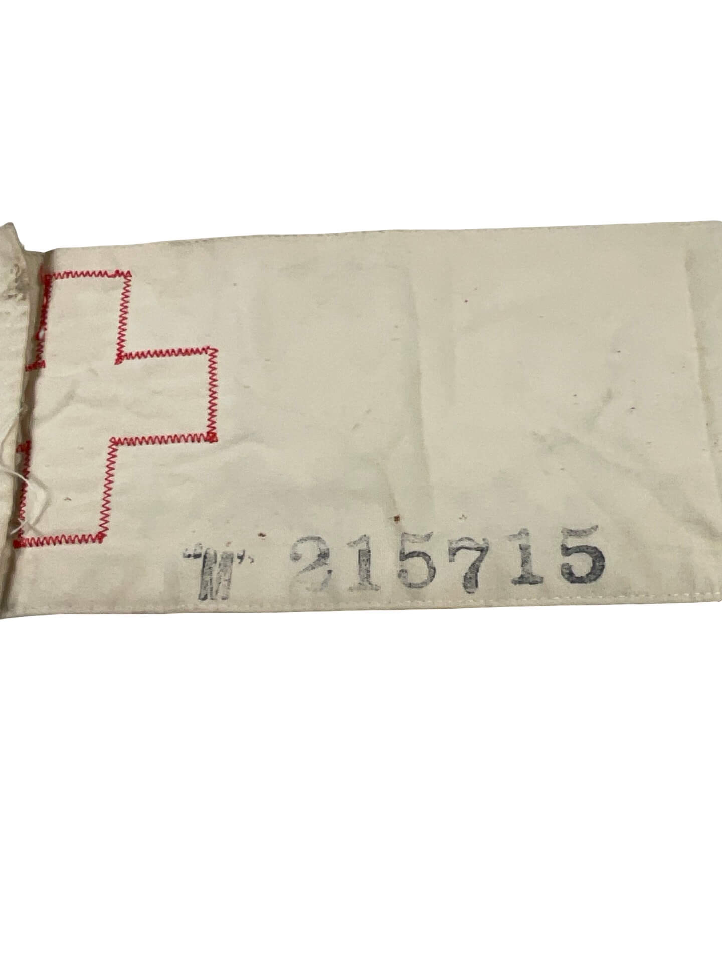This World War I U.S. Army AEF Special Services Sergeant’s Medic Tunic is an original uniform component from the 1917–1918 period. The tunic is constructed of olive drab wool and features the distinctive red cross medic insignia on the left sleeve, which identifies the wearer as a member of the medical personnel attached to the American Expeditionary Forces (AEF) in France. Sergeant chevrons are present on both sleeves, and the tunic retains original brass U.S. and Medical corps collar discs. Included with the tunic is the original dog tag assigned to the sergeant, providing direct personal identification. Accompanying the set is a packet of research documents, which detail the service history and background of the original owner, adding provenance and historical context. This ensemble represents the standard issue and insignia worn by non-commissioned medical staff responsible for frontline and support roles in the AEF during World War I.