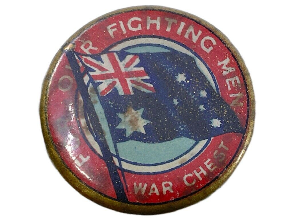 WW1 WW2 Australian For Our Fighting Men War Chest Button Home Front Donation Pin