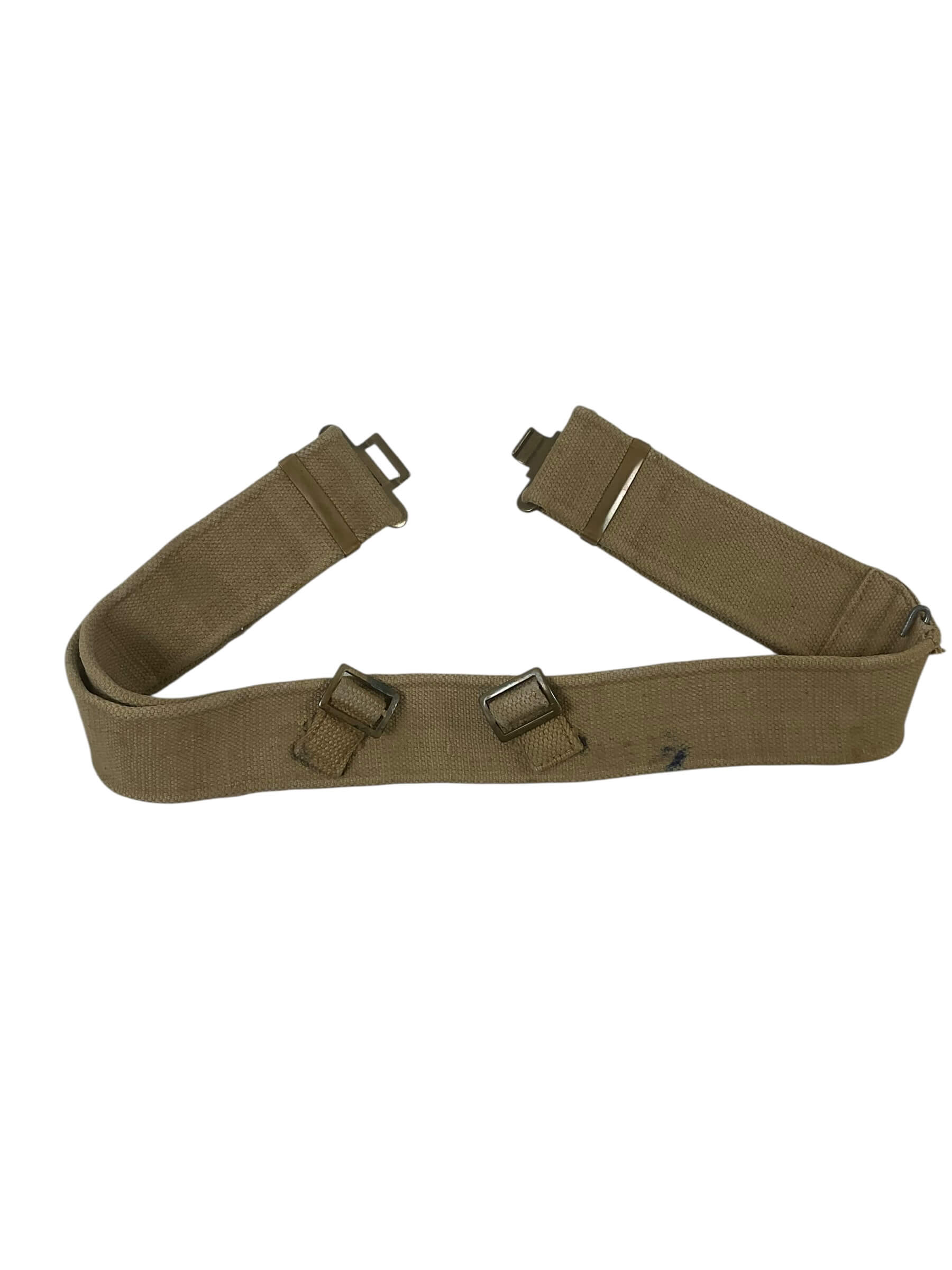 The WW2 British Army 37 Pattern Web Belt, marked with the Broad Arrow, is a standard-issue component of British military equipment introduced in 1937. Constructed from robust cotton webbing, this belt features a khaki finish for camouflage effectiveness and durability in a range of field conditions. The design includes brass hardware for fastening and adjustment, allowing compatibility with other elements of the 1937 Pattern web gear, such as pouches and braces. The Broad Arrow stamp is a government ownership mark identifying it as official military property. Widely distributed among British and Commonwealth forces during the Second World War, the 37 Pattern web belt formed the core of a modular carrying system. It played a crucial role in the field by supporting essential equipment, ammunition, and other gear. This item reflects a key development in military uniform design, emphasizing functionality, adaptability, and mass production for wartime needs.