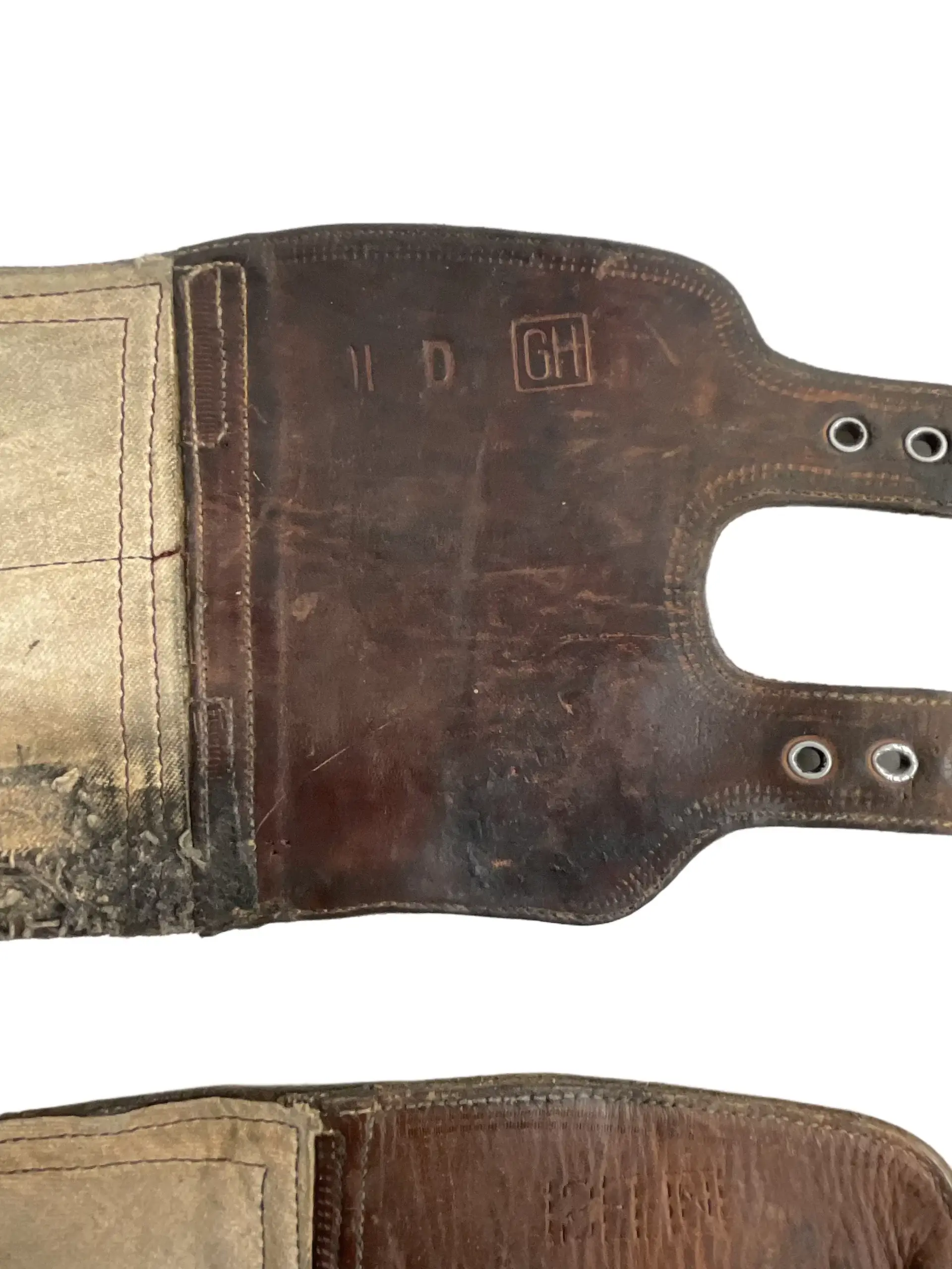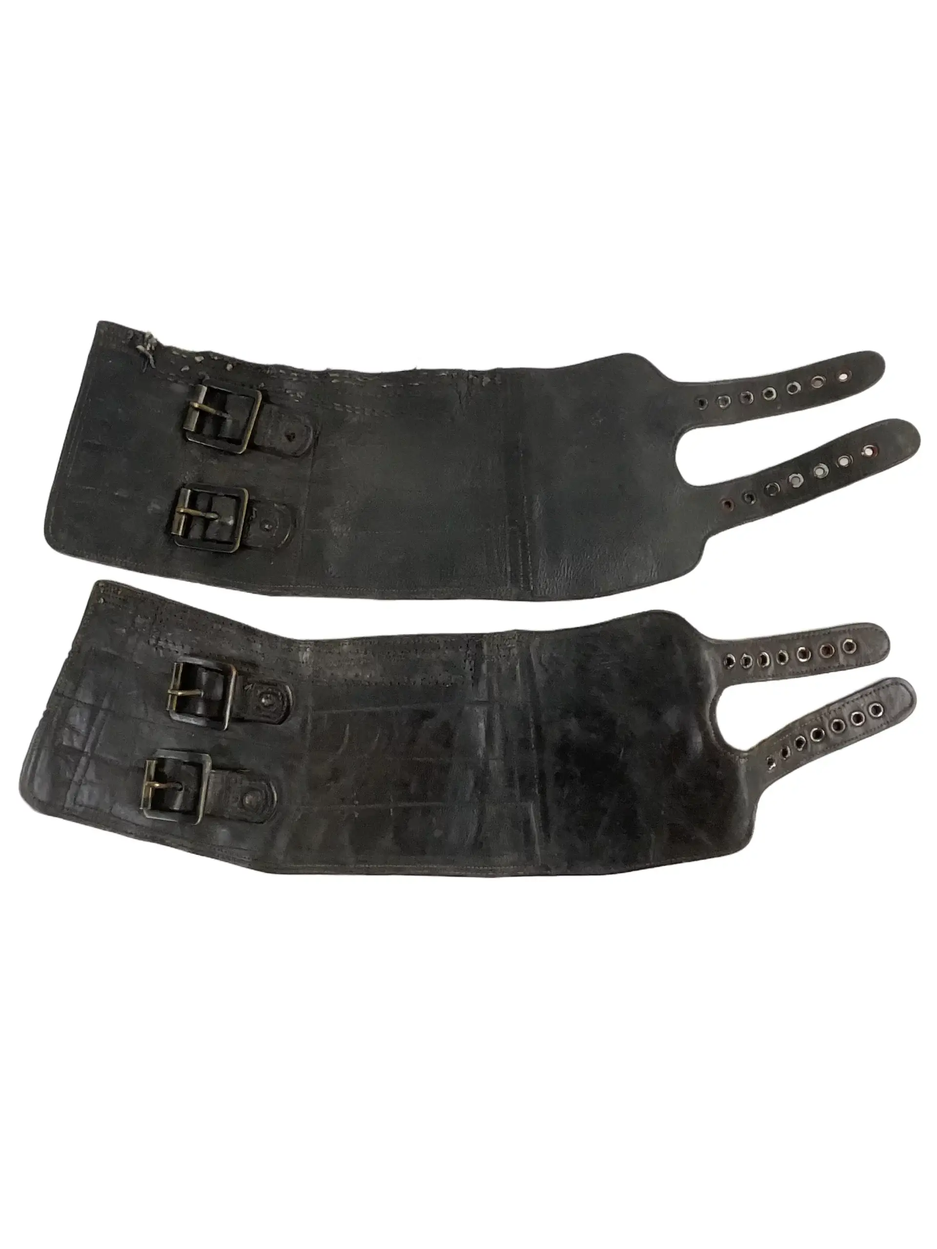 The WW2 British Army Black Leather Gaiters are original military issue leg coverings used by British forces during the Second World War. Constructed from durable black leather, these gaiters were designed to protect the lower legs and ankles from dirt, debris, and weather while providing support above standard-issue boots. Typically secured with metal buckles and fastening straps, the gaiters ensured a snug fit and helped prevent snagging or ingress of foreign objects during field activities. Their use was widespread among infantry and other service branches, especially in European or urban operational environments where additional leg protection was advantageous. The black leather variant represents a common pattern within British Army equipment of the era, reflecting both functional requirements and the material availability of the time. These gaiters are now collected as historical artifacts, illustrating standard issue personal equipment and uniform practices of the British military during the 1939–1945 period.