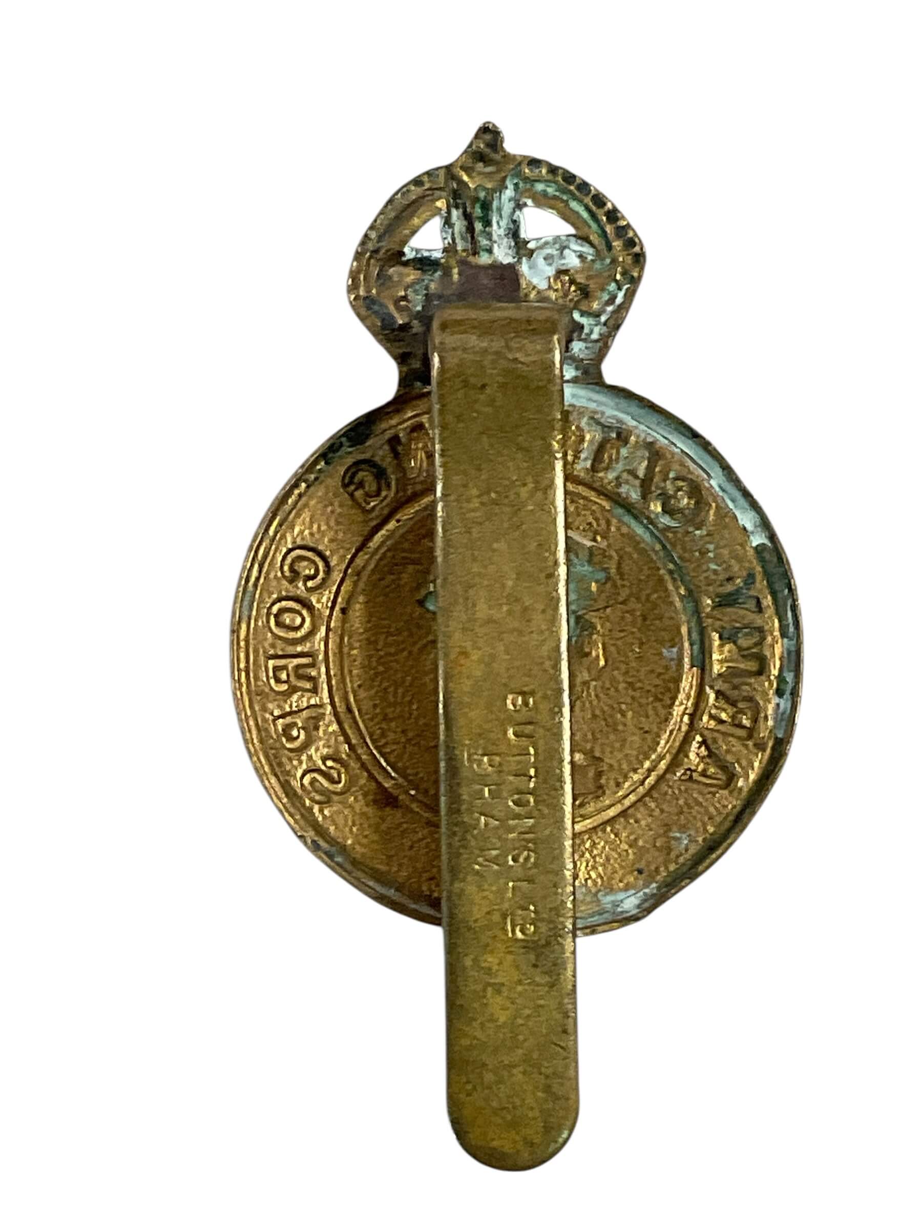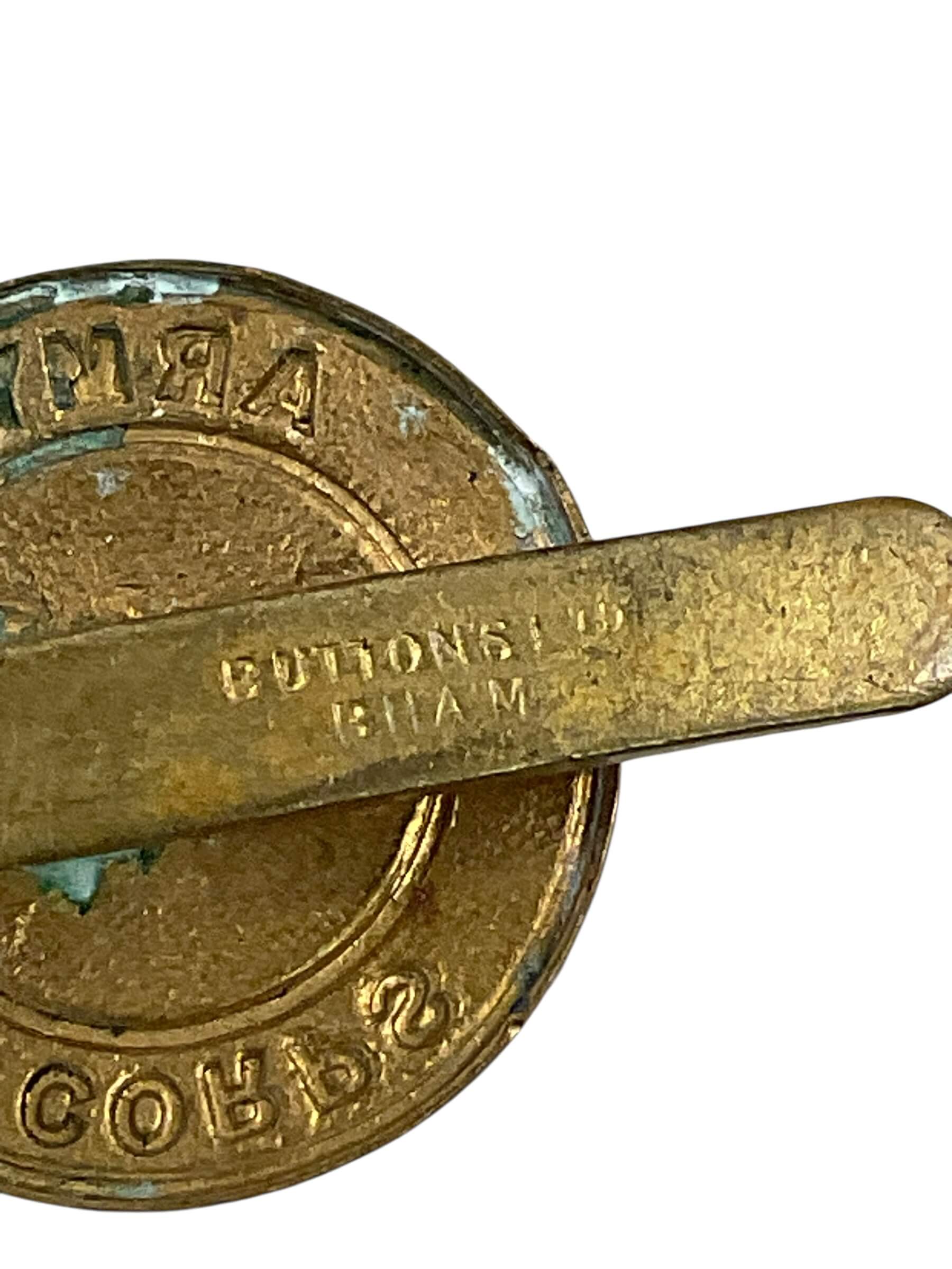 The WW2 British Army Catering Corps Cap Badge represents the branch responsible for providing food and rations to the British Army during the Second World War. Formed in response to the necessity of organized military catering, the badge typically features a design consisting of a central oval bearing a cook’s saucepan, crossed by a knife and fork, surmounted by a King’s Crown, and encircled by a laurel wreath. Constructed from brass or bi-metal, the badge was usually attached to the headdress of Catering Corps personnel. Its design elements symbolize the essential support function of the Corps within the army structure. The presence of the King’s Crown distinguishes it as a wartime and pre-1953 issue, as later badges featured the St. Edward’s Crown. The cap badge serves as a historical artifact, offering insight into the uniform insignia used by military support units in the mid-20th century British Army.