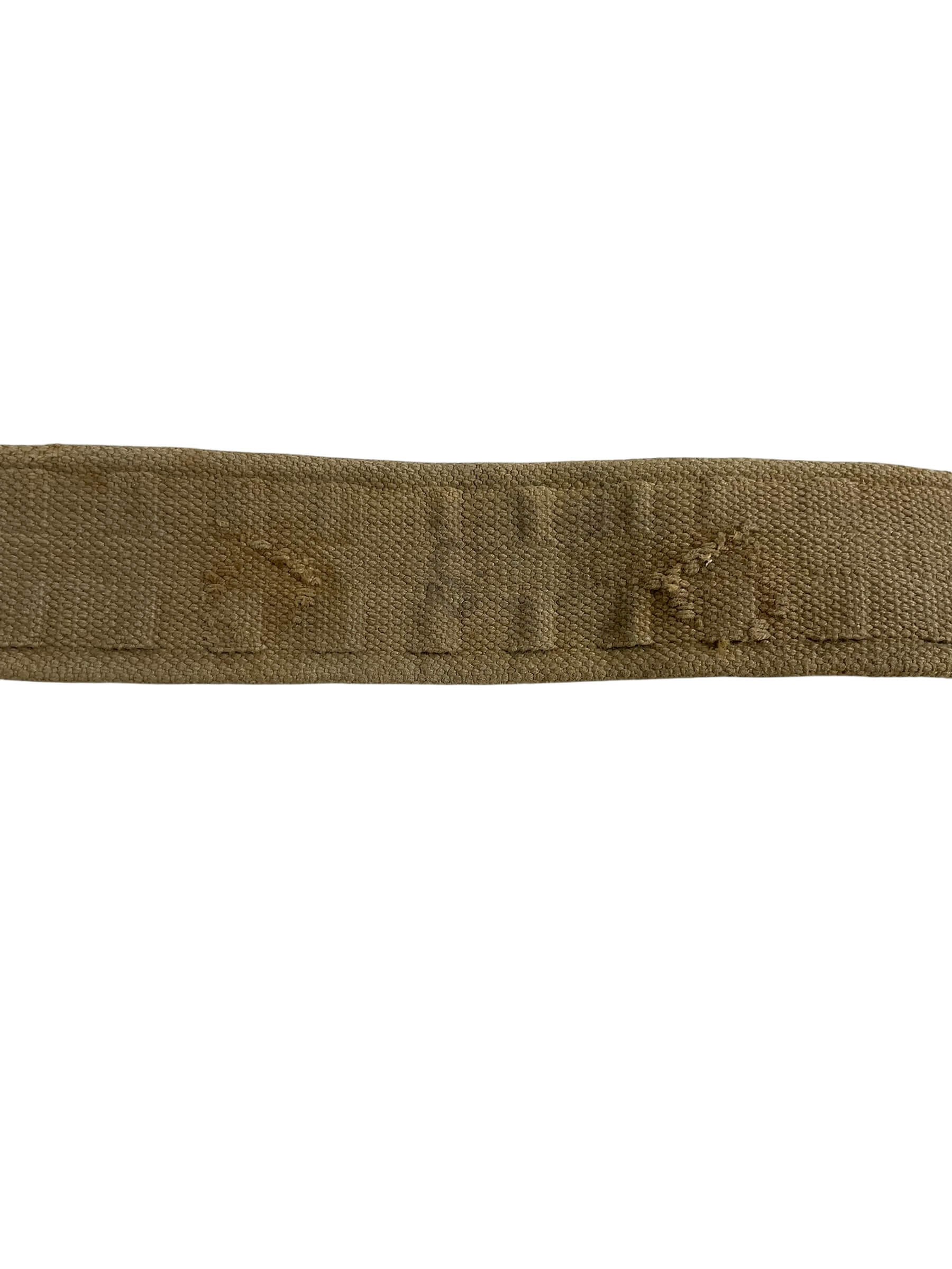 This is a unique piece of military history, a WW2 British Army Pattern 37 Web Belt Dated 1942 with Cheaters. This belt was used by British forces throughout World War II, reflecting the authenticity and historical significance of the period. Crafted from sturdy, rugged canvas, the belt showcases the robust construction necessary for warfare. It is an authentic artifact, marked with a 1942 date stamp, indicating its use in the thick of global conflict. The belt also comes with cheaters, small metal components that were used to adjust the belt’s length and fit. This piece is not only a fantastic collector’s item, but it also provides a tangible connection to the past. Its original markings and integral cheaters make it a standout in any collection of military memorabilia.