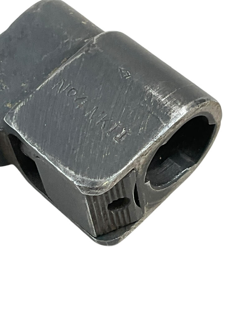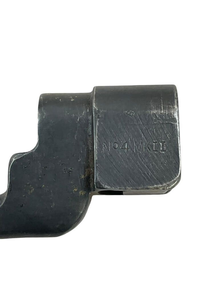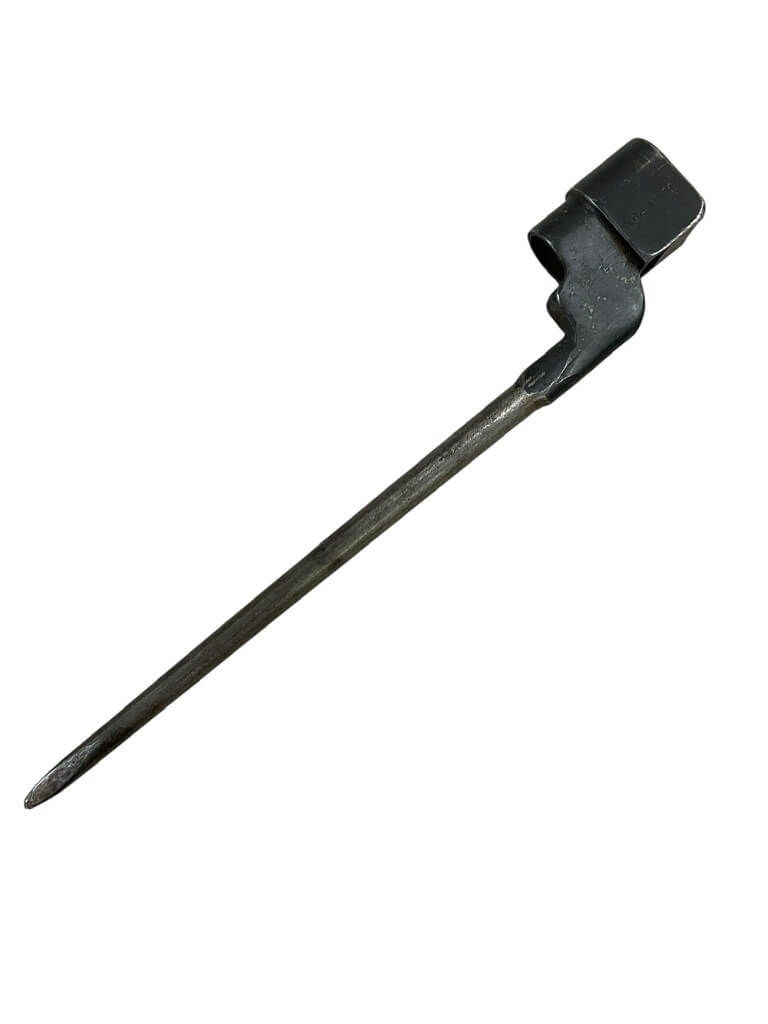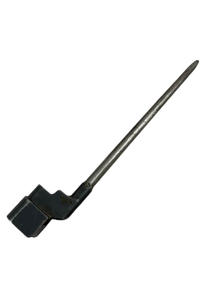 The WW2 British Army Spike Bayonet is a utilitarian edged weapon issued primarily to British and Commonwealth forces during the Second World War. Designed to fit the standard .303 Lee-Enfield No.4 rifle, this model replaced earlier blade and sword-type bayonets due to its streamlined manufacturing process and reduced resource requirements. The spike bayonet is notable for its simple construction: it features a steel rod, typically measuring approximately 8 inches in length, with a cruciform or simple pointed design for thrusting. The socket mechanism allows for secure attachment to the barrel of the rifle. Lacking a cutting edge, the spike bayonet was intended solely as a stabbing implement. Its production began in the early 1940s and continued throughout the war, reflecting wartime shortages and an emphasis on efficiency. This item serves as a representative example of British military adaptation in equipment design during World War II.