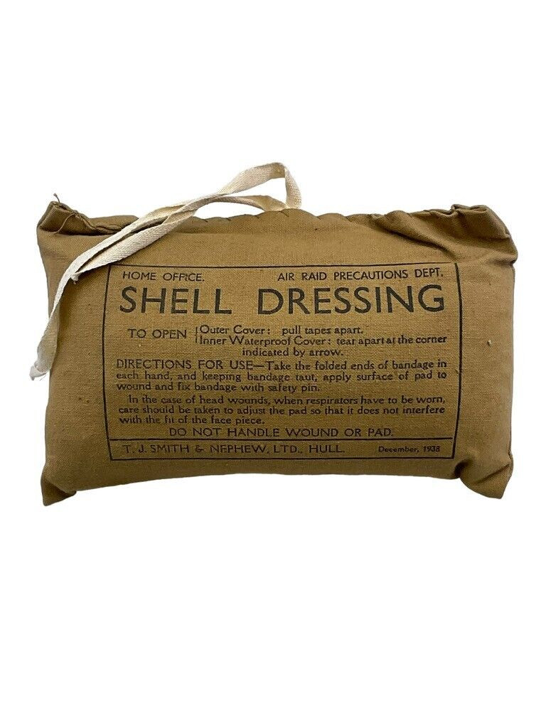 Title: **WW2 British ARP Air Raid Precautions Large Shell Dressing 1938 Dated** Description: This authentic artifact from World War II is a British ARP (Air Raid Precautions) Large Shell Dressing, dated 1938. ARP services played a pivotal role in civilian protection during air raids by providing essential first aid supplies such as this dressing. It was designed to treat and stabilize severe injuries caused by bombings and shrapnel. The dressing comes in its original packaging, a testament to the detailed and forward-thinking preparations of the era. This item not only represents a critical component of wartime medical history but also serves as a poignant reminder of the resilience and resourcefulness of the British people during the Blitz. It is an excellent addition for collectors of military memorabilia, historians, or anyone interested in the medical history of the Second World War.