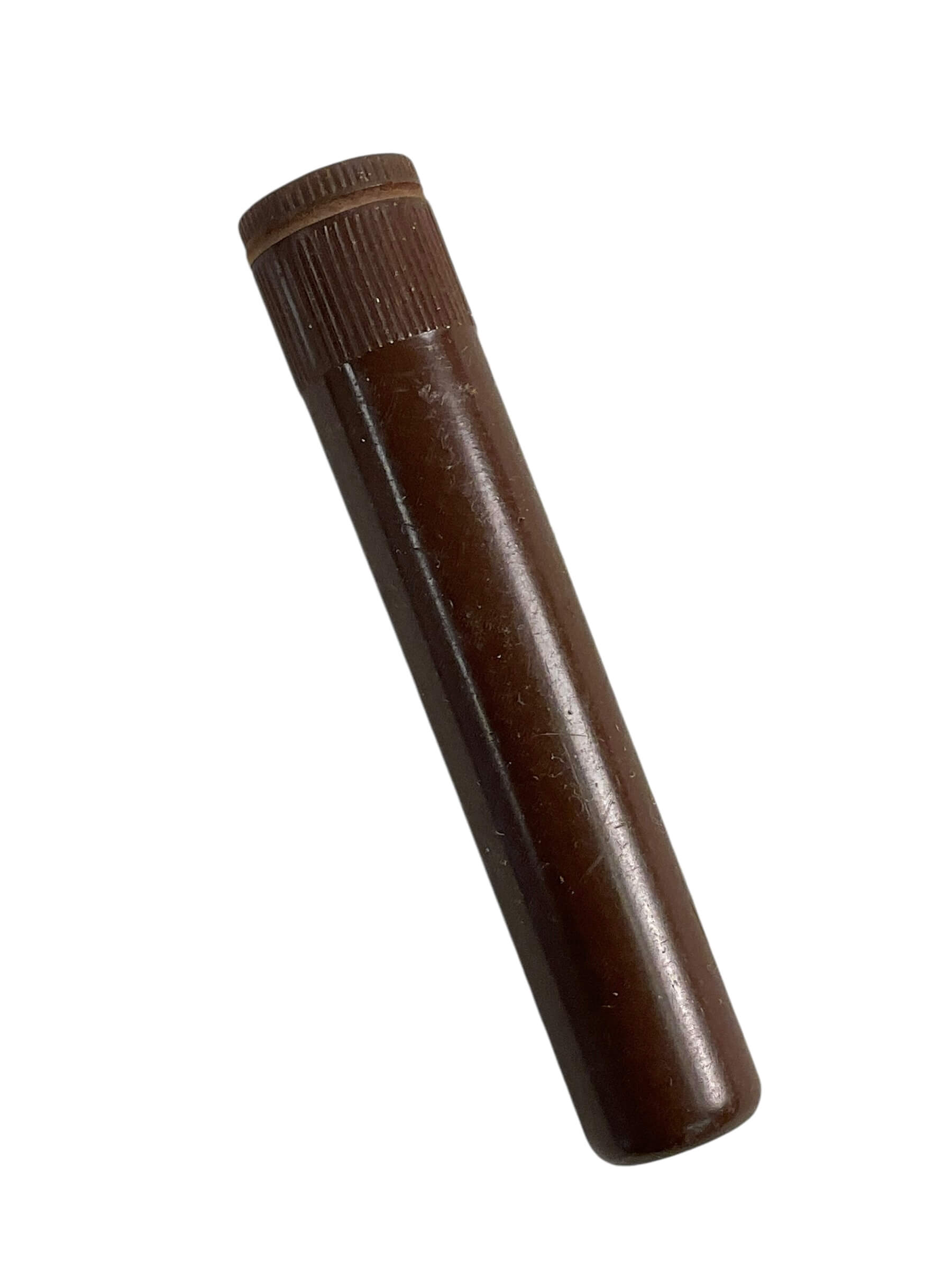 The WW2 British Bakelite Oiler is a piece of maintenance equipment originally issued to British military personnel during the Second World War. Constructed from durable Bakelite, an early form of plastic, this oiler was designed to provide a lightweight and corrosion-resistant alternative to traditional metal oilers. Its primary function was to supply small amounts of oil to firearms and other mechanical equipment, ensuring proper lubrication and reliable operation under field conditions. The oiler typically features a screw-top cap with an integral applicator, allowing precise application of oil to difficult-to-reach mechanisms. Compact in size, it could be easily carried in a soldier’s kit or webbing pouch. Bakelite oilers were a standard issue for various British forces and are distinguishable by their dark brown or black coloration and molded construction. Examples may bear manufacturer markings or broad arrow acceptance stamps. This item reflects the adaptation of new materials for military use during the era.