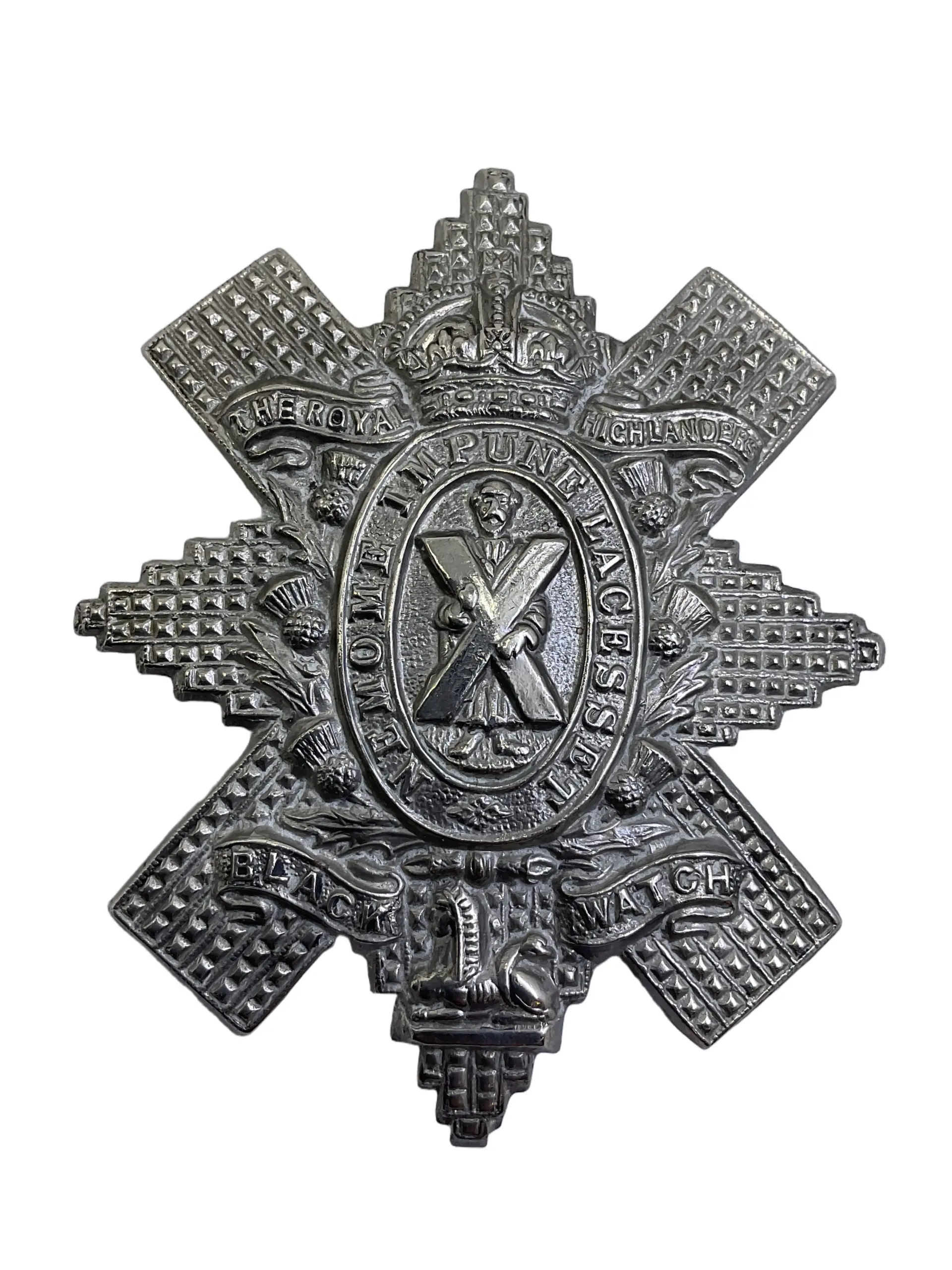 The WW2 British Black Watch Royal Highland Regiment Cap Badge is a distinctive military insignia worn by members of the Royal Highland Regiment, commonly known as the Black Watch, during the Second World War. The badge is crafted in a traditional star-shaped design, featuring a central motif of St. Andrew holding a saltire cross, encircled by a wreath of thistle leaves and surmounted by a crown. Inscribed across the outer band is the regimental title. Produced in metal, the badge was typically affixed to the soldiers’ headdress, such as the Tam o’ Shanter or Glengarry, serving as a symbol of regimental identity and pride. The Black Watch has a longstanding history within British military tradition, with its badges reflecting both heritage and function. This example is representative of the cap badges used during the 1939–1945 period and illustrates the emblematic elements associated with the regiment’s service in WW2.
