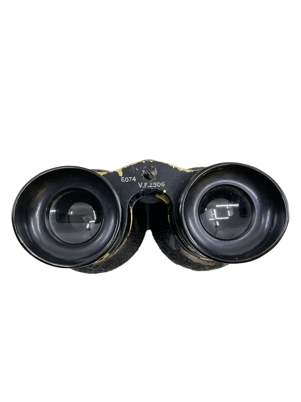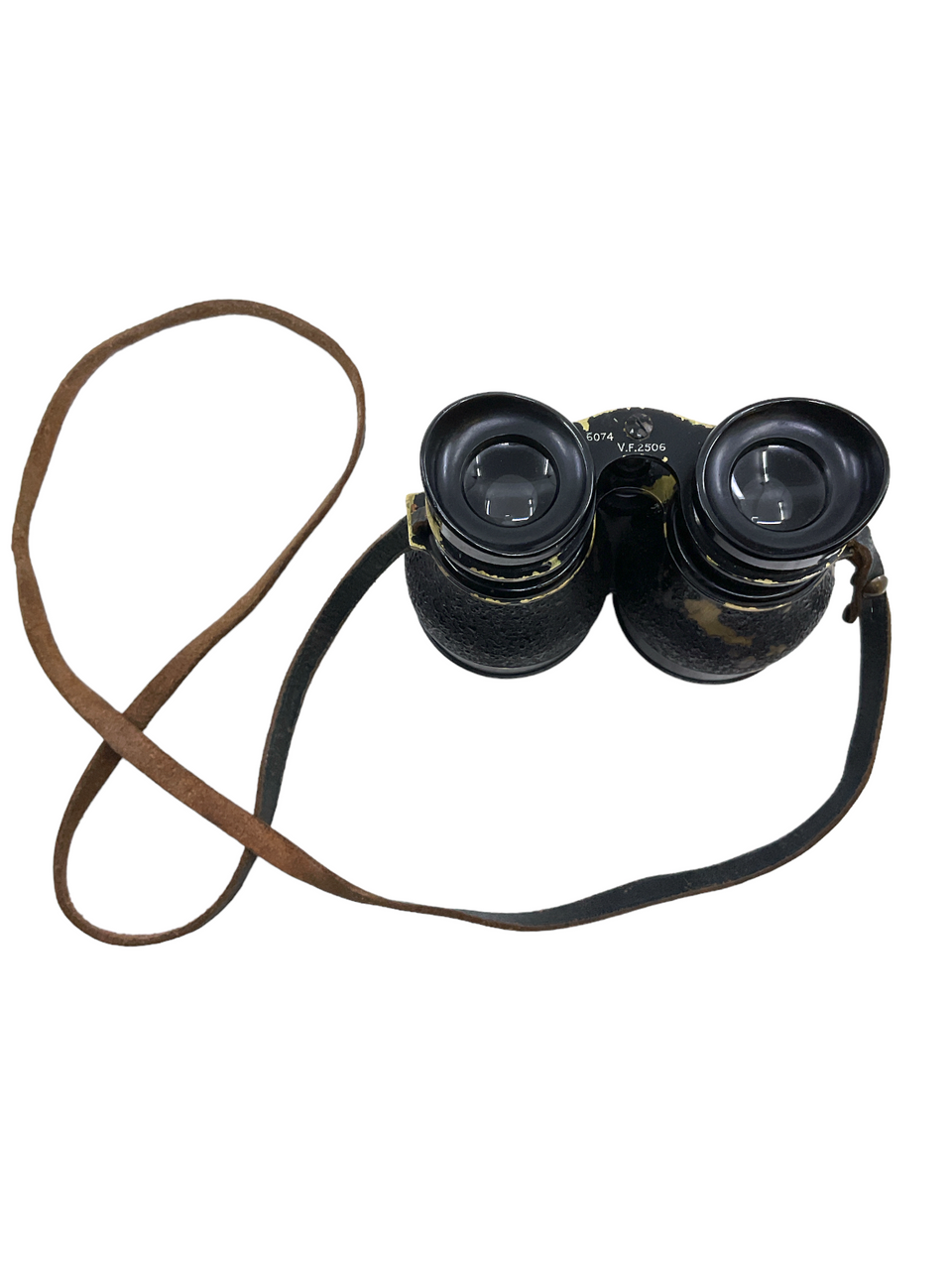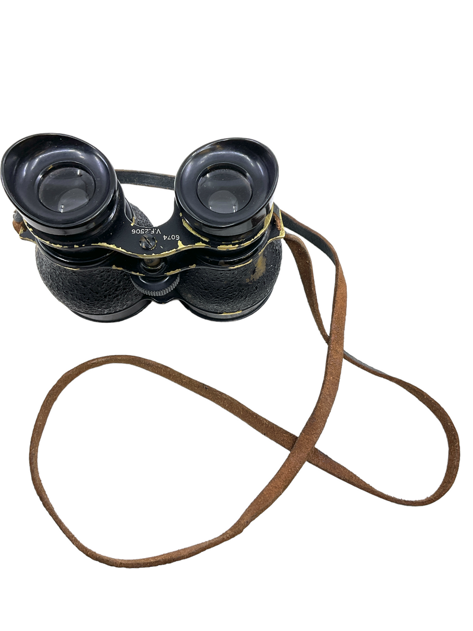 These vintage WW2 British Canadian 2 1/2 x 50 binoculars are a remarkable piece of history, offering both collectors and history enthusiasts a tangible connection to the past. Designed and used during World War II, these binoculars boast a 2 1/2 times magnification with a 50mm objective lens, providing clear and wide-field visibility that was essential for wartime observation. The binoculars come housed in a robust leather carry case that has stood the test of time, offering protection and adding to their historical authenticity. The leather case features durable stitching and a secure clasp, ensuring the binoculars remain safe during transport. This set is not only a functional optical instrument but also a beautifully preserved artifact that commemorates the bravery and technological advancements of the British and Canadian forces during the war. Whether displayed as a collectible or used for its intended purpose, this piece is sure to evoke a sense of appreciation for history and craftsmanship.