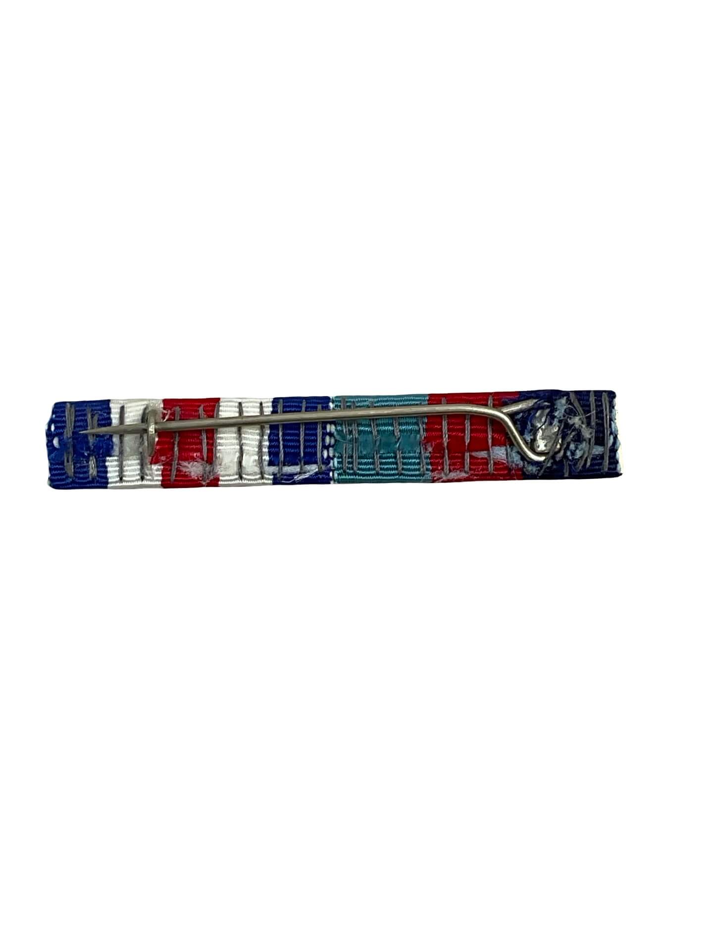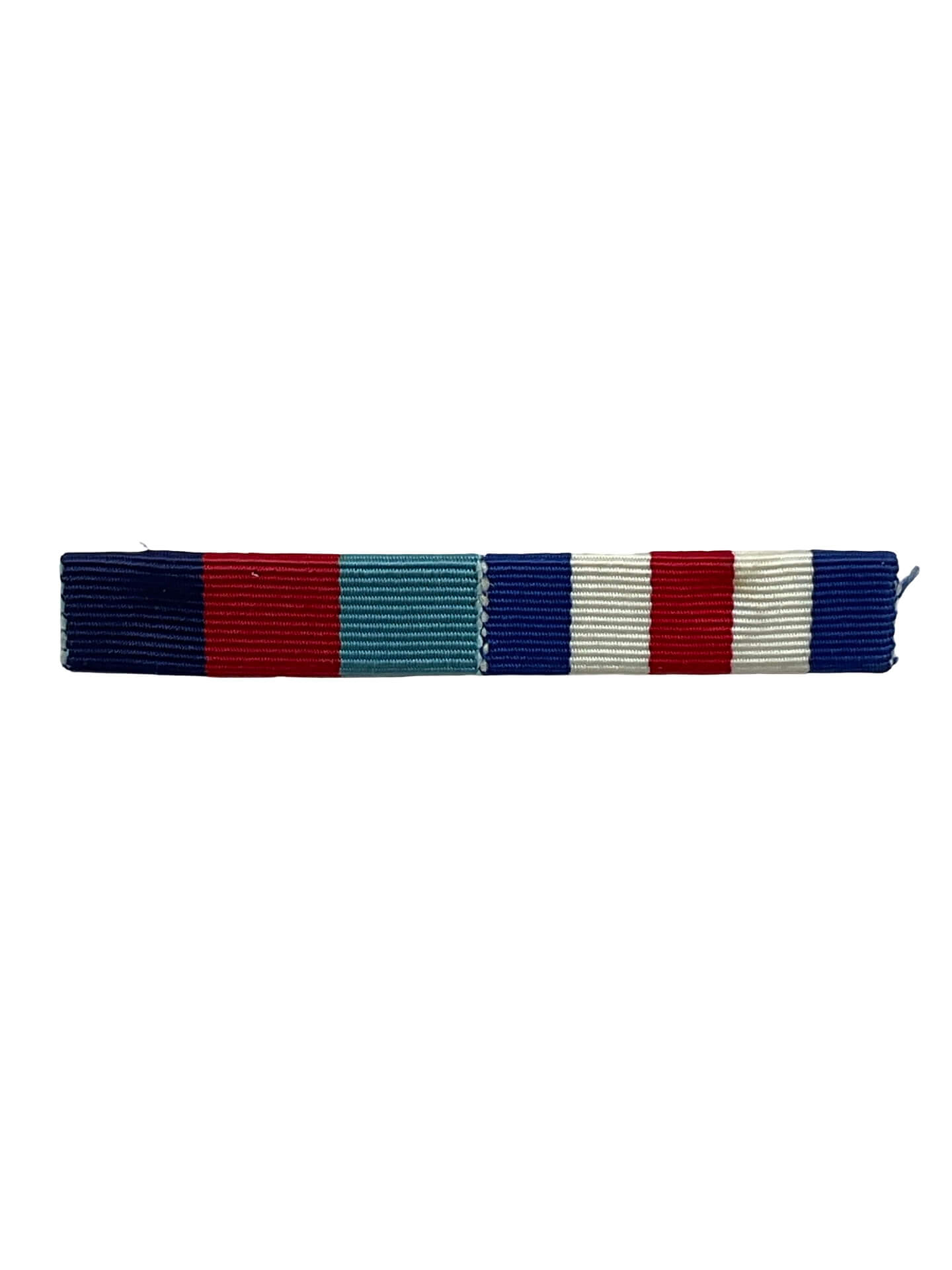 This item is a World War II-era British Canadian two-place medal ribbon bar. Such ribbon bars were commonly worn on the uniforms of servicemen to represent full-size medals awarded for military service, allowing for practical everyday display. The bar consists of two parallel ribbon segments, each corresponding to a specific campaign or service medal earned during the conflict. Constructed with fabric ribbons mounted on a metal backing with a pin attachment, the bar was designed for secure placement above the left breast pocket on battledress or service dress. The combination and sequence of ribbons followed official military regulations, denoting an individual’s honors and participation. Ribbon bars like this one provide historical insight into the recognition systems of the British Commonwealth armed forces during World War II and are of interest to collectors, historians, and researchers studying military decorations and personal military history. The piece reflects standard issue and customary use among both British and Canadian personnel.