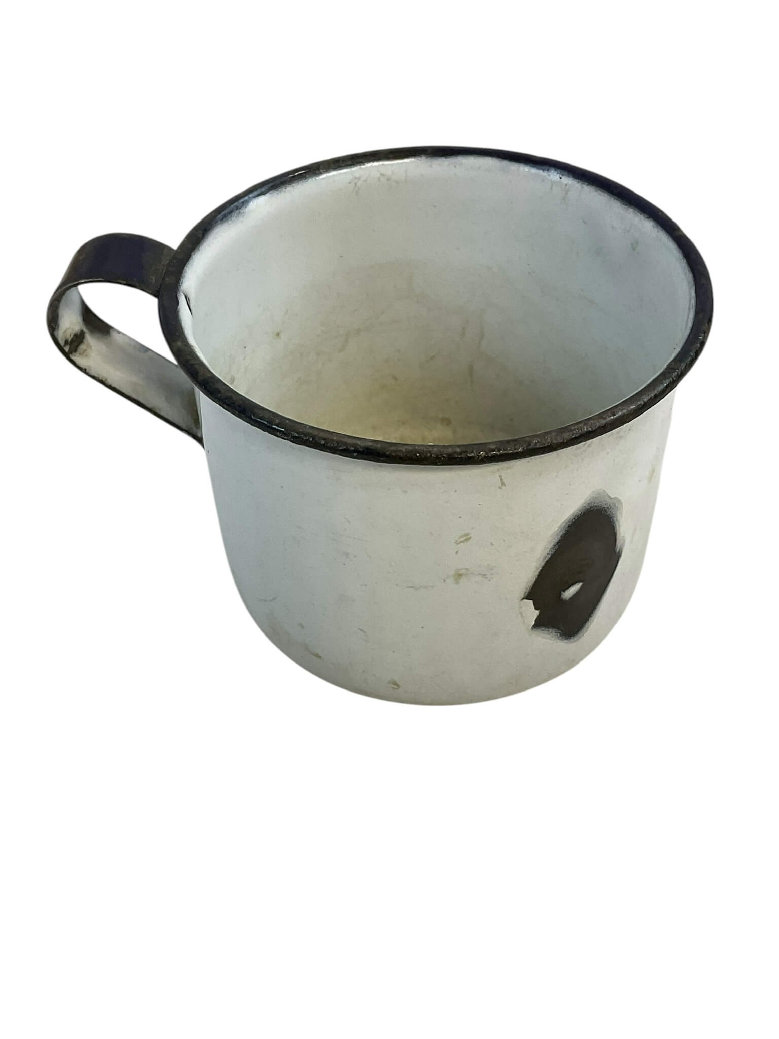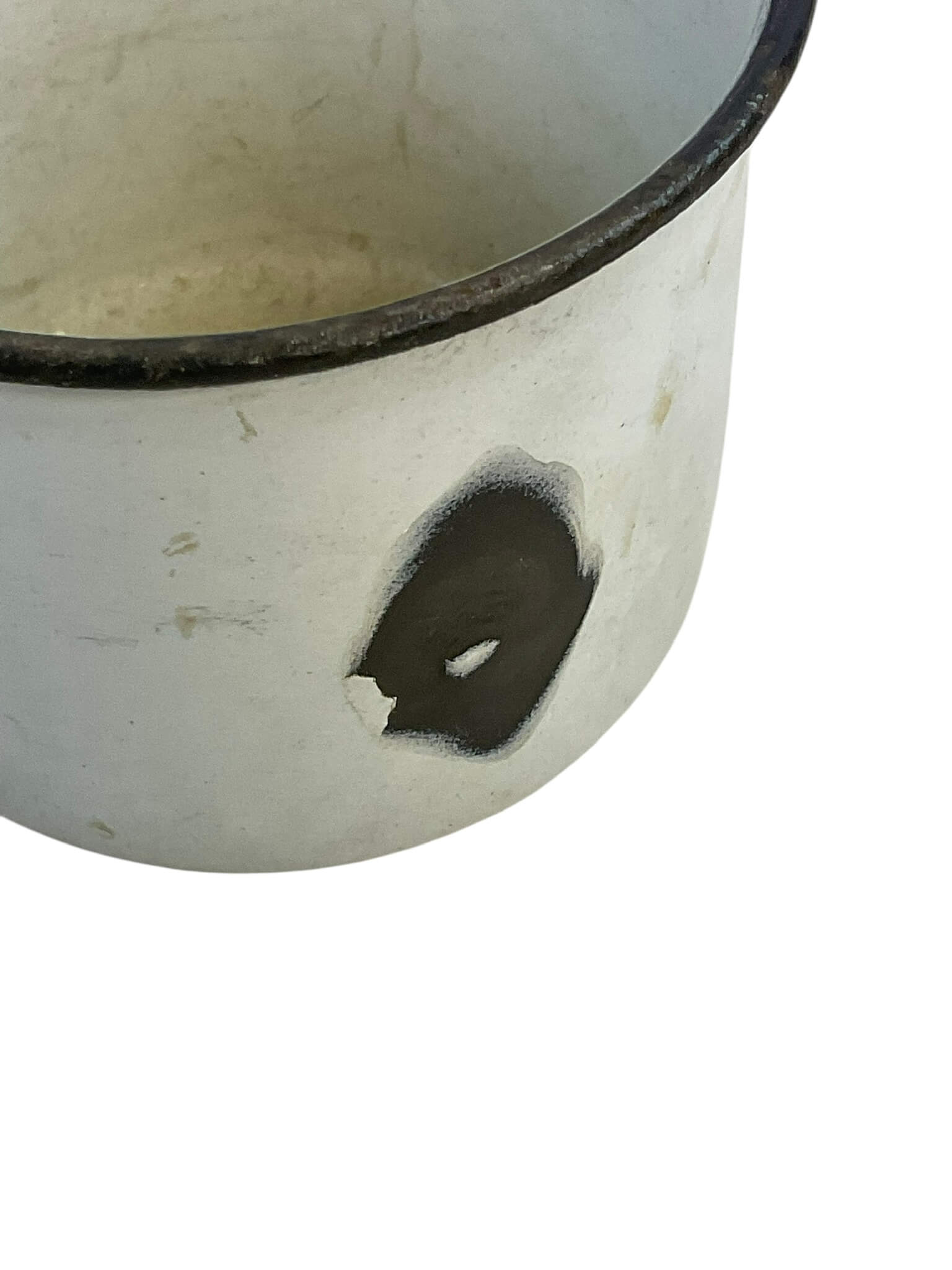 This WW2 British Canadian Enameled Steel Cup is a remarkable piece of military history. Made during the 1940s, it was standard issue for British and Canadian soldiers throughout World War II. The cup is crafted from durable steel and coated with a layer of enamel, a common practice of the era to prevent rusting and to increase longevity. It features a classic design with a simple, round shape and a sturdy handle, designed for functionality and ease of use in the field. Its solid construction testifies to the hardy and practical nature of military equipment of the time. Despite its age, the cup retains its original white enamel finish, with few signs of wear and tear. This authentic, vintage enameled steel cup is not just a utilitarian object, but a tangible connection to the past, providing a unique insight into the everyday life of soldiers during World War II.