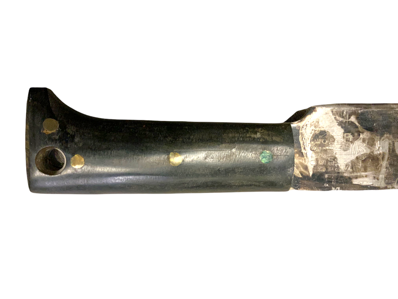 This exceptional piece is a British-Canadian machete from World War II, complete with its original leather scabbard. Noteworthy for its impeccable condition, this machete has been meticulously preserved, earning the ‘MINT’ status, which is rarely seen among wartime artifacts. The blade remains sharp and untarnished, reflecting the superior craftsmanship typical of military equipment from that era. The leather scabbard, robust and well-made, has retained its durability and suppleness over the decades. This machete was likely used by British and Canadian forces, making it a significant collectible for enthusiasts of military history. Whether you are a seasoned collector or someone with a keen interest in World War II memorabilia, this machete and scabbard set offers a tangible connection to the past, embodying the resilience and craftsmanship of the soldiers who once carried it.
