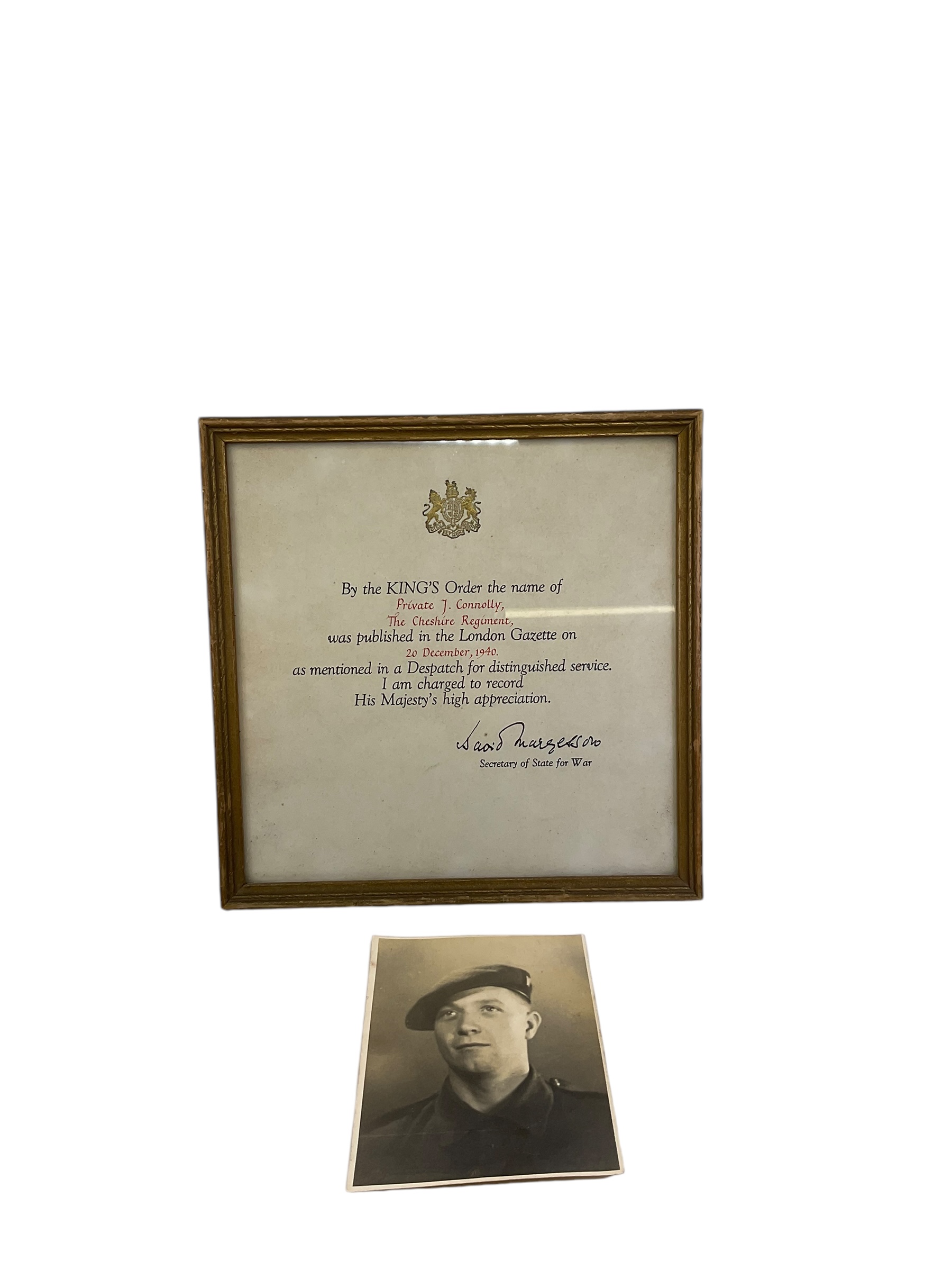 This collection presents a significant piece of history from the World War II era, featuring an authentic service pay book, photos, and a Mentioned in Dispatches (MID) Certificate all belonging to a soldier from the renowned British Cheshire Regiment. The items provide a fascinating insight into the soldier’s life during the conflict, including his service at the pivotal Battle of Dunkirk. The pay book includes detailed entries of the soldier’s service and monetary dues, while the photos provide a personal touch, showing the soldier in various settings. The MID Certificate is a commendation for brave or meritorious service, serving as a vivid testament to the soldier’s heroism. This collection is a must-have for any military history enthusiast or collector, offering a tangible connection to the past and the individuals who shaped it.