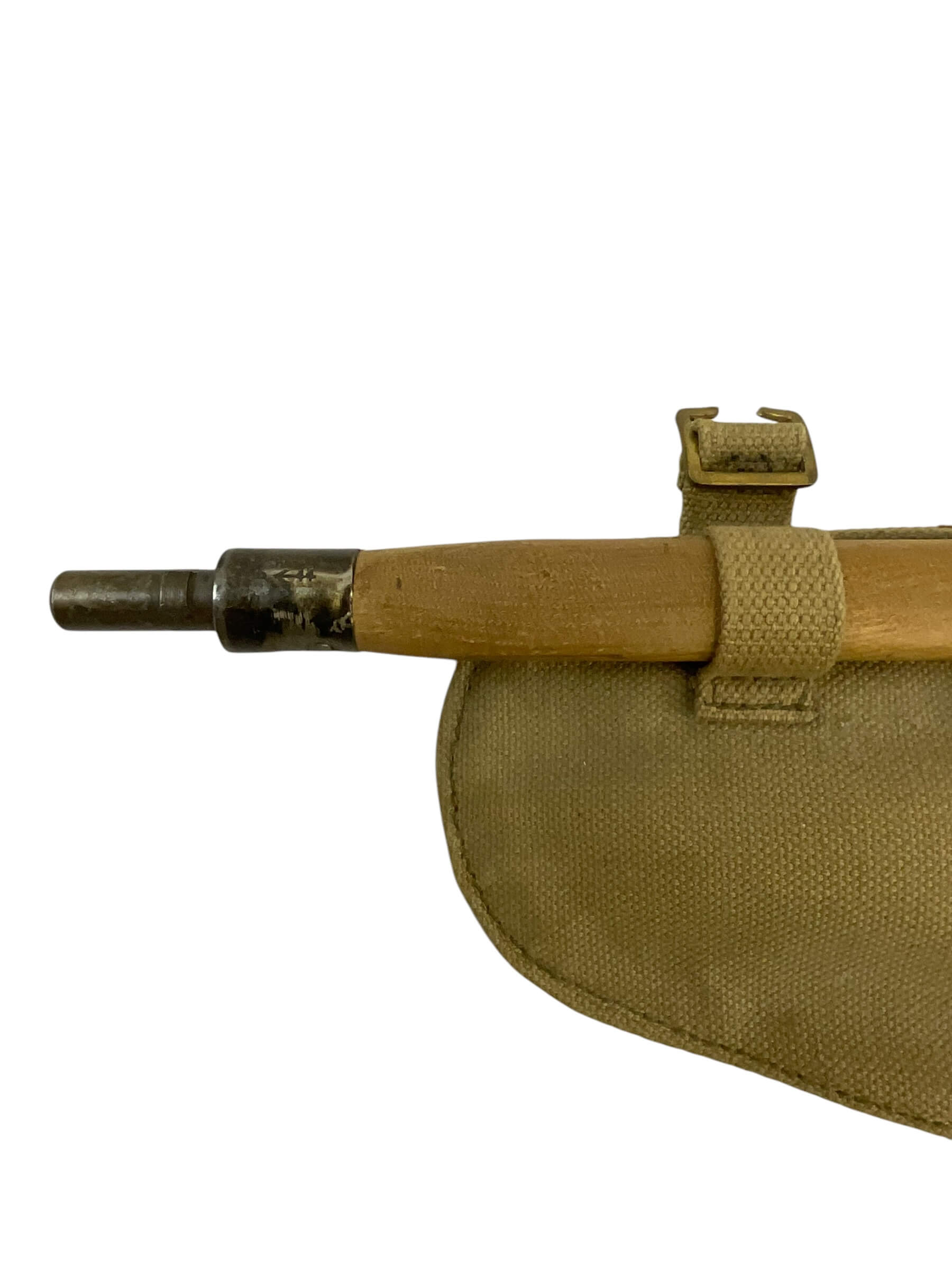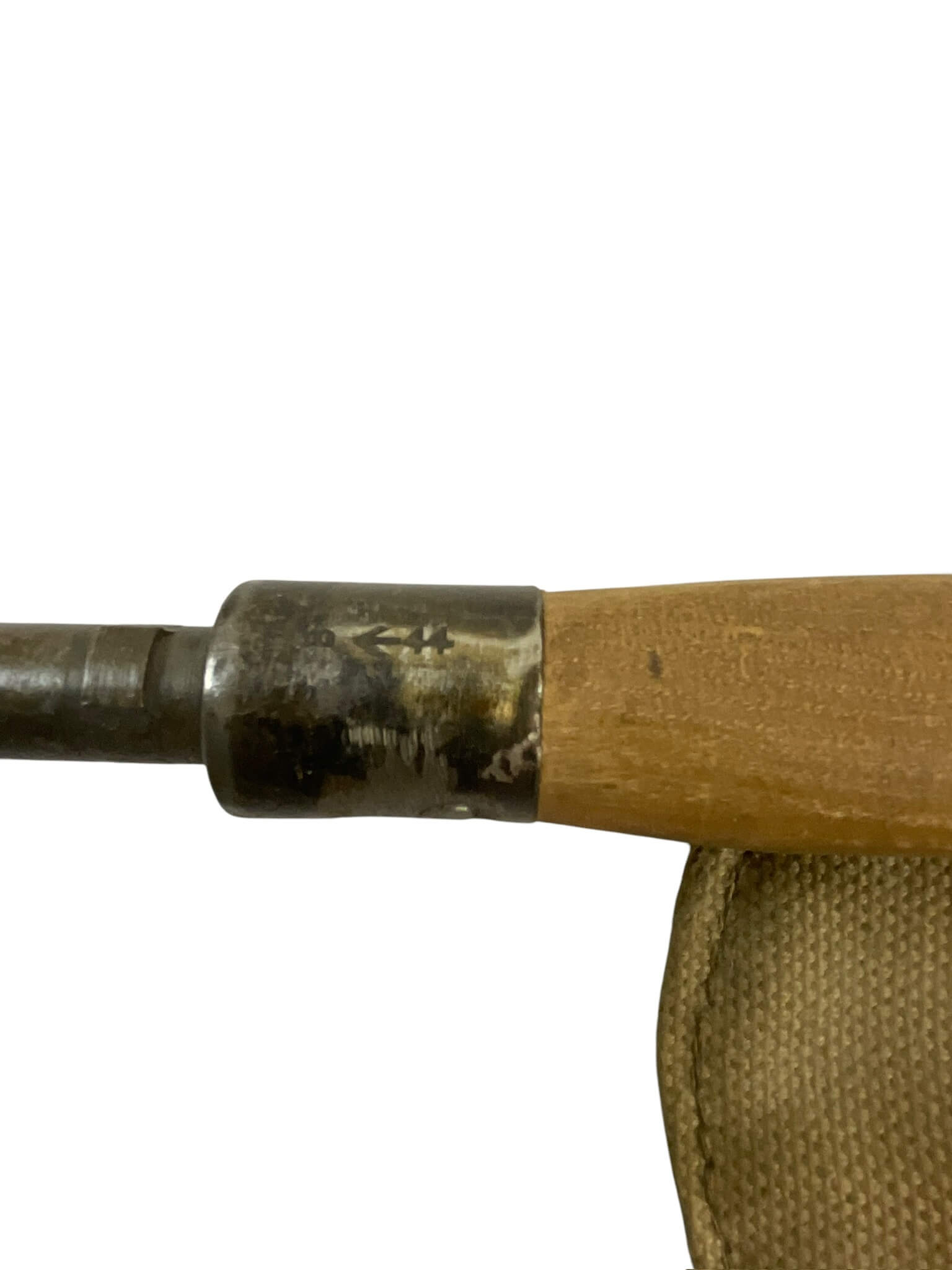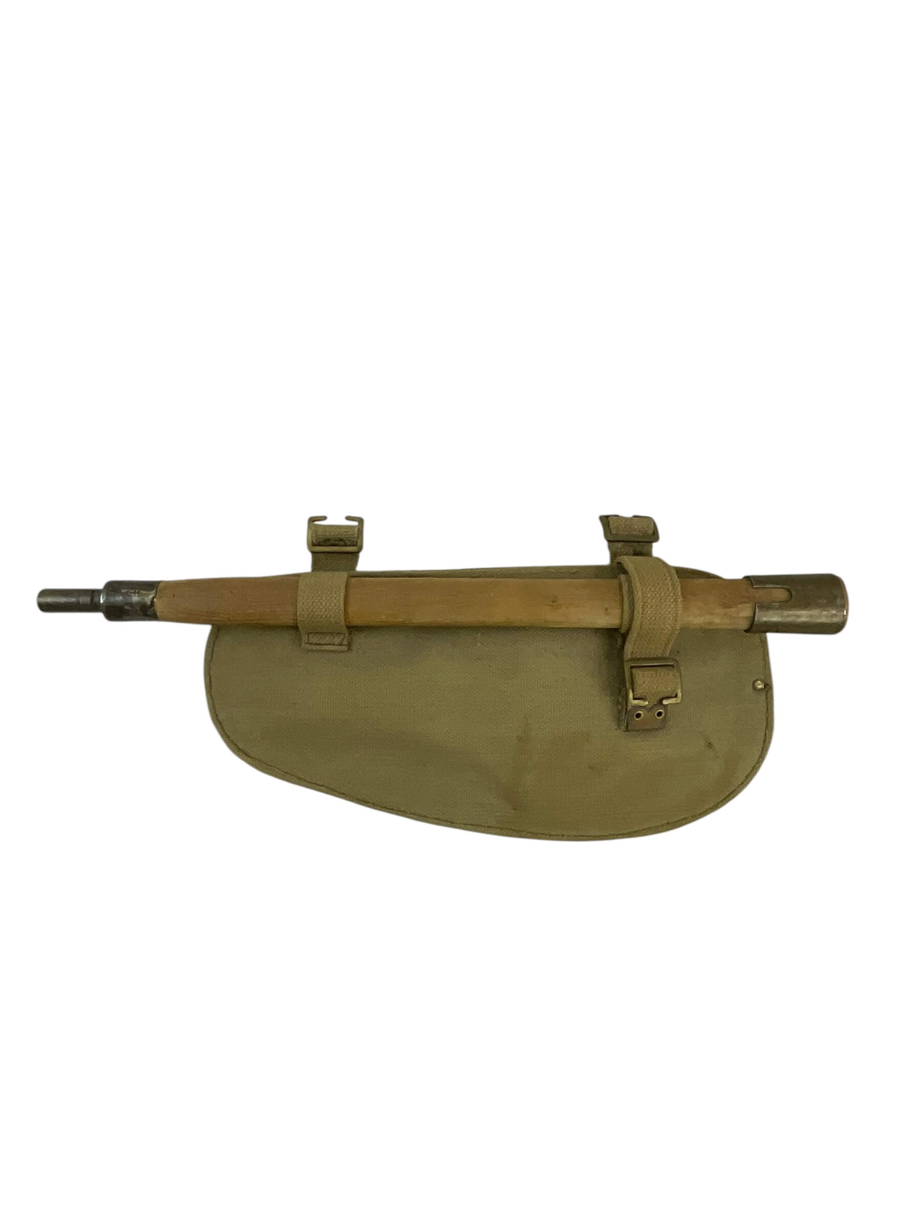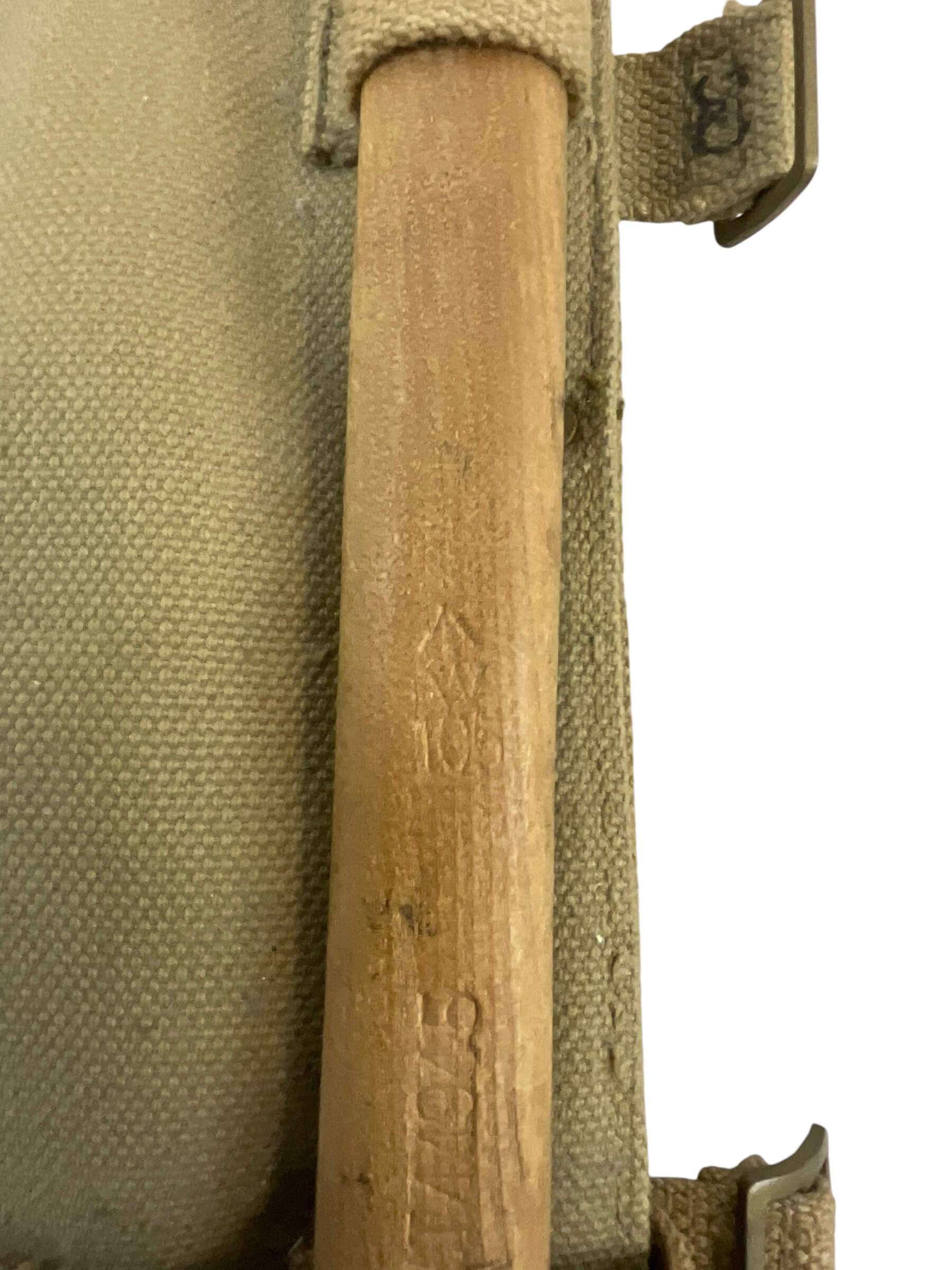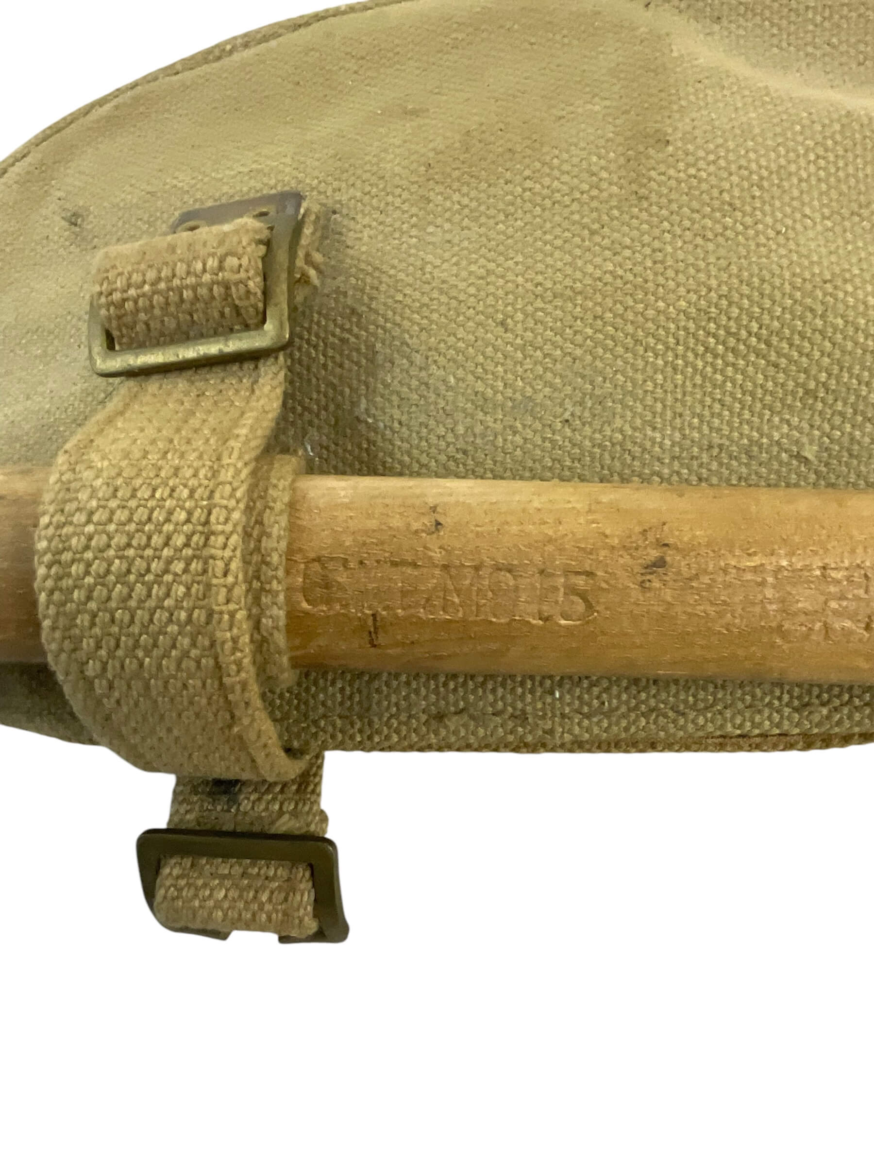 This is an authentic WW2 British E-Tool Shovel from 1944, a rare find for history enthusiasts and collectors alike. The E-Tool, also known as an entrenching tool, was an essential piece of equipment for soldiers during the Second World War, used for a variety of tasks from digging foxholes to close-quarters combat. This particular item is complete, boasting an original wooden handle and metal shovel head. Despite its age, the tool is in remarkable condition, showcasing the robust quality of British wartime manufacturing. The year 1944 is clearly stamped on the metal, providing a poignant reminder of a pivotal time in world history. This piece is more than just a shovel; it’s a tangible link to the past and a testament to the resilience of those who served.
