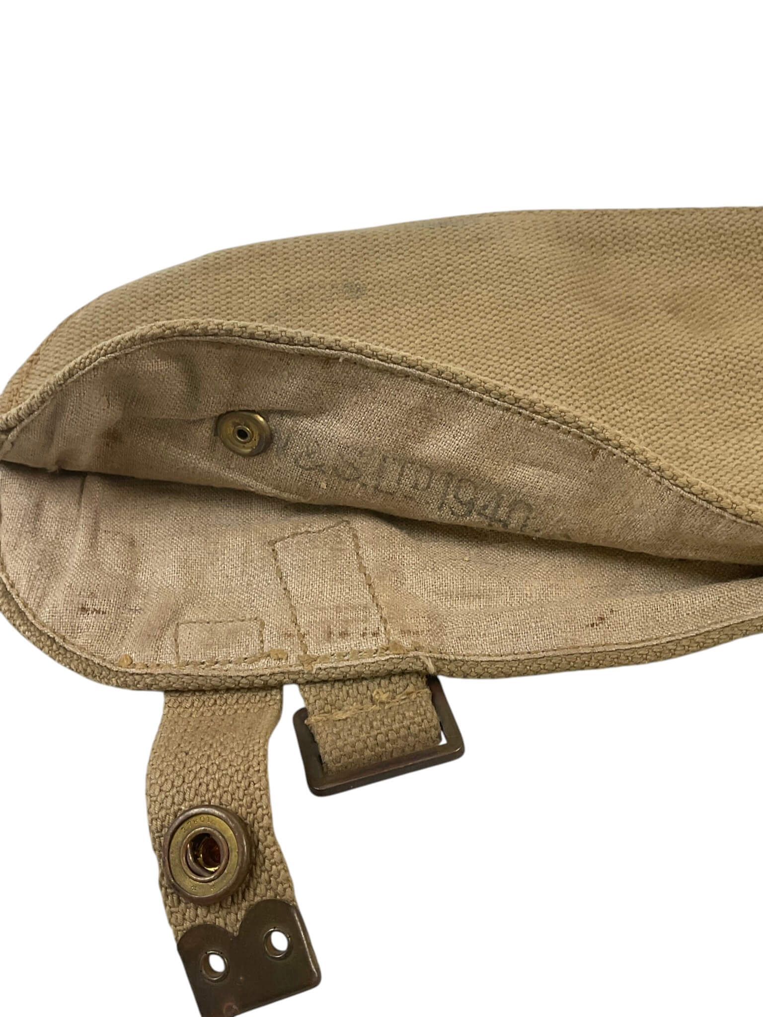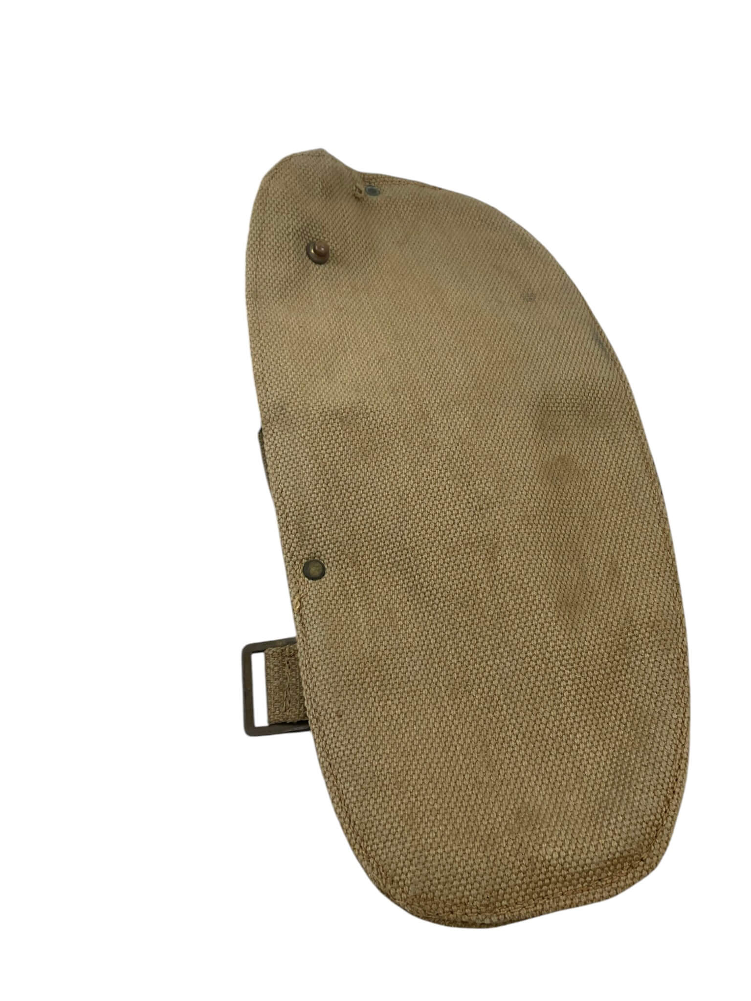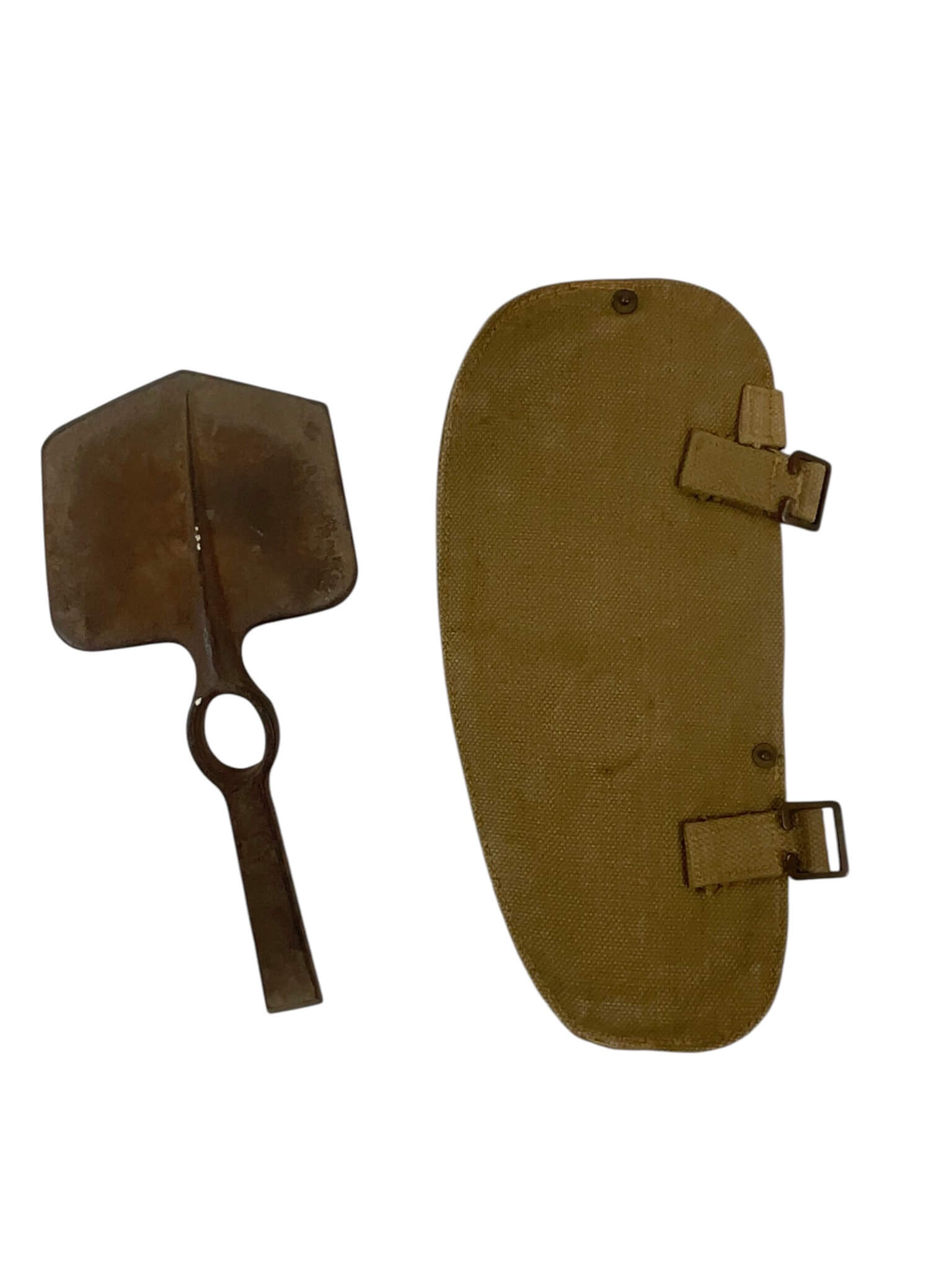 The WW2 British E-Tool With Carrier Dated 1940 is an original entrenching tool issued to British forces during the Second World War. This set consists of a steel folding spade and its corresponding canvas carrier. The tool features a robust, riveted construction with a folding blade designed for versatility in digging, trenching, and other field tasks. The handle is typically composed of hardwood, providing durability for extended field use. Markings on both the tool and carrier confirm the production date of 1940, aligning with early wartime manufacturing. The carrier is constructed from heavy-duty webbing with metal fittings for attachment to standard issue equipment belts or backpacks. Such E-Tools were standard kit for British infantry and played a vital role in field fortification and personal defense tasks. This example shows typical wear consistent with service, reflecting its original period use. The set is a representative artifact of British military equipment from the early years of World War II.