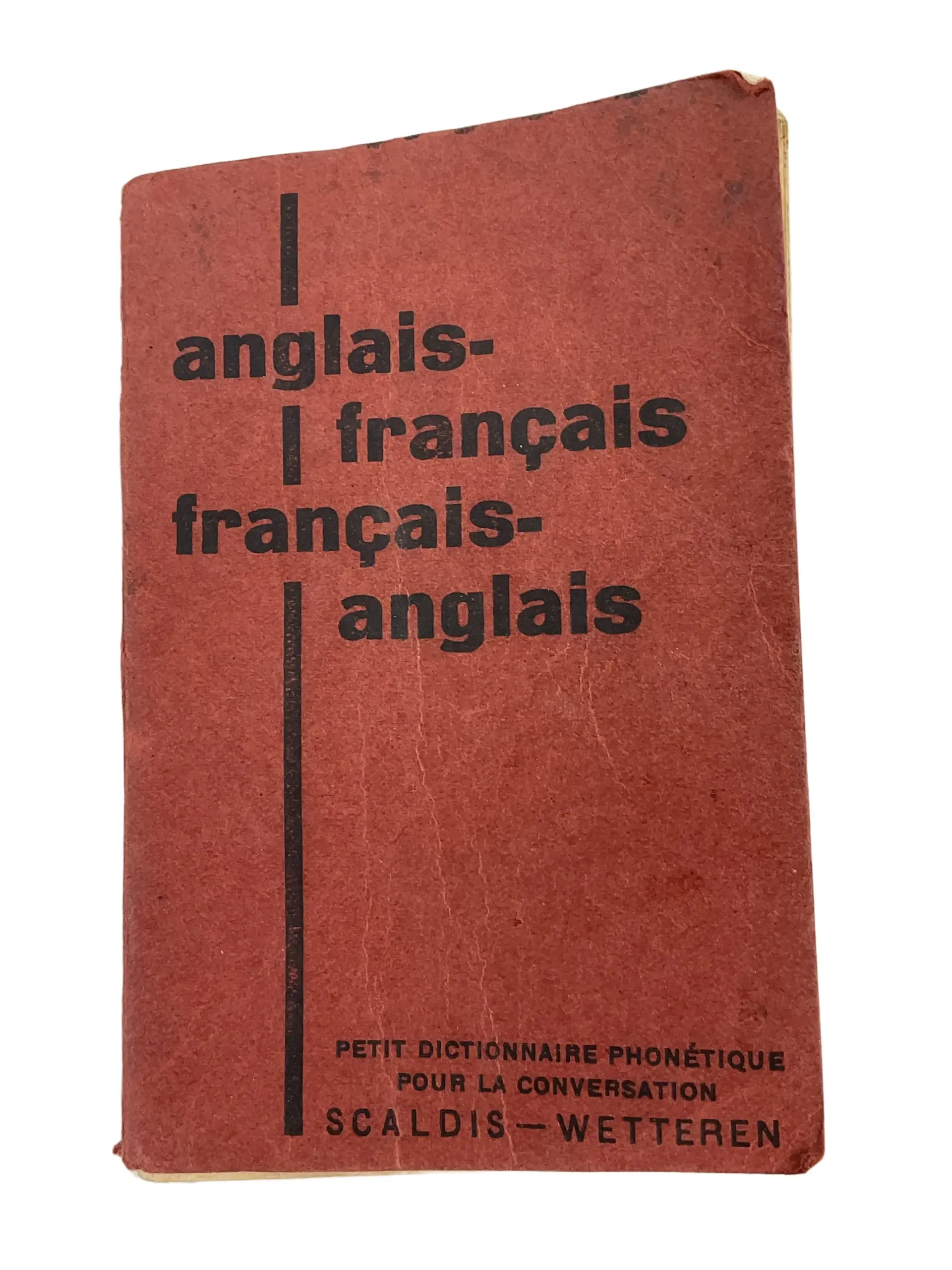 WW2 British English-French Dictionary Used Softcover Reference Book is an original linguistic aid produced for British military personnel during the Second World War. Designed to facilitate communication between English- and French-speaking forces, this compact softcover volume provides practical translations, pronunciation guides, and commonly used phrases relevant to wartime scenarios. The layout prioritizes clarity and ease of use, making it suitable for quick reference in field conditions. The dictionary reflects the vocabulary and context of the era, with emphasis on military terminology, logistics, basic conversation, and commands. Signs of age and use are consistent with a period-issued item, and the softcover format allowed for portability among service members. It serves both as a functional reference and as a historical artifact, illustrating measures taken to overcome language barriers during military operations. This item is of interest to collectors of military history, educational researchers, and those examining wartime communication strategies.