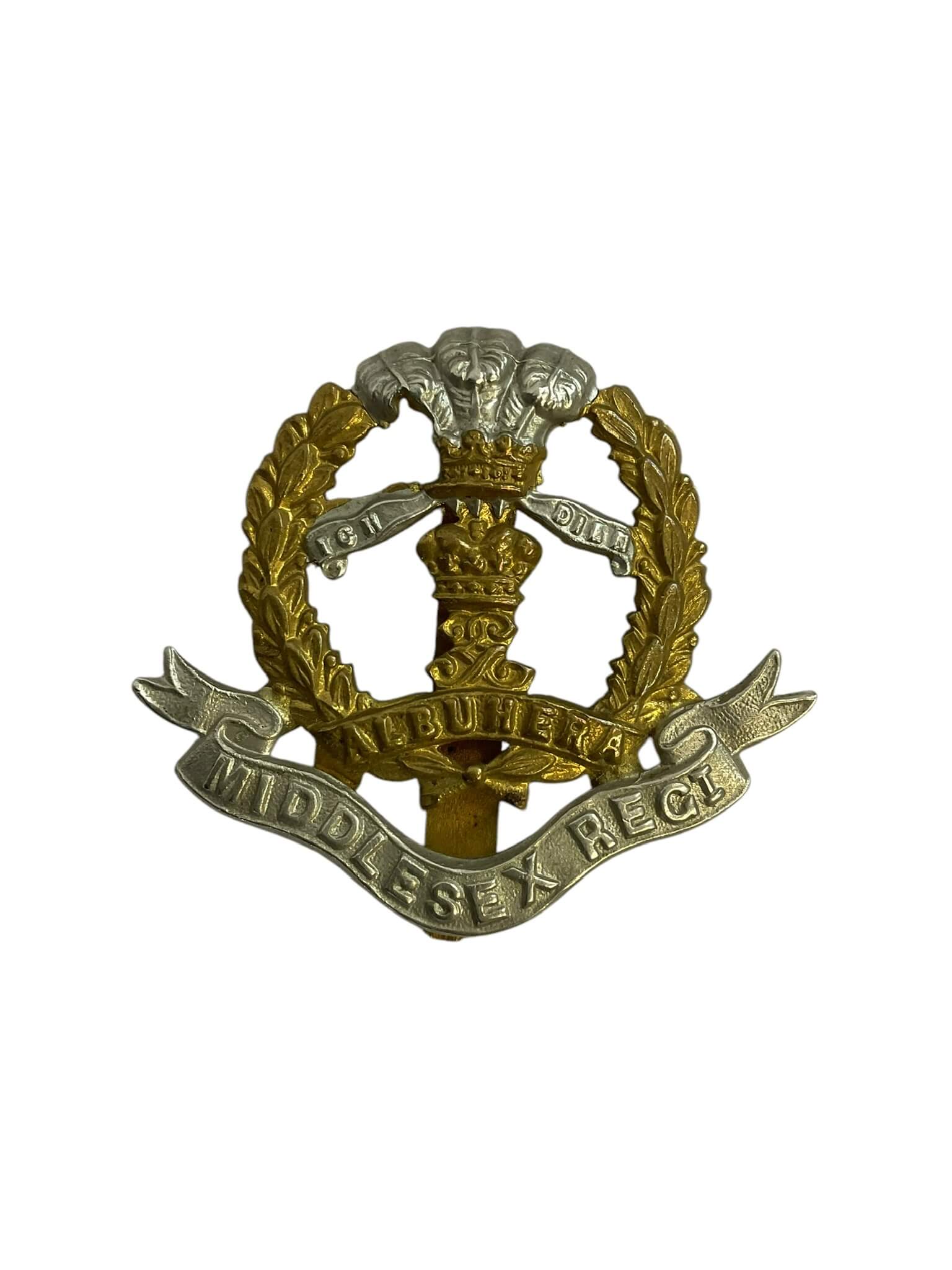 The ‘WW2 British Middlesex Regiment Cap Badge’ is a distinctive emblem of British military history. This insignia was worn by soldiers of the Middlesex Regiment during the World War II era, signifying their affiliation and dedication to this esteemed unit. The badge features intricate detailing, often fashioned from brass or other durable metals. The design typically includes the Royal Crown, symbolising loyalty to the monarchy, along with the regiment’s name and a depiction of the Middlesex Seaxes, a pair of 5th-century Saxon short swords, representing the regiment’s historical roots. This cap badge not only served as an identification marker during the war, but is now a valuable collectible, treasured for its historical significance and craftsmanship. Its possession offers a tangible connection to the courage, resilience and unity of the soldiers who served in one of the most renowned regiments of the British Army.