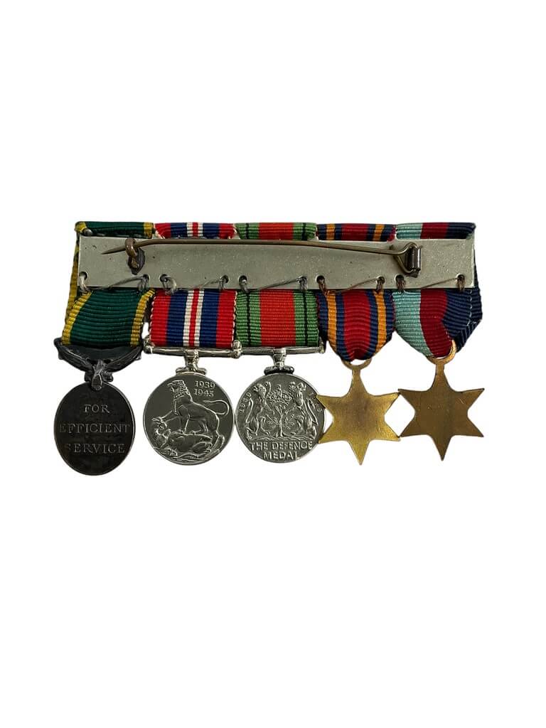 This collection features five WWII British Miniature Medals including the prestigious Efficiency Medal. Each piece represents a historical moment from the Second World War, capturing the bravery and commitment of the individuals who served. The Efficiency Medal holds special significance, awarded to members of the Territorial Army for long and efficient service. The medals are miniature, making them perfect for display or collection, without taking excessive space. Each medal is made with exquisite craftsmanship, showcasing intricate details that add to their historical authenticity. They are not only items of military memorabilia but also pieces of art that symbolize valor and dedication. This collection is a testimony to the sacrifices of the British forces during WWII and would make a perfect addition to any military collectibles or history enthusiast’s collection.