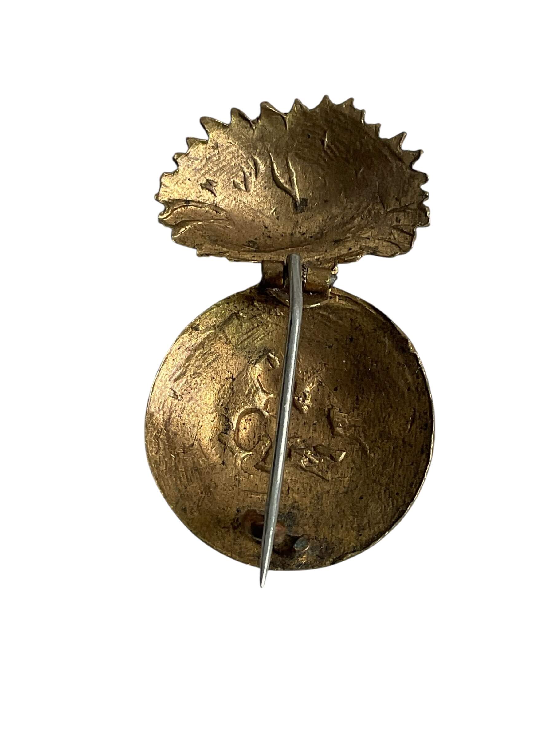 The WW2 British Northumberland Fusiliers Sweetheart Badge is a piece of commemorative jewelry produced during the Second World War. Such badges were typically given by servicemen to loved ones as tokens of affection and symbols of military service. This specific badge features the emblem of the Northumberland Fusiliers, a British Army regiment with a distinguished history. The design commonly incorporates elements associated with the regiment, such as the flaming grenade insignia and regimental motto or initials. Constructed from base metal with enamel detailing, sweetheart badges varied in size and manufacturing style, and were often worn on civilian clothing, particularly by women. These personal items reflected the connection between service members and their families during wartime. Today, WW2 sweetheart badges serve as tangible reminders of home front morale and regimental identity, and are collected for their historical significance and association with individual military units.
